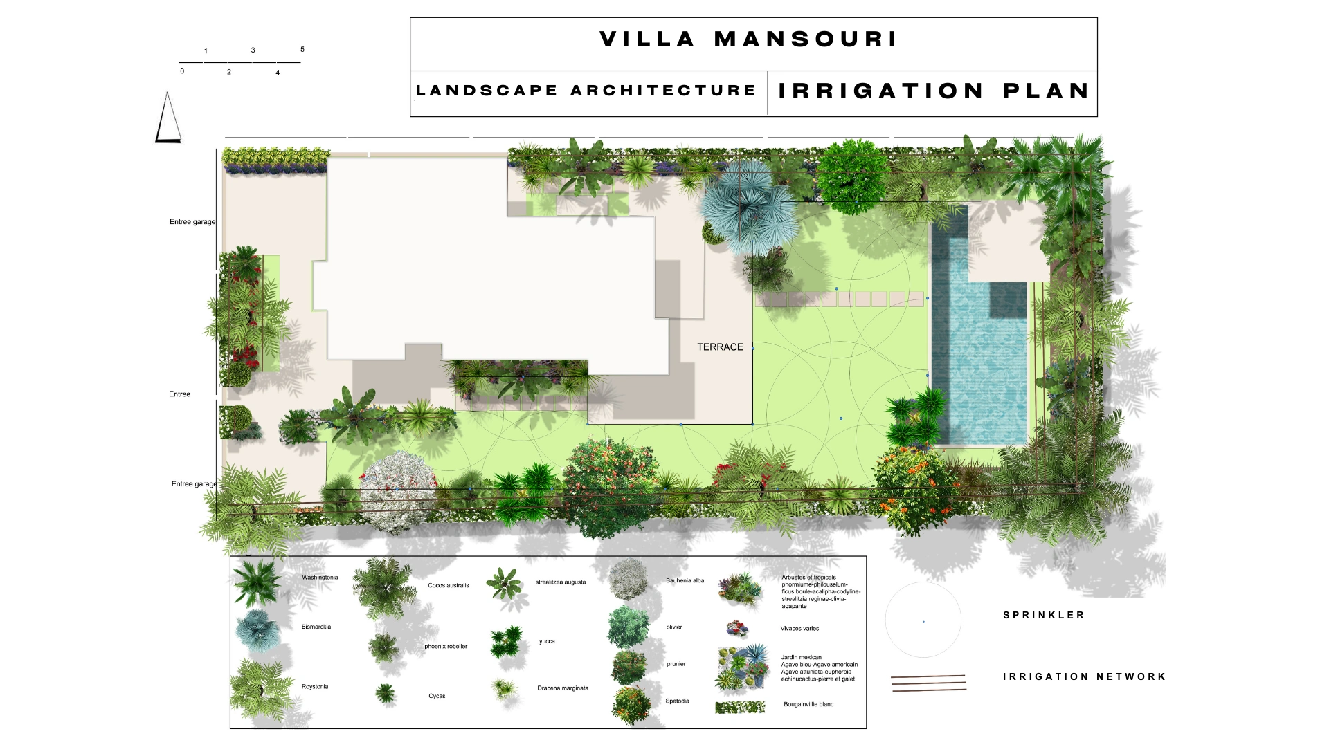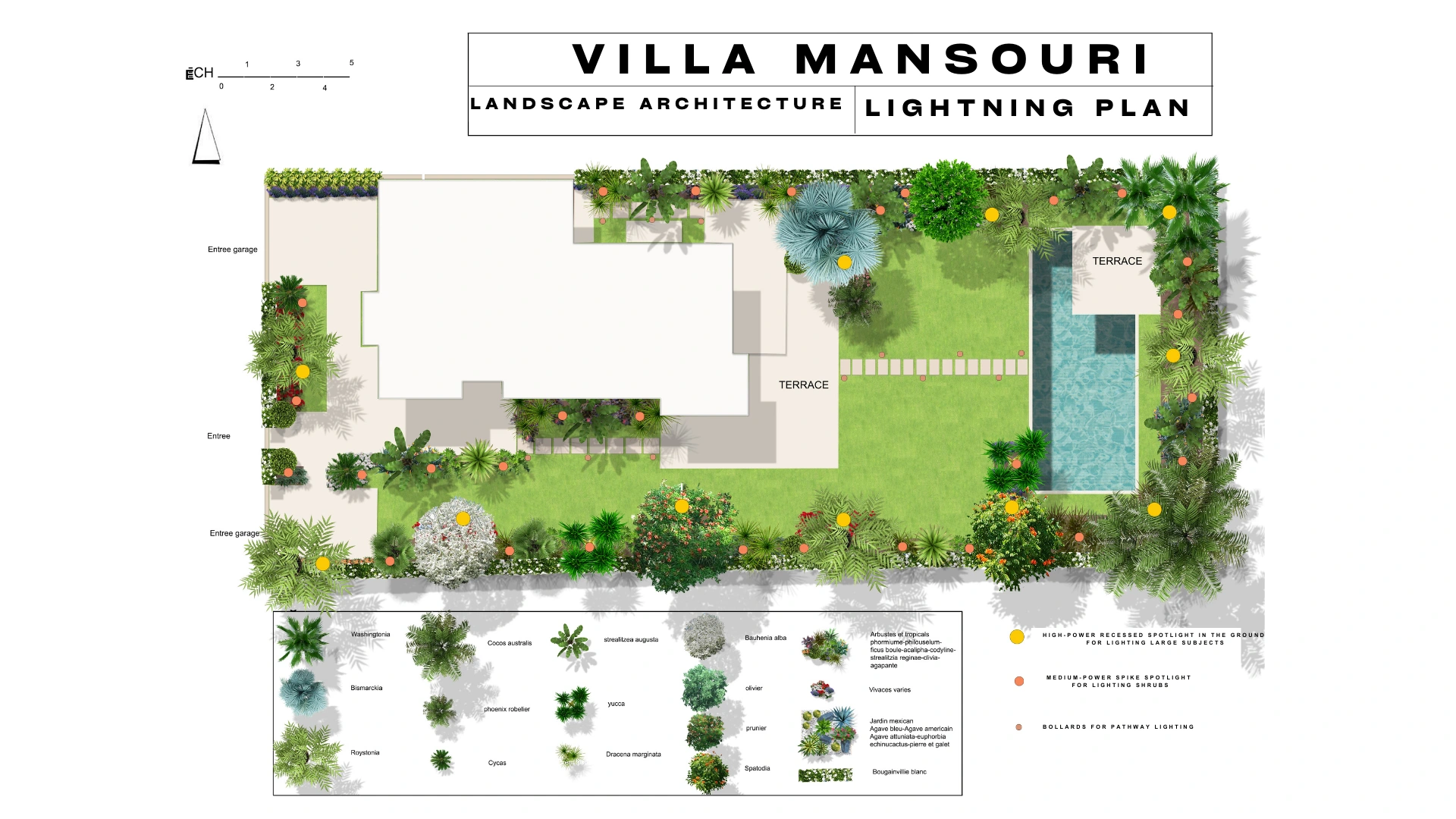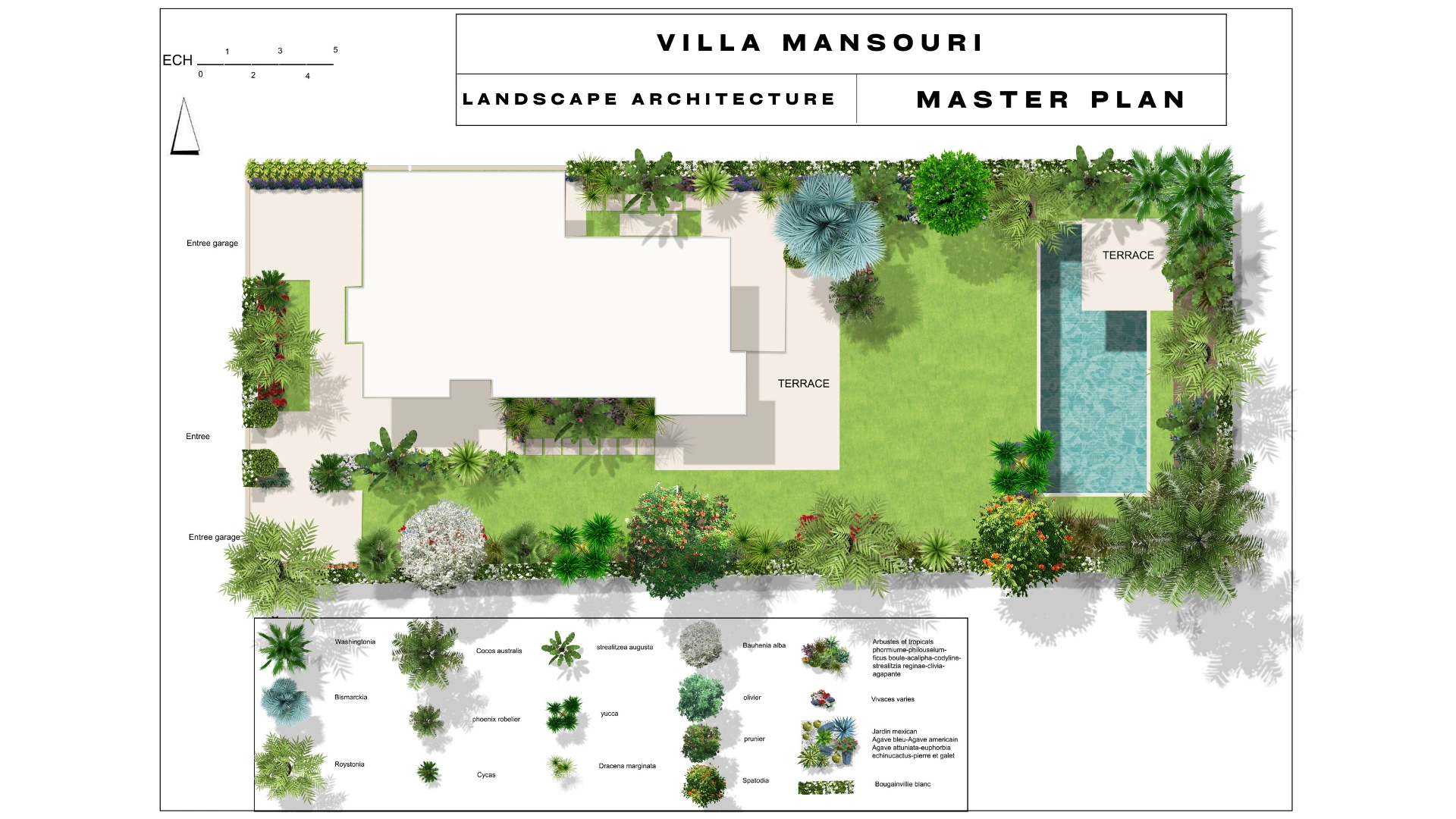 General Layout The plan represents a residential landscape design for a private villa, with well-defined zones for access, relaxation, and visual interest. The villa structure is centrally placed, with terraces on the east and southeast sides, offering multiple outdoor lounging/dining areas.