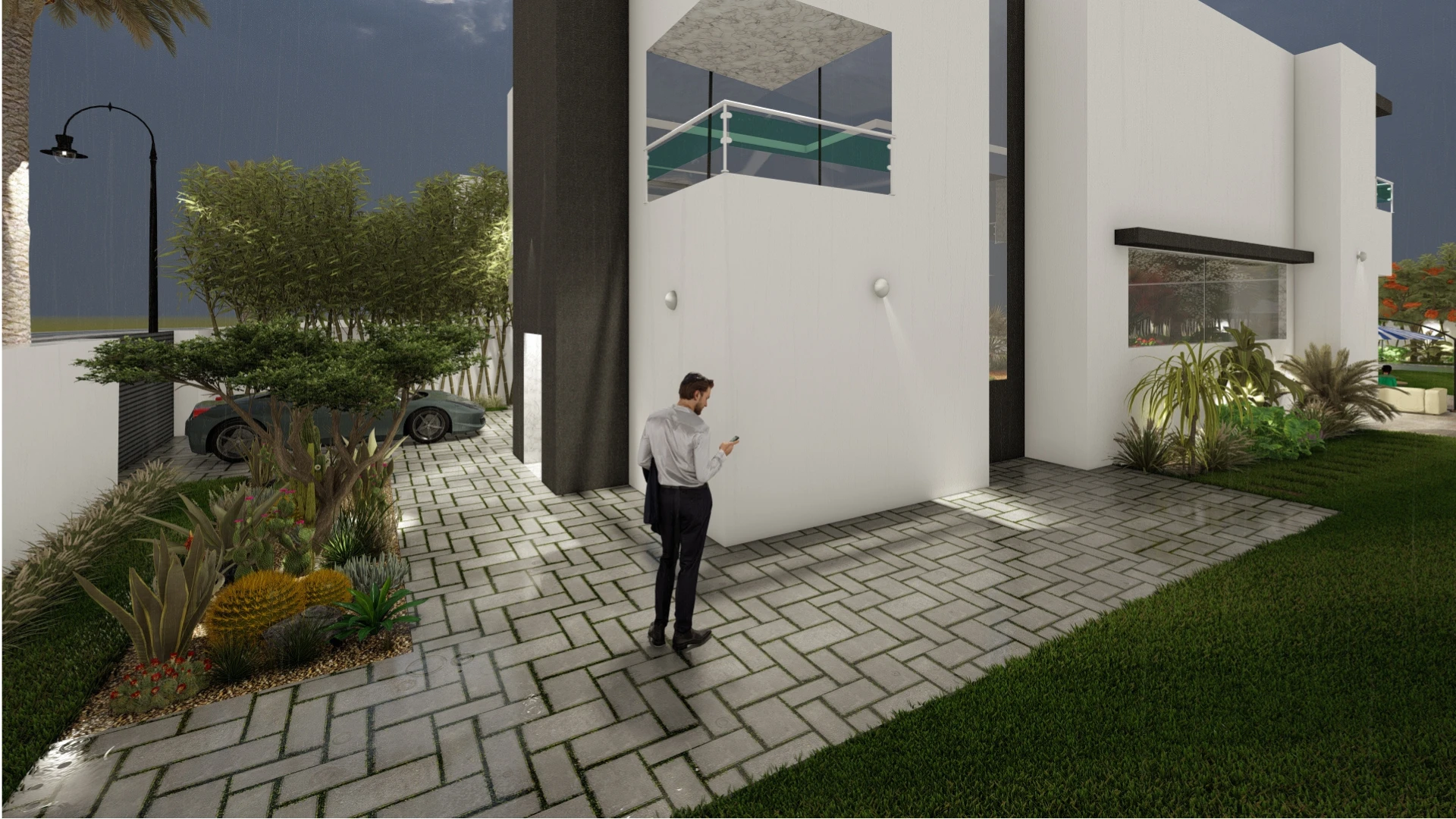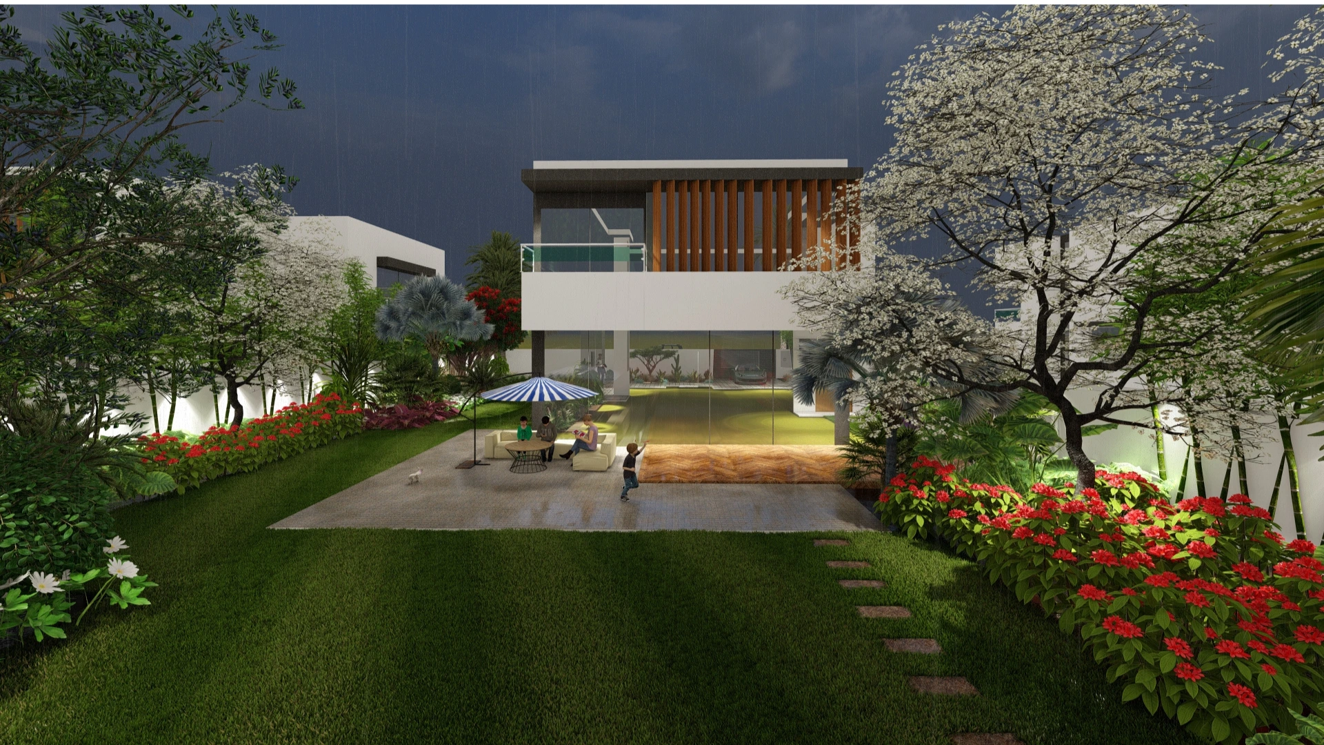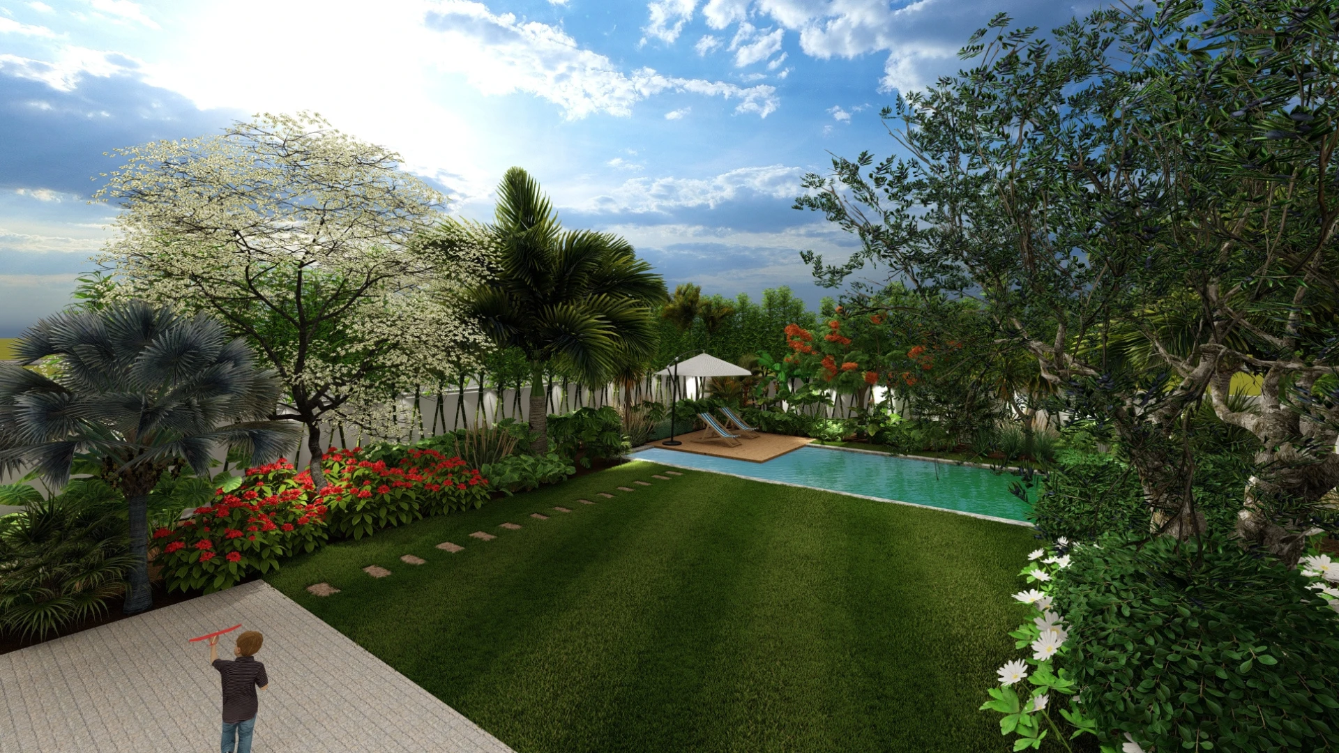 General Layout The plan represents a residential landscape design for a private villa, with well-defined zones for access, relaxation, and visual interest. The villa structure is centrally placed, with terraces on the east and southeast sides, offering multiple outdoor lounging/dining areas.