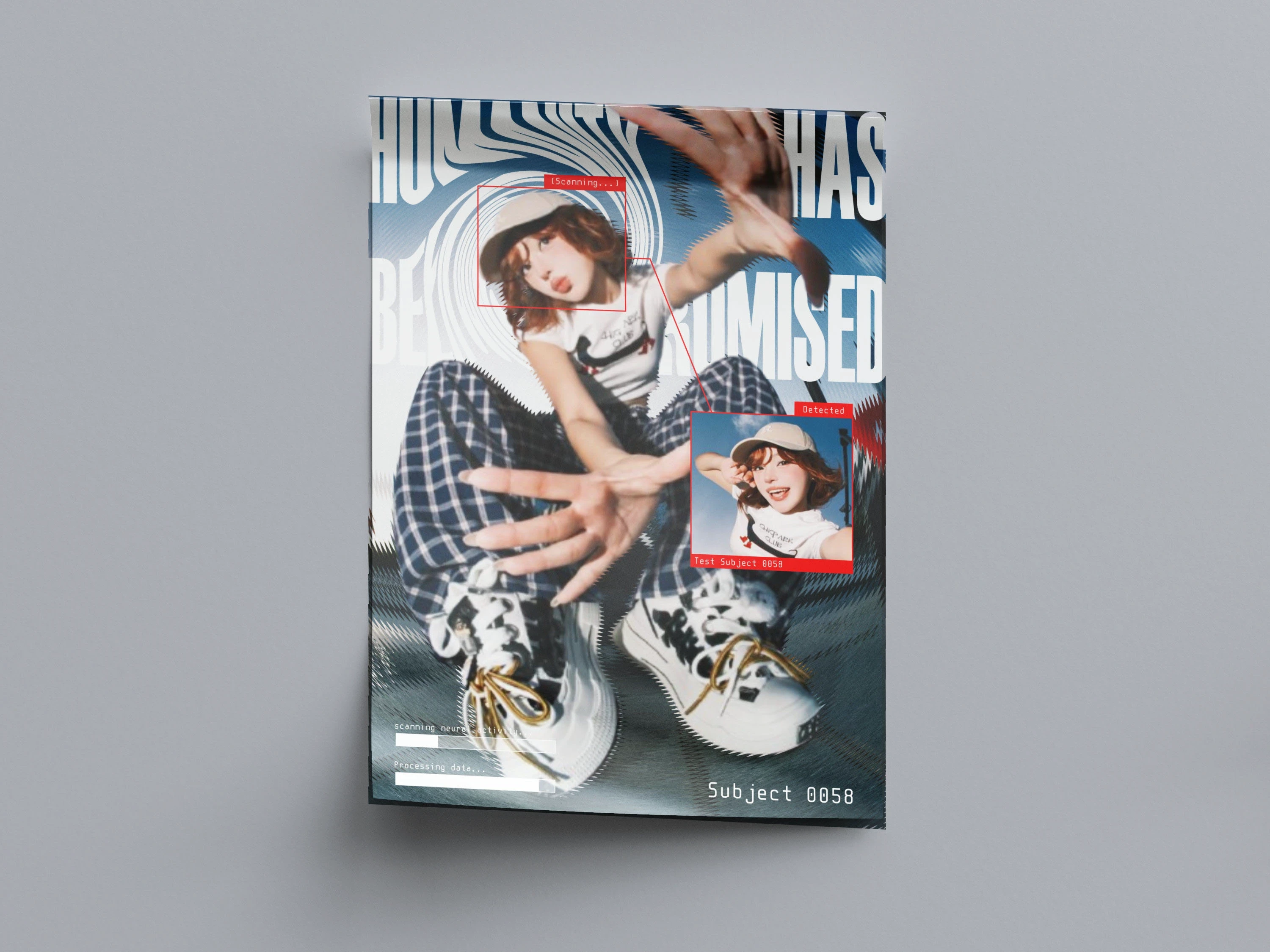 "Subject 0058" is a conceptual poster exploring digital identity and the paradox of surveillance in the modern age.