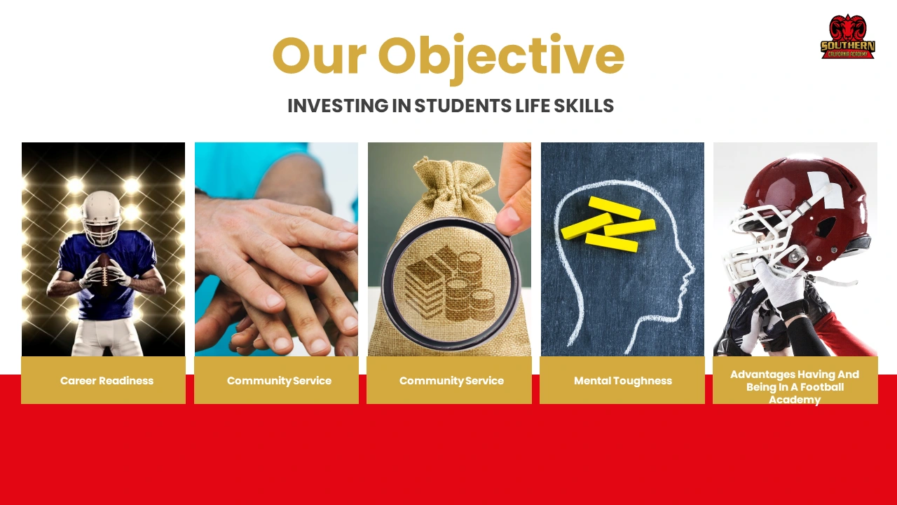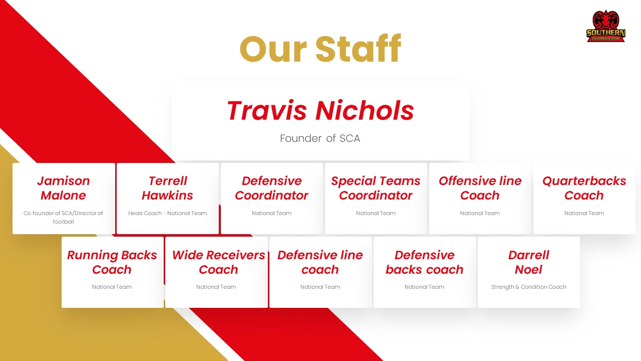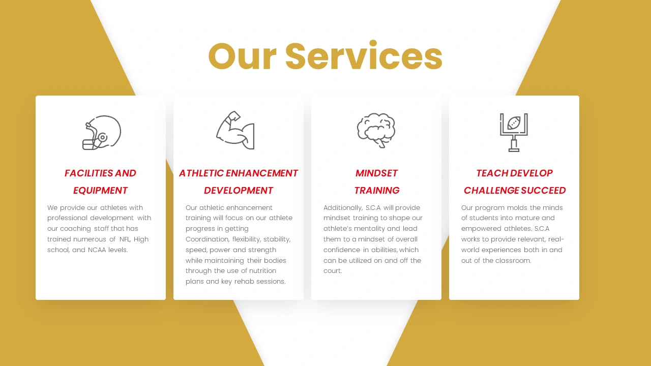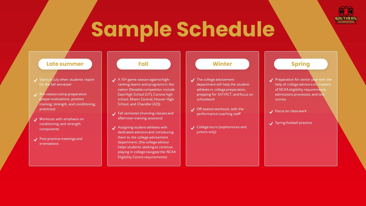 The final pitch deck was crafted with a clean, modern layout and strong visual hierarchy, making it suitable for presentations to investors, partners, parents, and recruits. The design ensures complex information is easy to understand while reinforcing Southern California Academy’s brand as a high-performance, elite athletic institution.