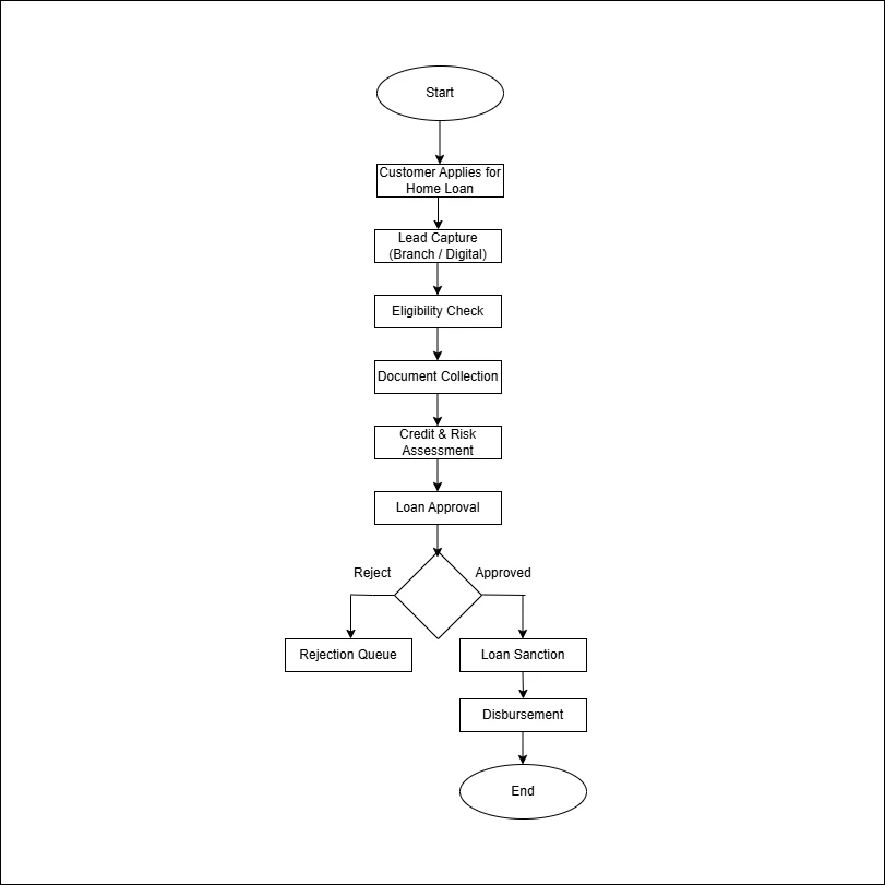 Analyzed and designed the end-to-end home loan journey, covering eligibility, credit assessment, approval, rejection handling, and disbursement workflows.