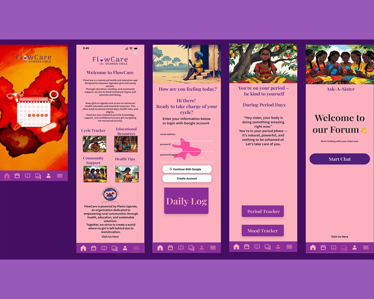 FlowCare is a mobile wellness app developed for teenage girls in rural Ugandan communities, in partnership with the NGO Plavio.