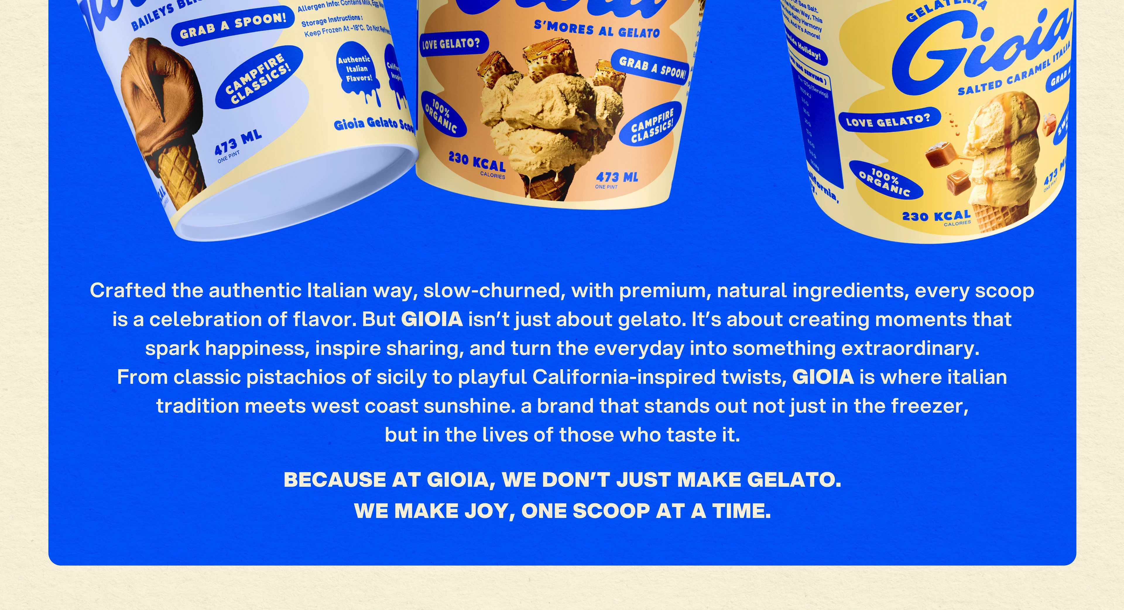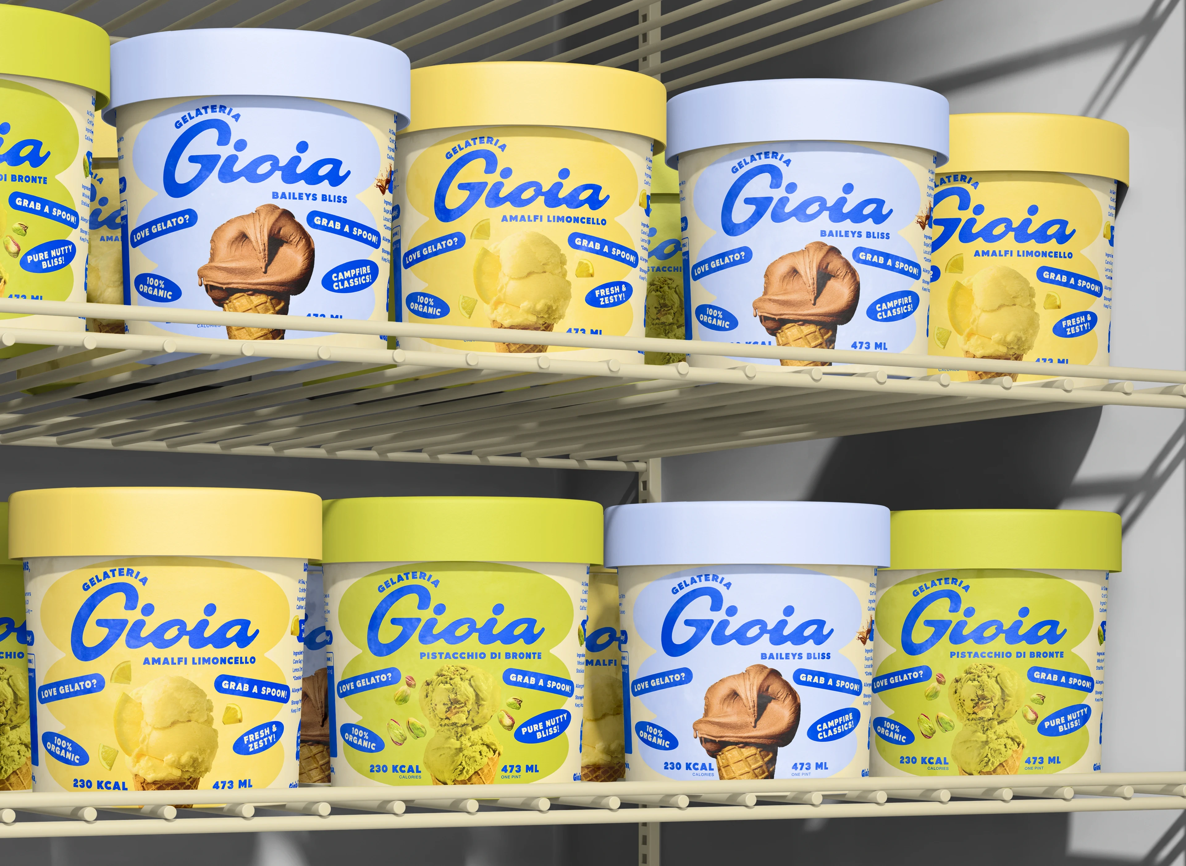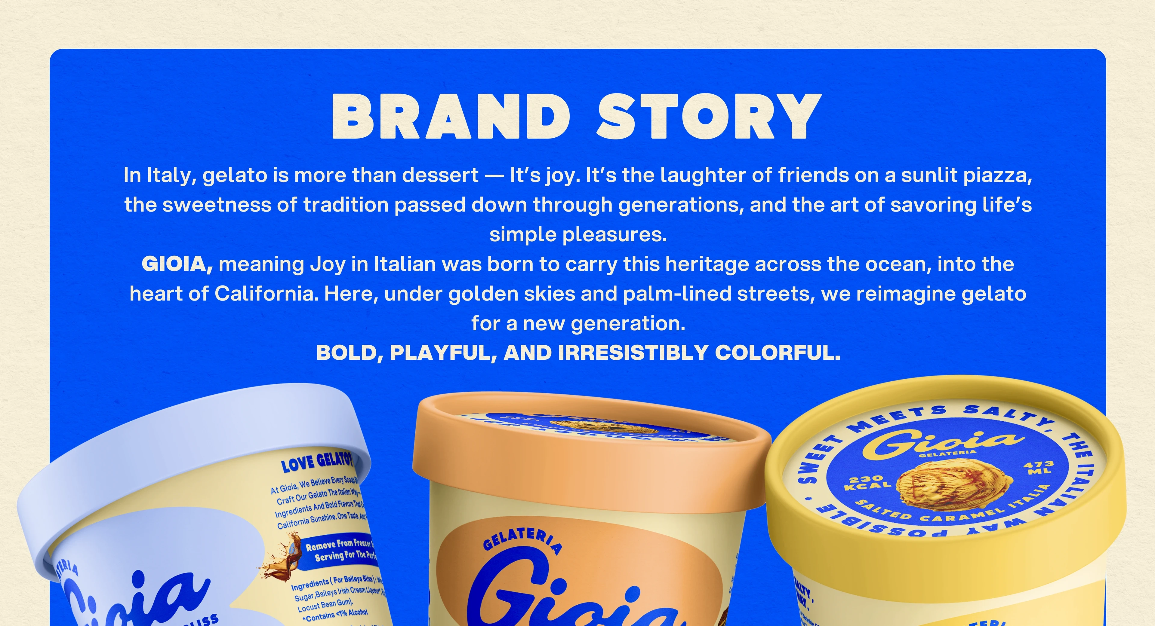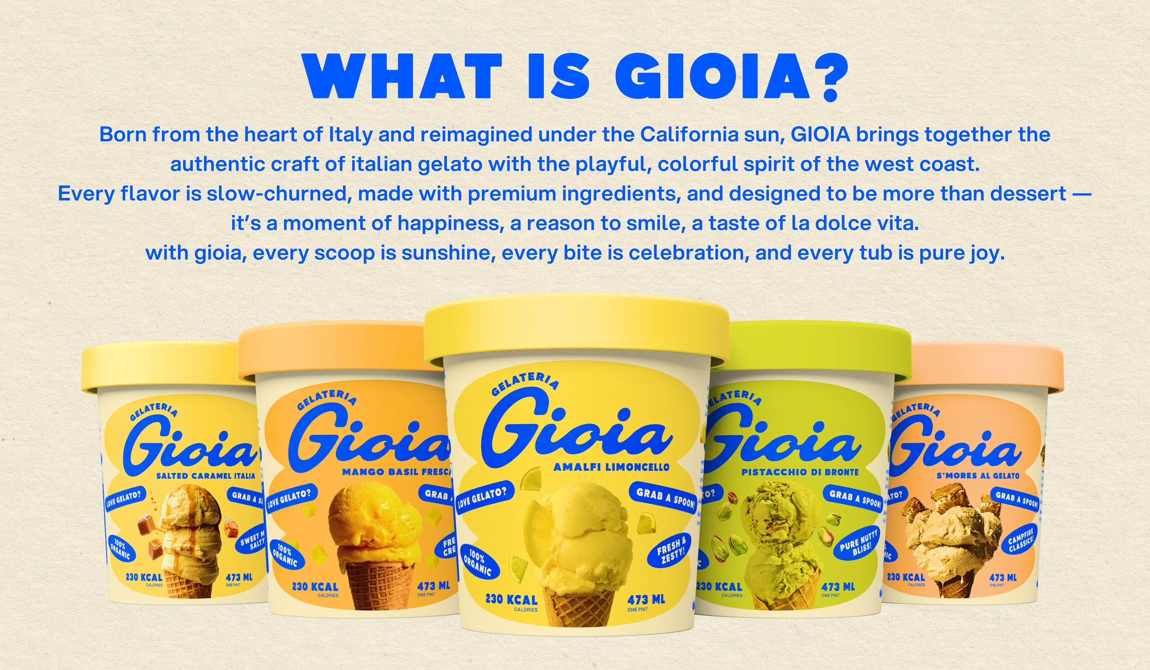 Gioia brings together the authentic craft of Italian gelato. With Gioia, every scoop is sunshine, every bite is celebration, and every tub is pure joy.