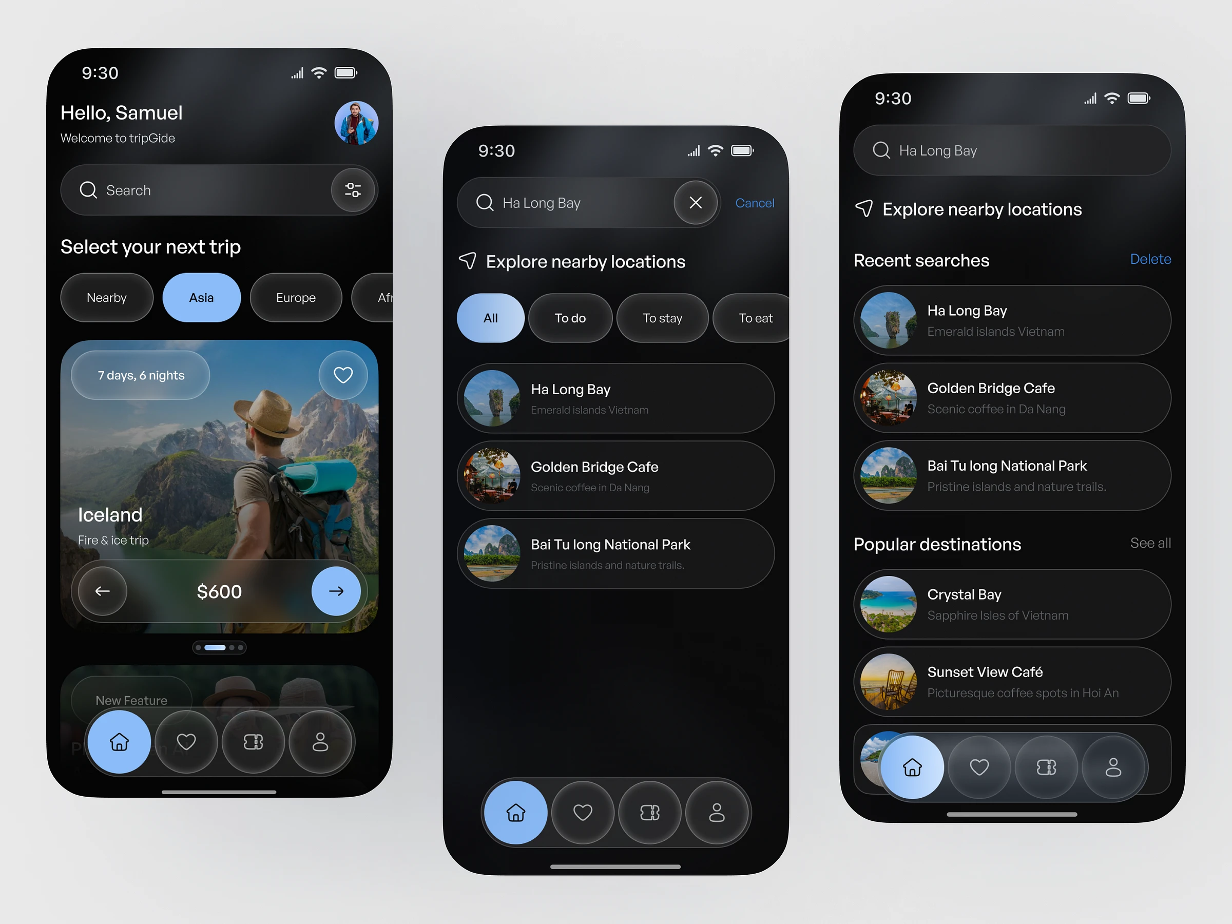 A sleek travel guide and tour booking app UI crafted for modern explorers. Designed with intuitive navigation, location-based discovery, and personalized travel suggestions to simplify trip planning and elevate the travel experience.