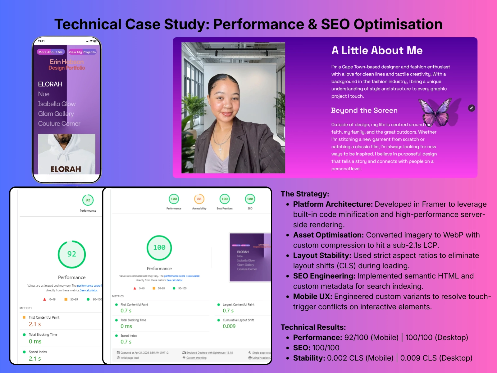 A high-performance interactive portfolio engineered in Framer. Focused on elite Core Web Vitals, sub-2s load times and zero layout shift for mobile and desktop.