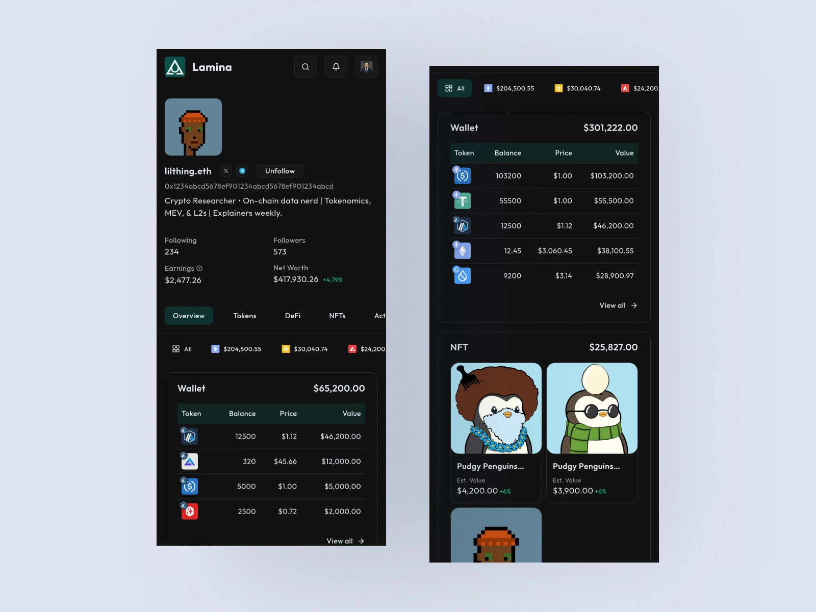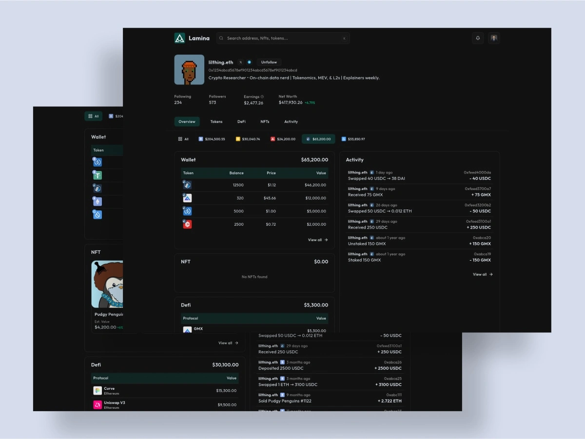 Developed Lamina, a web app for NFT portfolio tracking and visualization.