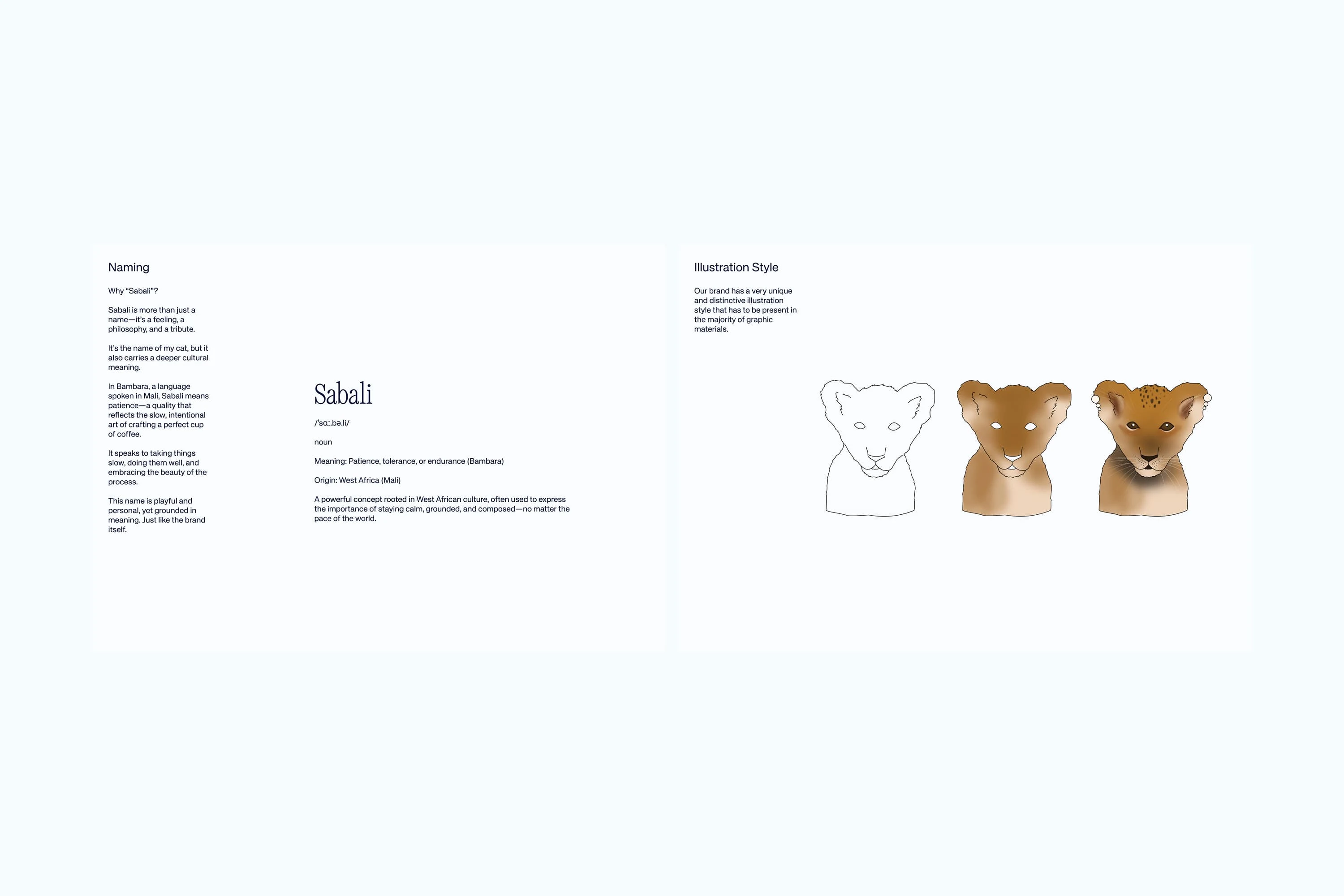 Sabali is a concept brand and design experiment exploring how cultural depth and minimalist aesthetics can shape a purpose-driven coffee identity. Rooted in the West African value of patience, the project blends Bambara symbolism with calm, intentional design—featuring a custom wordmark, a lion mascot, and a serene visual system.