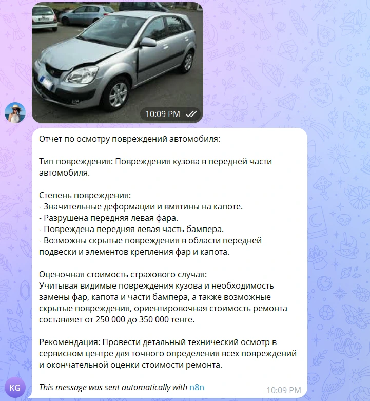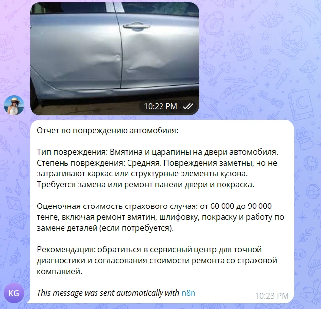 Для демонстрации возможности автоматической оценки повреждений автомобиля и формирования страхового кейса был создан прототип с использованием AI-агента и Telegram-бота. Основная цель – показать работу технологии в реальных условиях без полной интеграции в мобильное приложение и CRM.