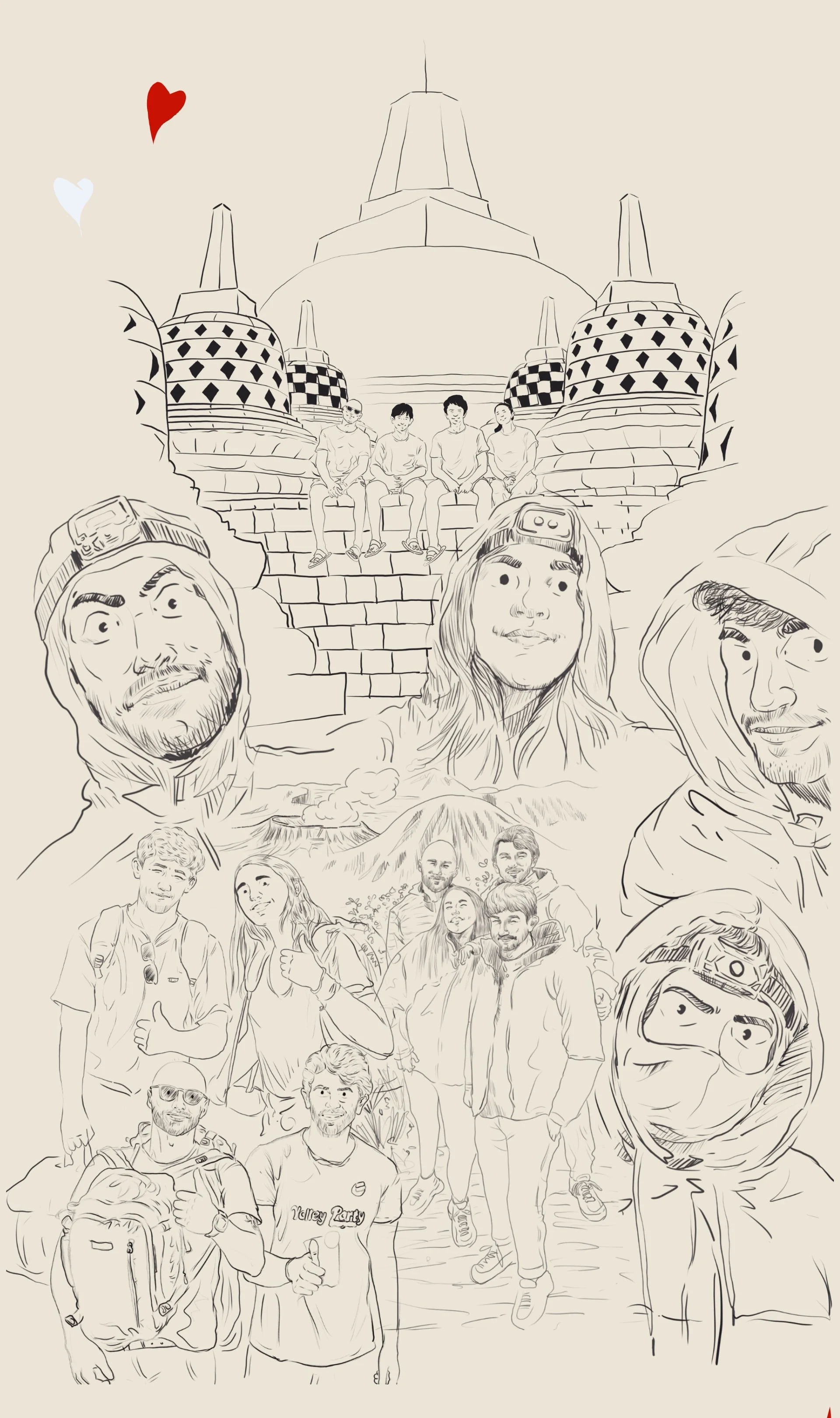 Illustrating a group of italian trips to Indonesia in cartoon style.
