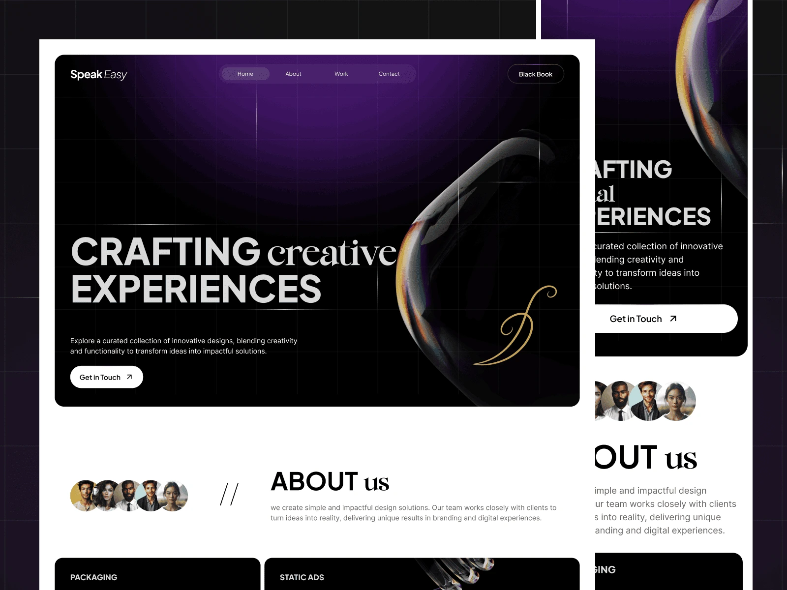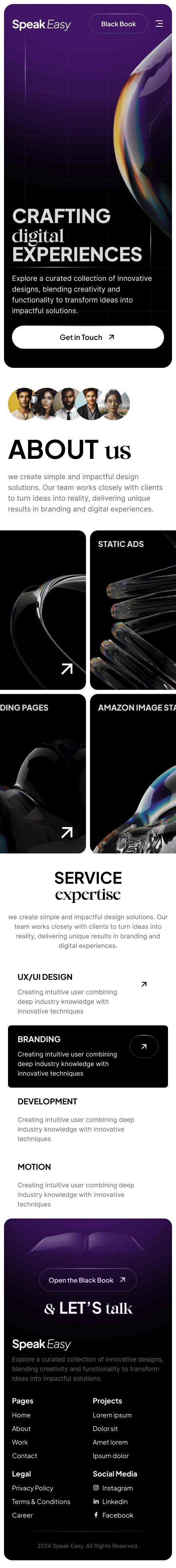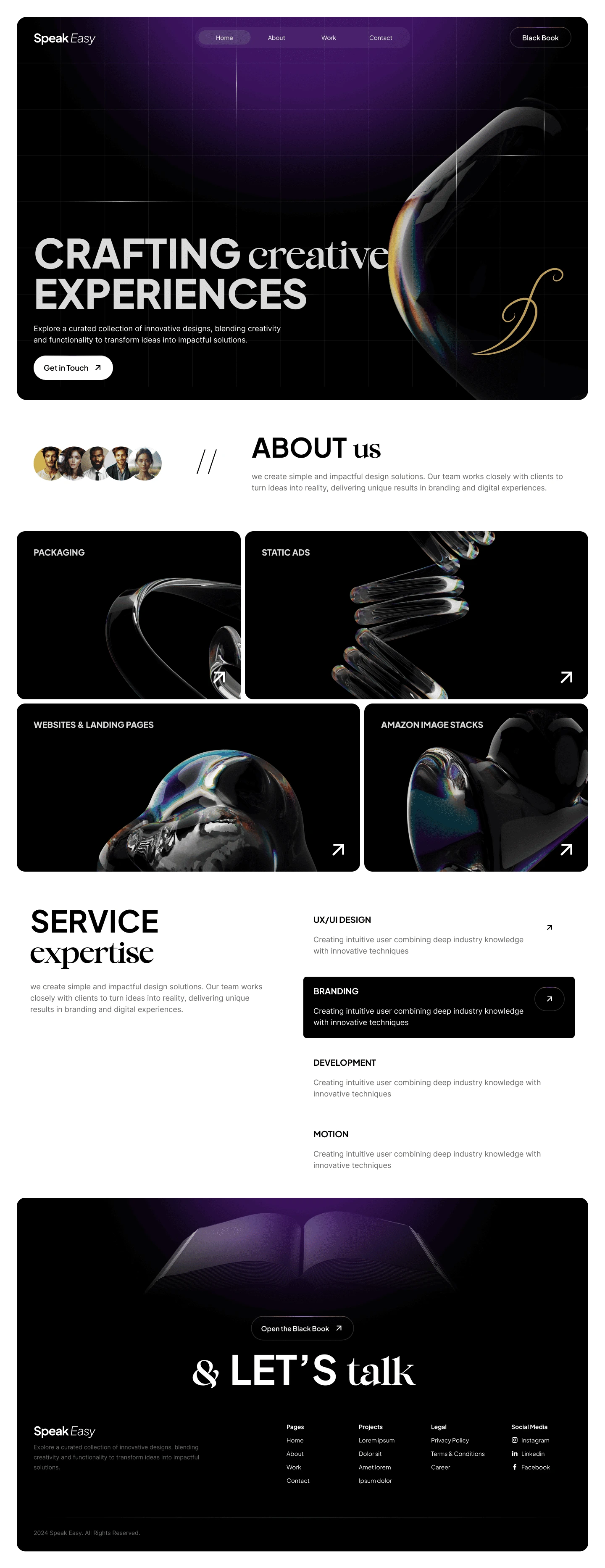 The design combines modern aesthetics, black-on-black elegance, and 3D-inspired visuals to highlight service offerings and expertise in branding, UX and motion