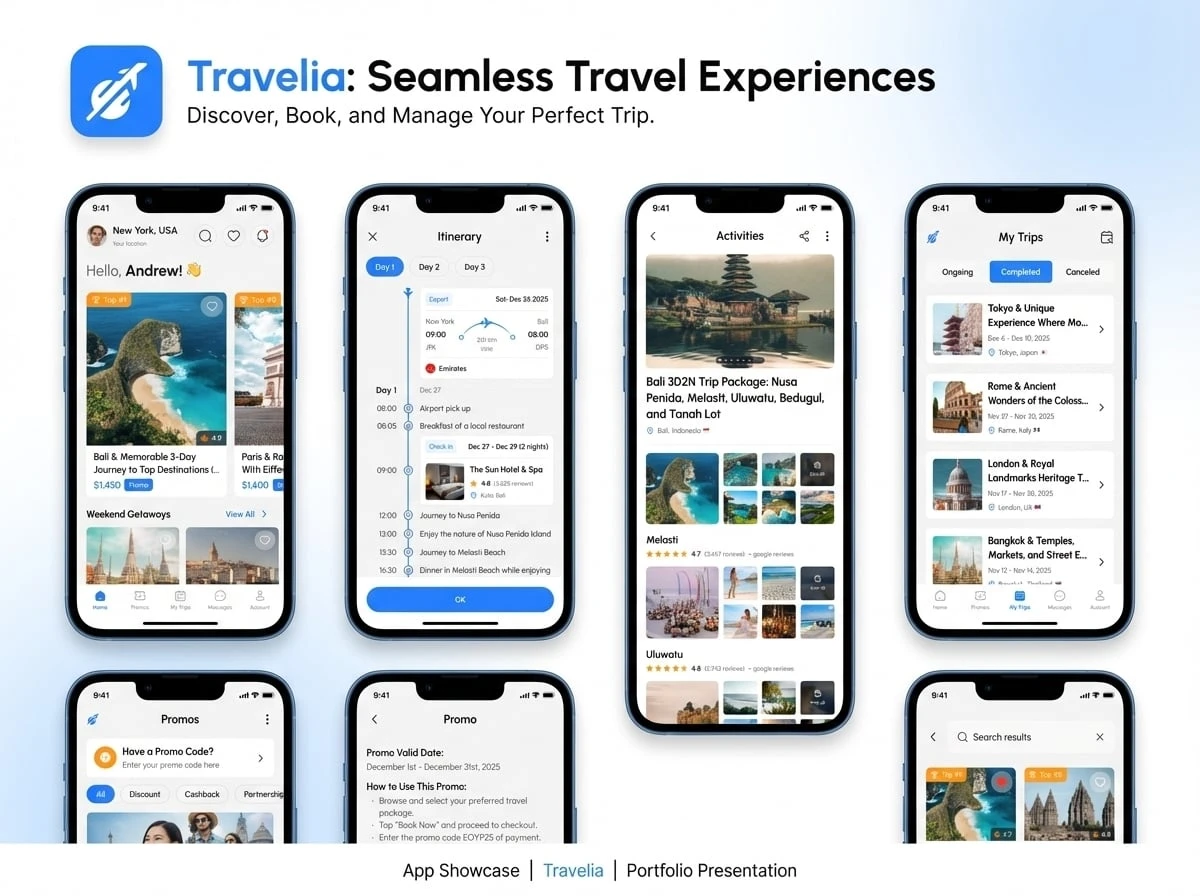 Users can browse popular destinations, view travel details, and organize their trips with ease. The app integrates real-time travel information and location services to help users make better travel decisions.