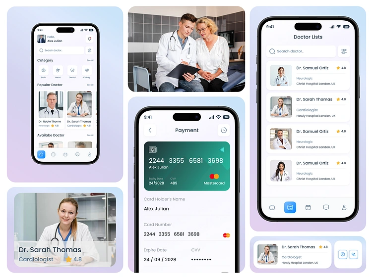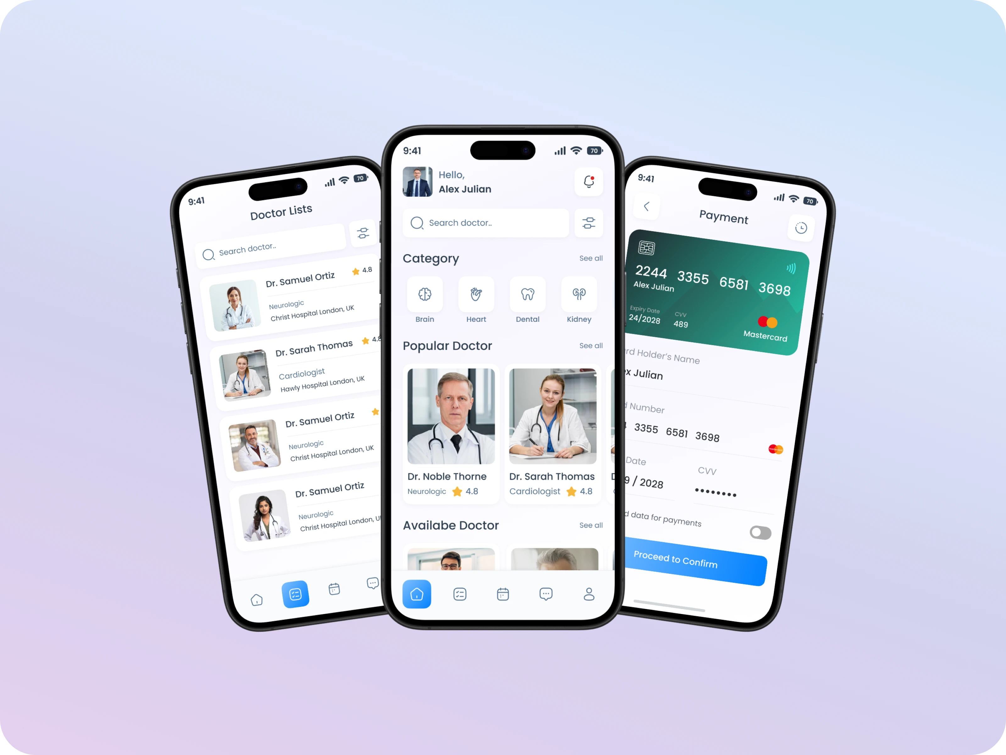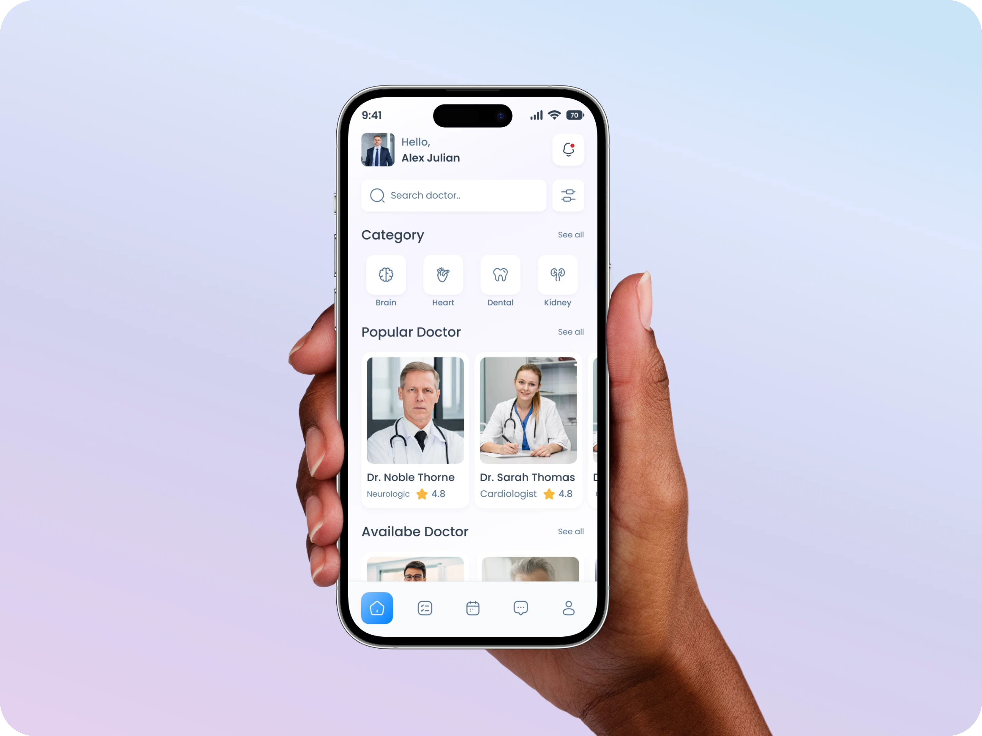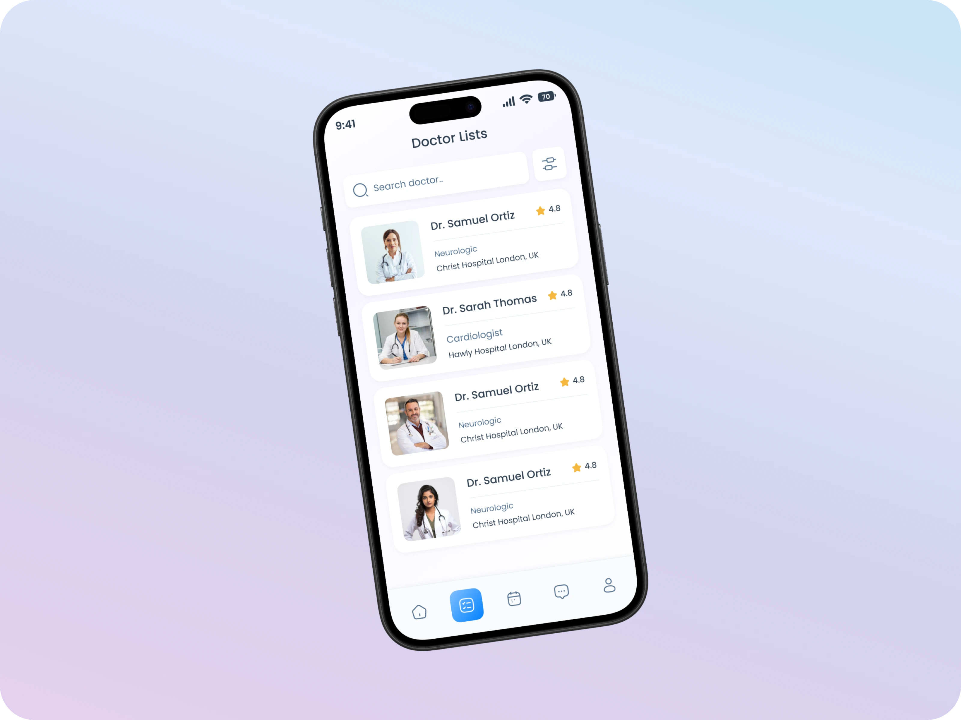 Simple, Smart & Human-CenteredHere’s a fresh concept for a mobile healthcare app designed to make managing your health easier and more intuitive.The focus? Clear navigation, soft visuals, and a seamless experience for both patients and doctors. Whether you're booking an appointment, chatting with a specialist, or checking your medical records—it’s all just a tap away.