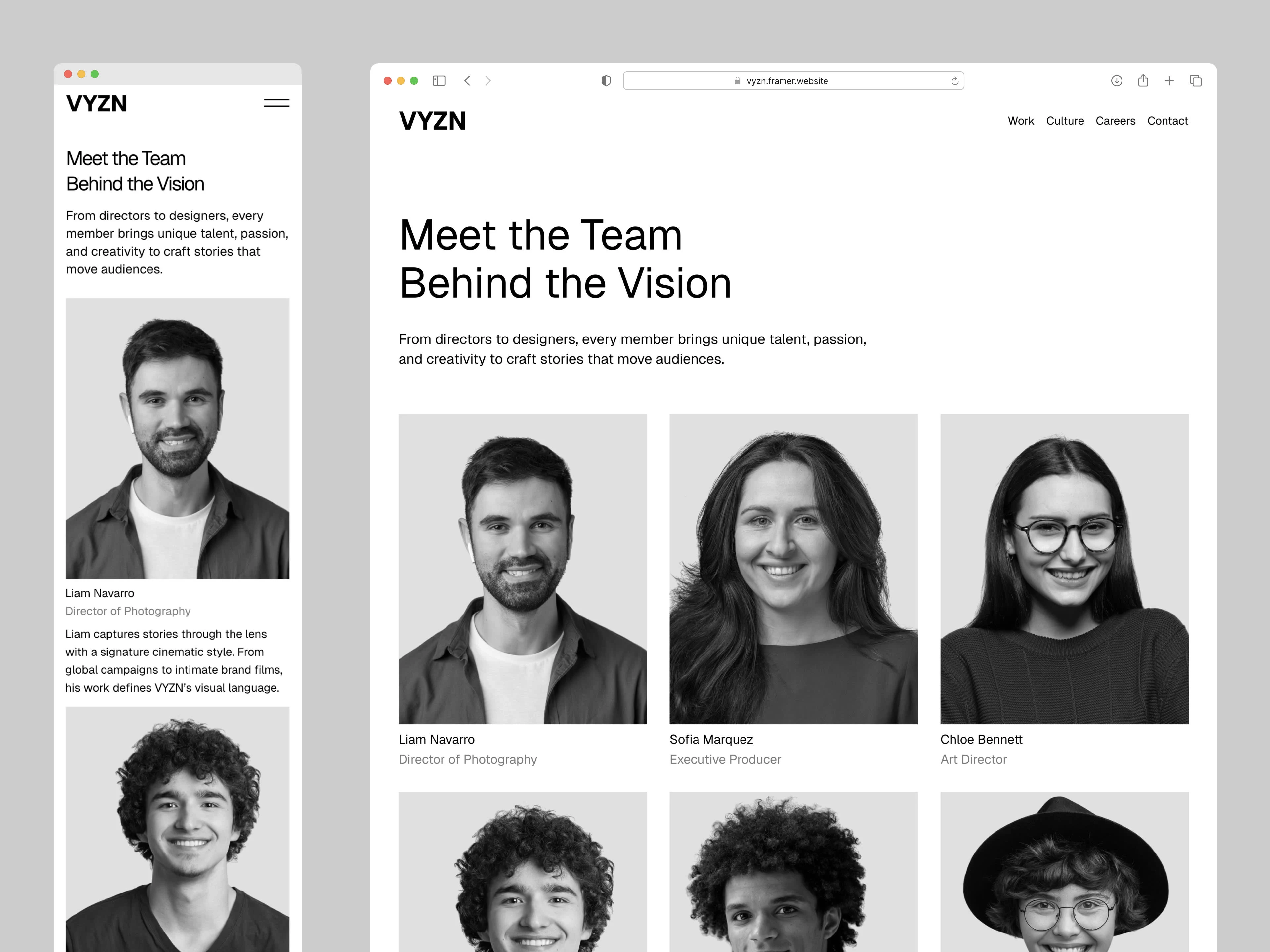 VYZN is a cinematic Framer template built for video production agencies, filmmakers, and creative studios. Showcase your work, team, and story with bold visuals, smooth animations, and layouts designed to turn visitors into clients.