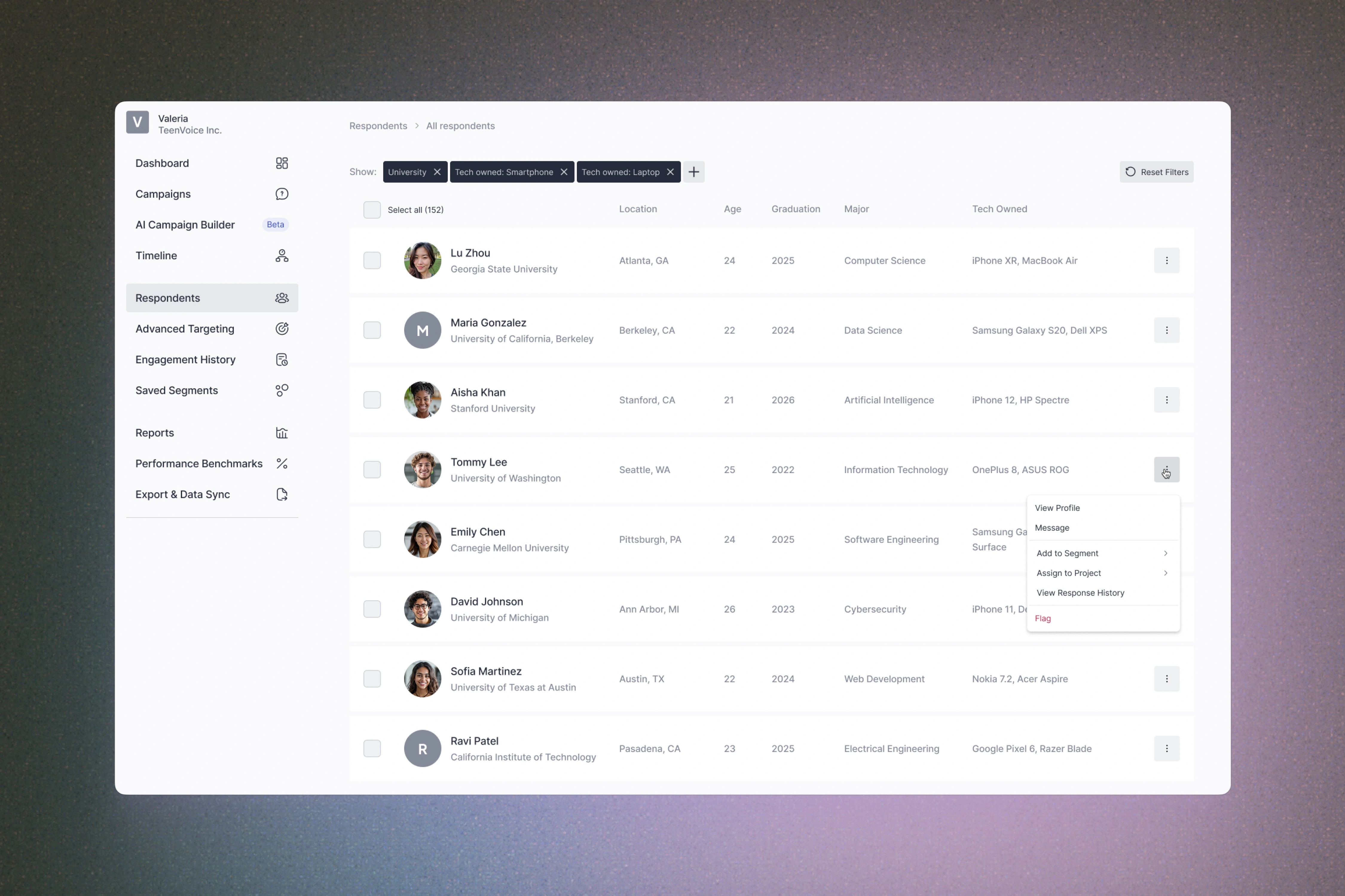 A filterable database of Gen Z respondents. Users can sort by age, device, major, or graduation year, and select participants for campaigns in bulk. Contextual menus allow for messaging, assigning to campaigns, or viewing engagement history.