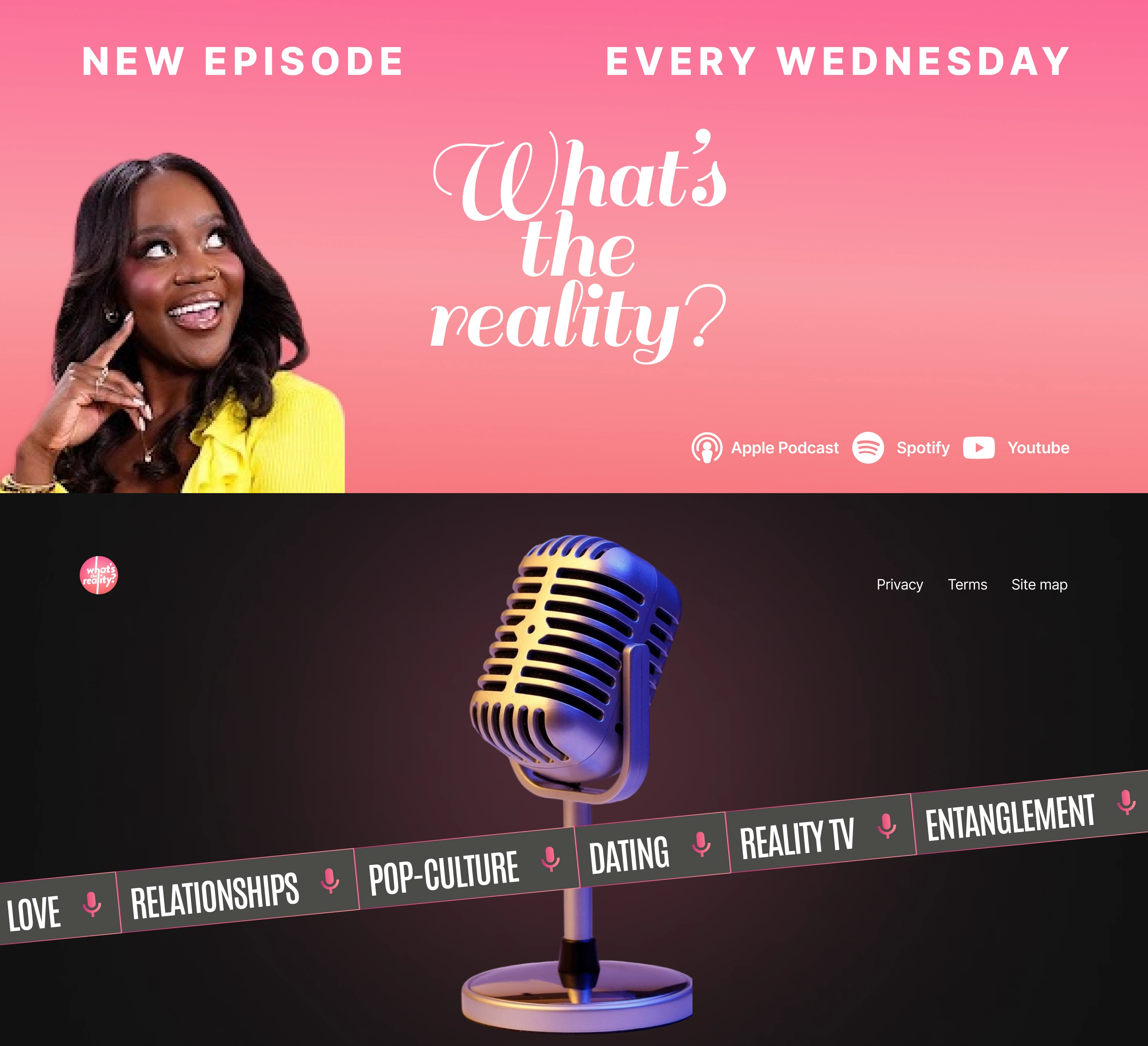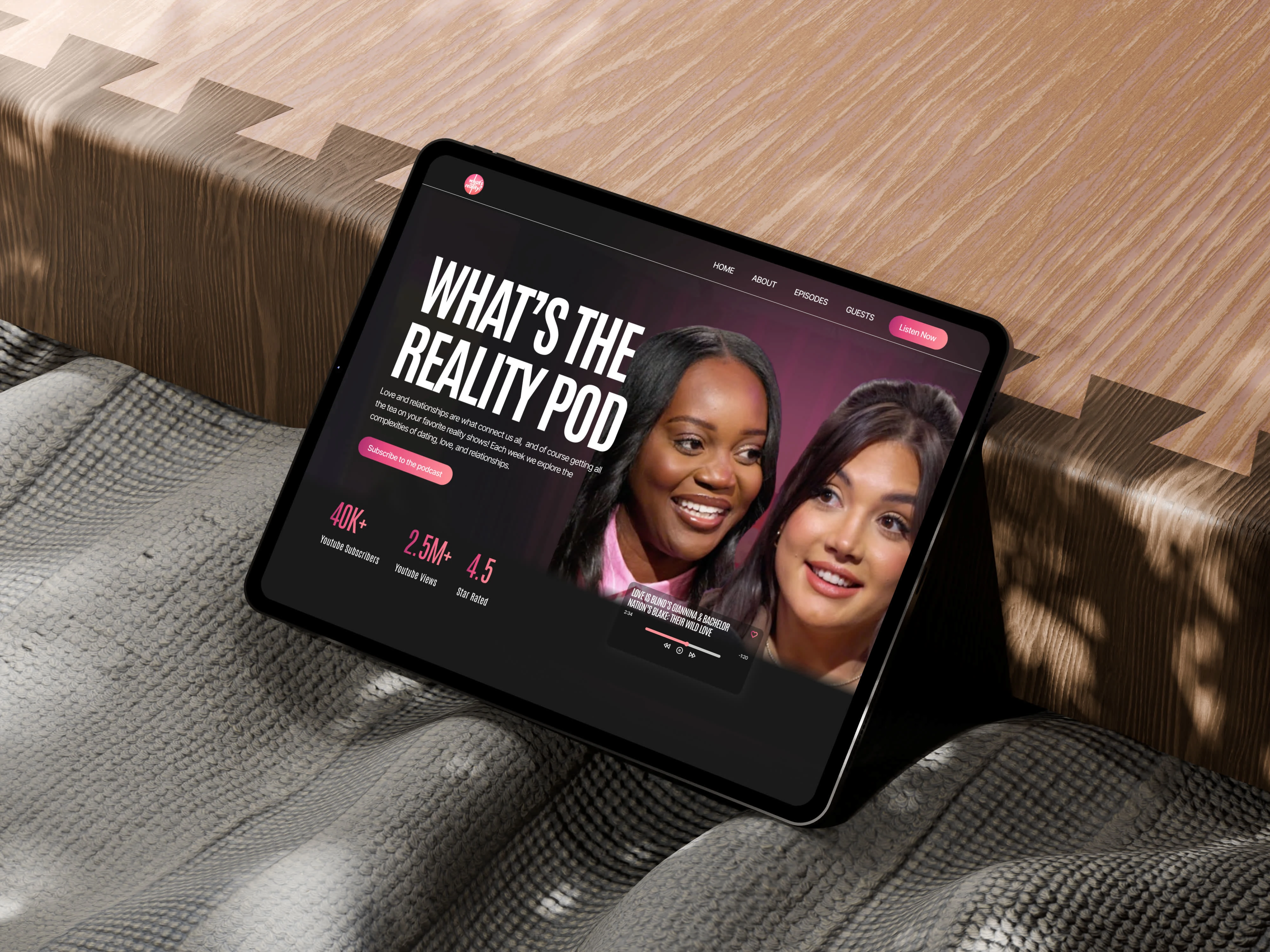 What’s The Reality Podcast dives deep into love, reality TV, and the rollercoaster of real-life emotions in between. It’s raw, expressive, and emotionally charged and the website had to reflect that same energy. This wasn’t just a design project it was about creating a digital experience that feels just as juicy, real, and visually striking as the podcast itself.