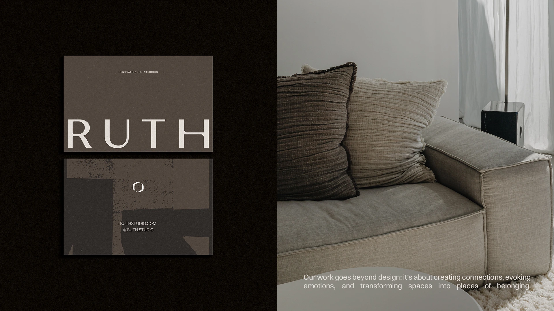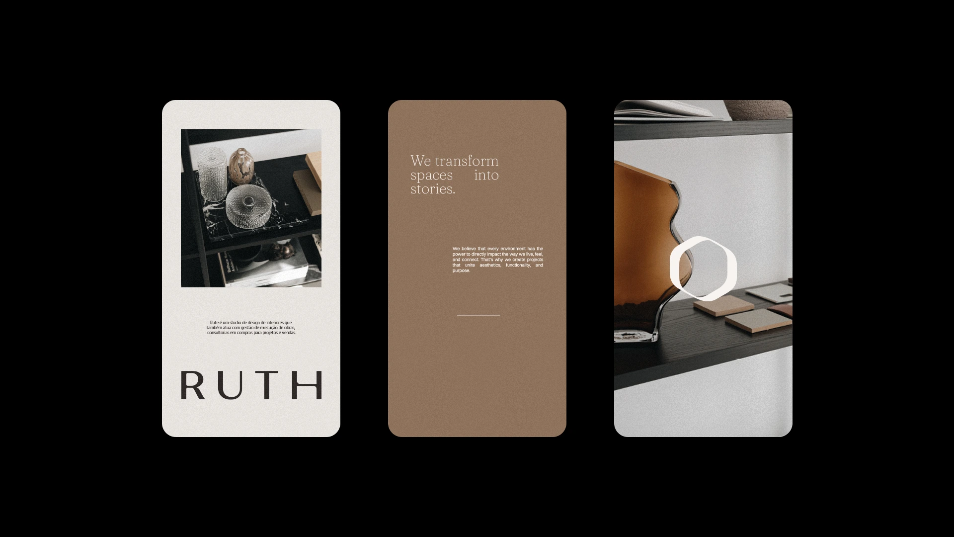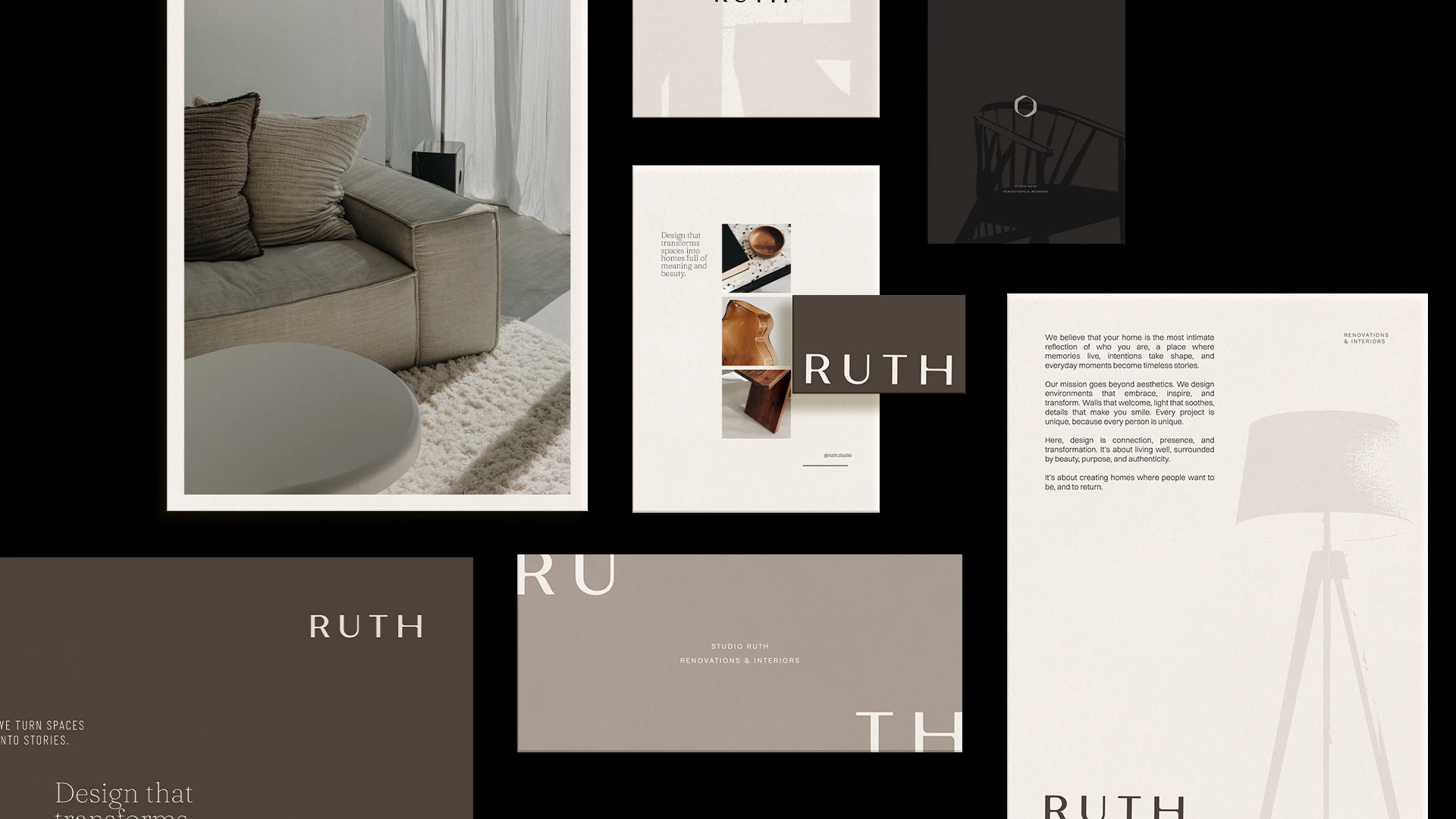 Ruth is an interior design studio that transforms spaces into stories. The visual identity was crafted to reflect its sensitive, human, and sophisticated essence, uniting minimalism, intention, and warmth. The symbol, inspired by an organic frame, represents authenticity, reflection, and a design approach that places the client at the center. The earthy and neutral palette reinforces the studio’s elegant and timeless atmosphere, while the typographic combination balances editorial sophistication with contemporary clarity. Abstract illustrations complete the visual language, bringing texture, rhythm, and humanity to the applications. The result is an identity that expresses Ruth’s purpose: to create spaces that welcome, inspire, and reveal who we are.