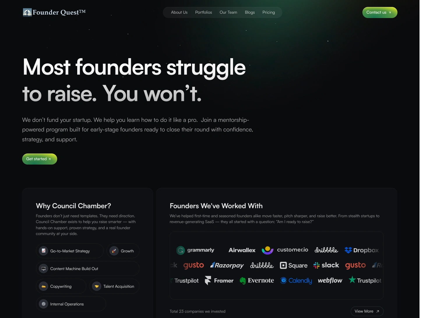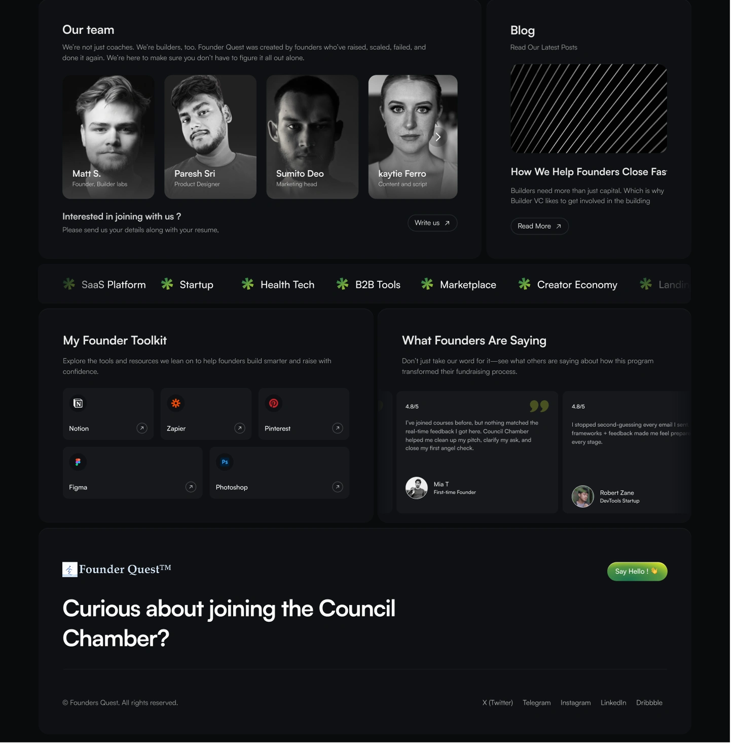 I designed the landing page for Founder Quest’s Council Chamber, a mentorship-driven program for early-stage founders. The goal was to create instant trust and clarity—positioning the Council as a solution for founders struggling to raise capital. The design centers around a bold, direct hero message, real founder testimonials, and crisp explanations of the value (strategy, guidance, toolkit, and hands-on support). I highlighted past founder successes, the program’s unique mentorship approach, and included dynamic sections for team, blogs, and founder resources. The result: a high-impact, modern landing experience that converts curiosity into applications—without overpromising funding.
