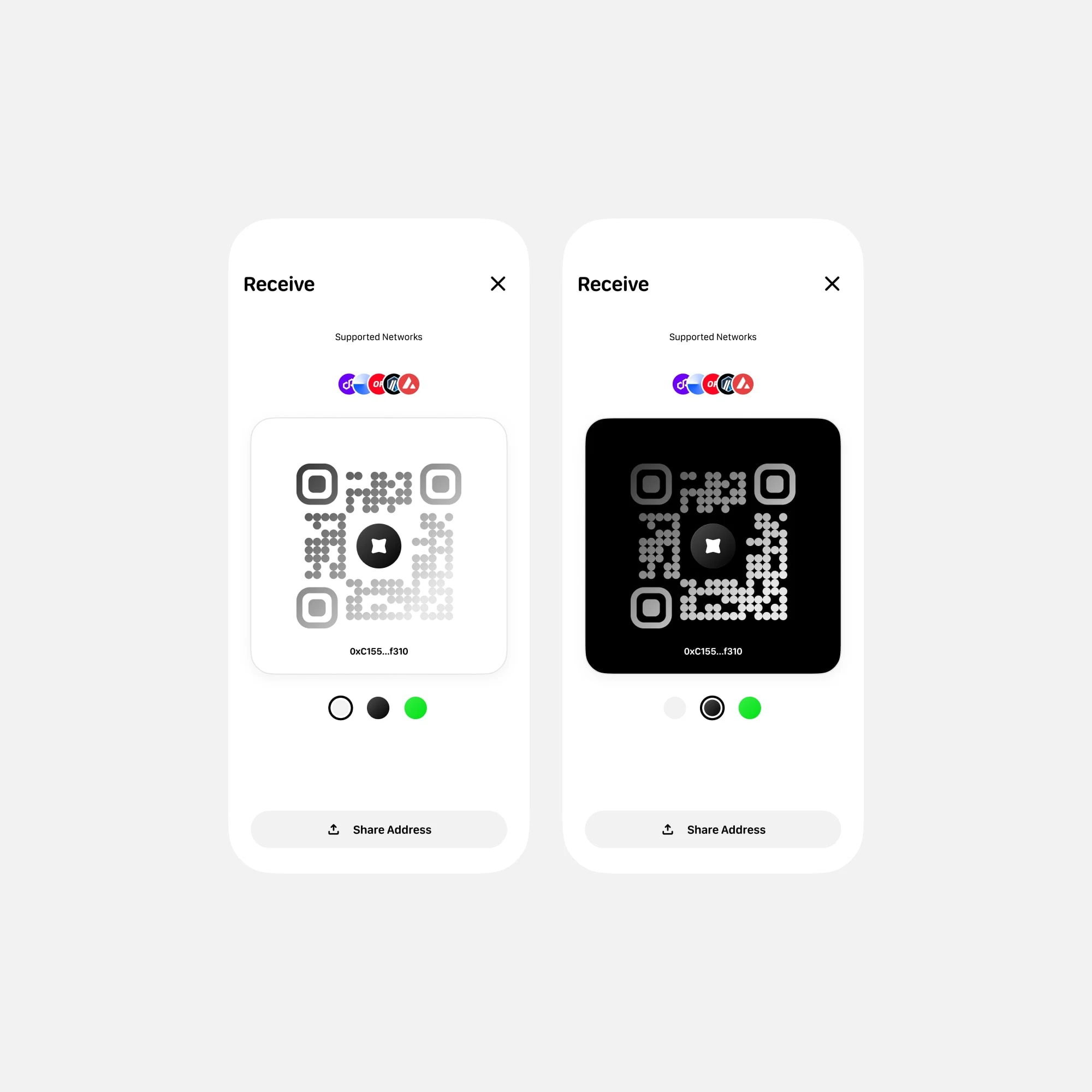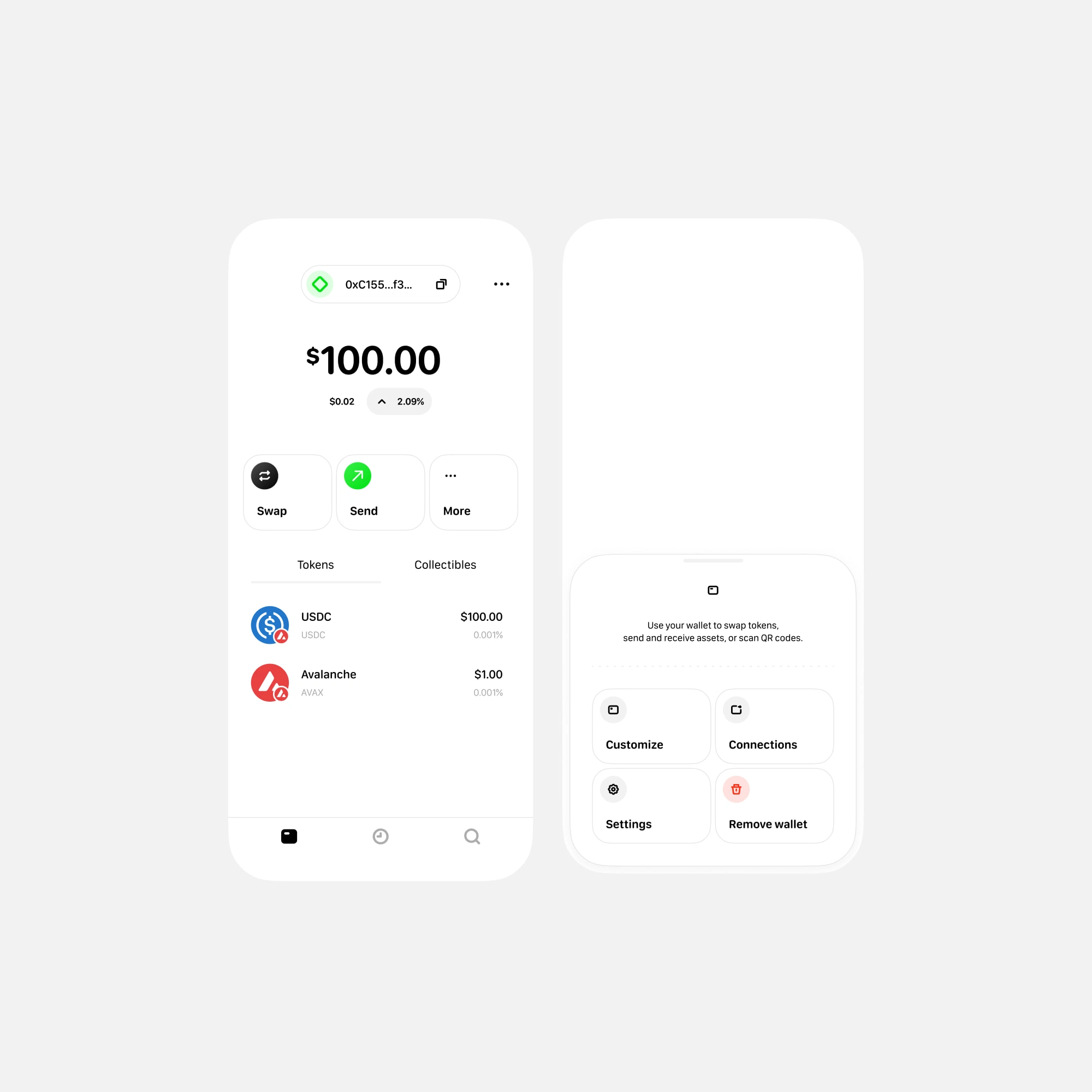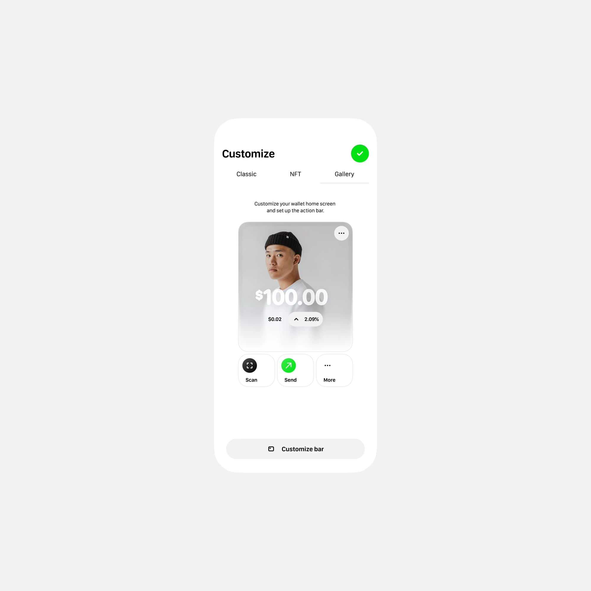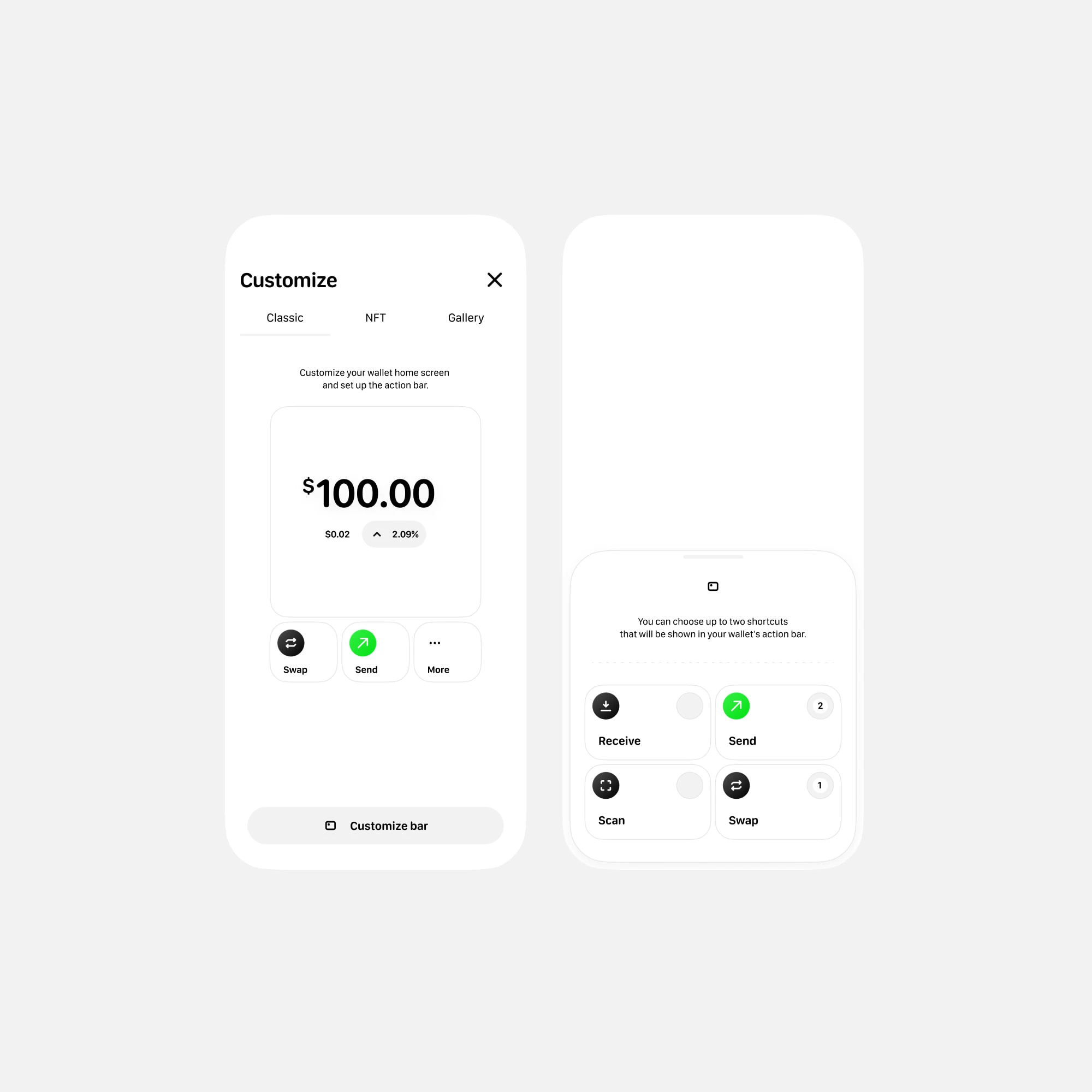 The home screen is fully customizable: users can choose between different layout modes classic, NFT view, or gallery and pick up to two quick actions to keep their flow fast and personal.