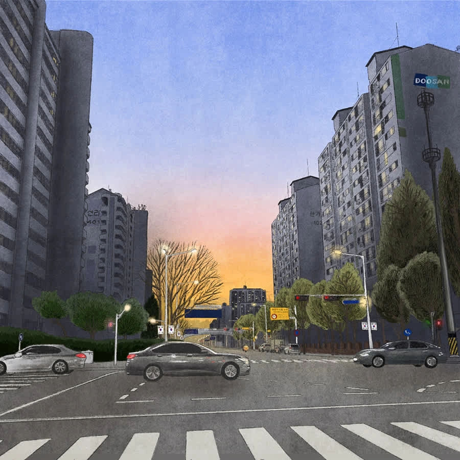 Digital illustration that depicts the sunset and scenery of the building forest with the feeling of hand painting.