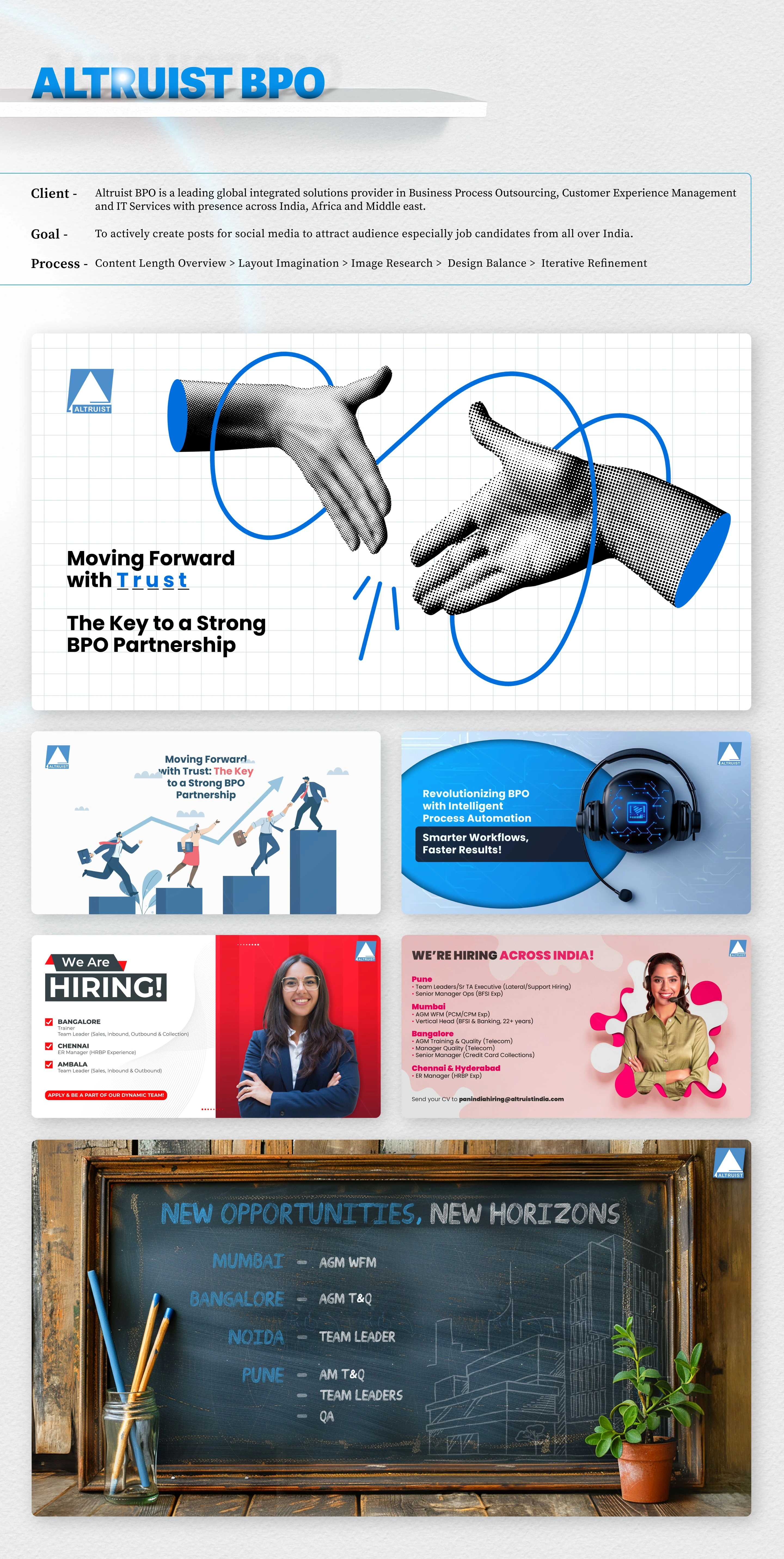 Created hiring campaigns, job posts, and brand trust content for a BPO company operating across India, Africa and the Middle East. Recruitment plus credibility.