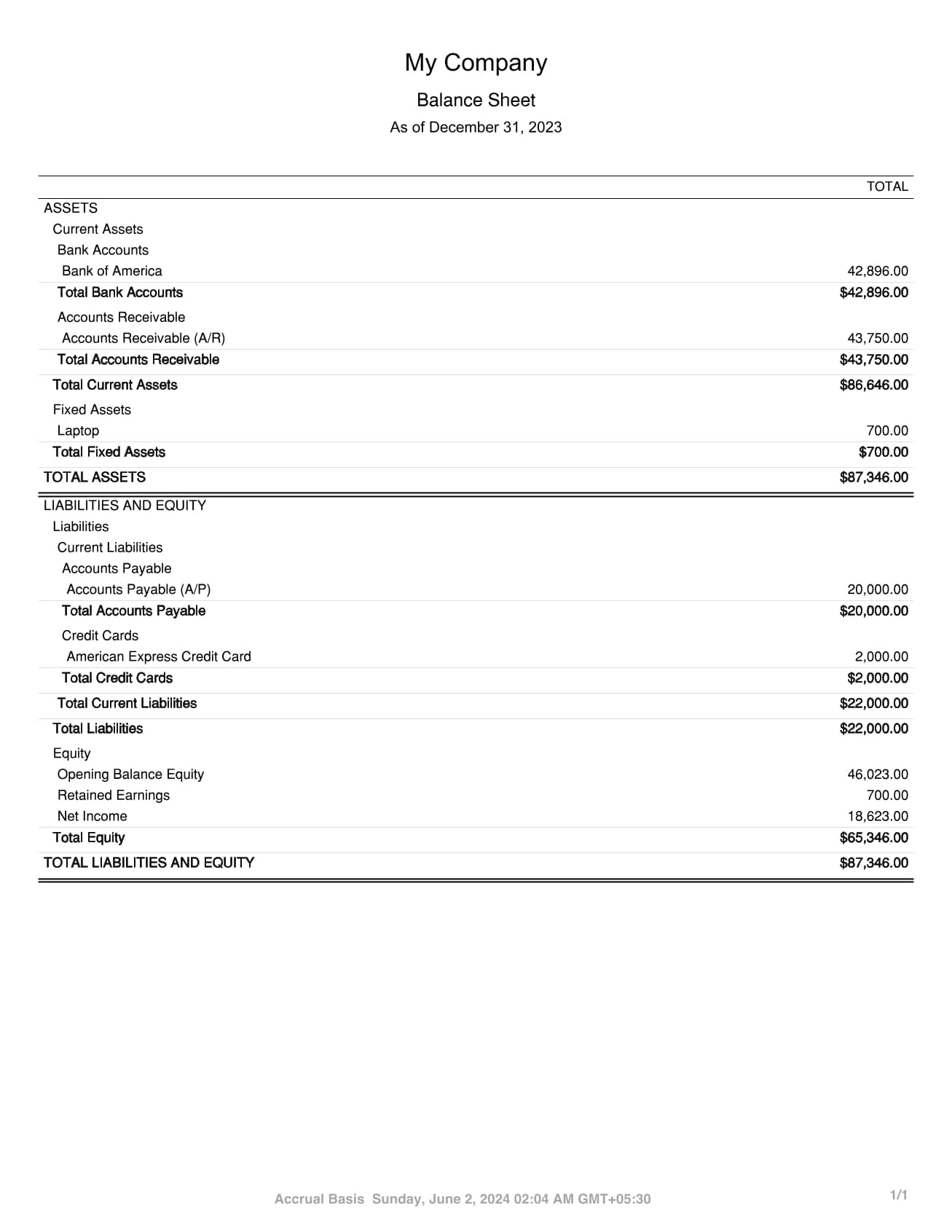 Balance Sheet provided to interior design client after clearing bank feed and reconciliation, enabling informed decisions based on financial analysis.