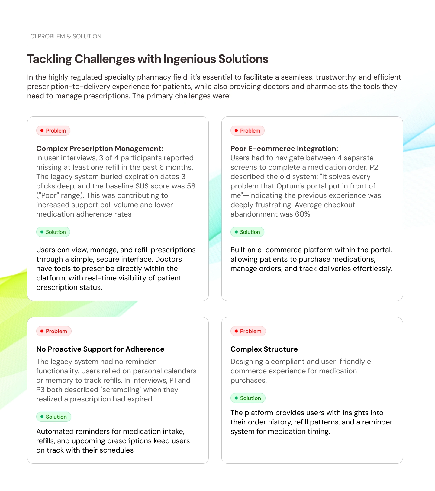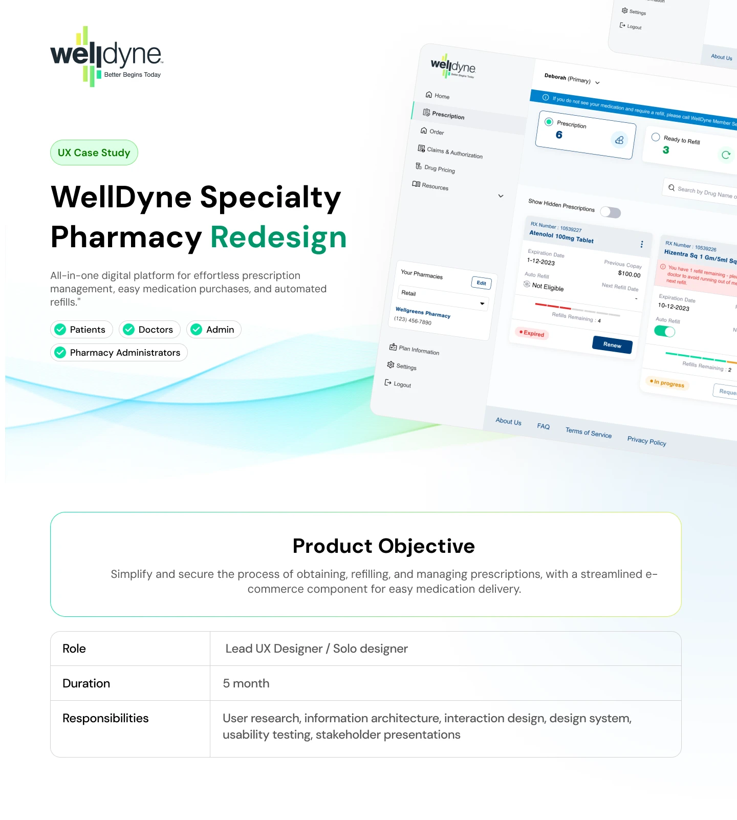 The WellDyne Specialty Pharmacy project developed a secure, user-centric platform to simplify prescription management. It tackles challenges like complex tracking, poor e-commerce integration, and low engagement by offering an intuitive interface, automated reminders, and streamlined medication purchasing. The platform improves adherence, boosts satisfaction, and reduces admin work for doctors, delivering a seamless prescription-to-delivery experience.