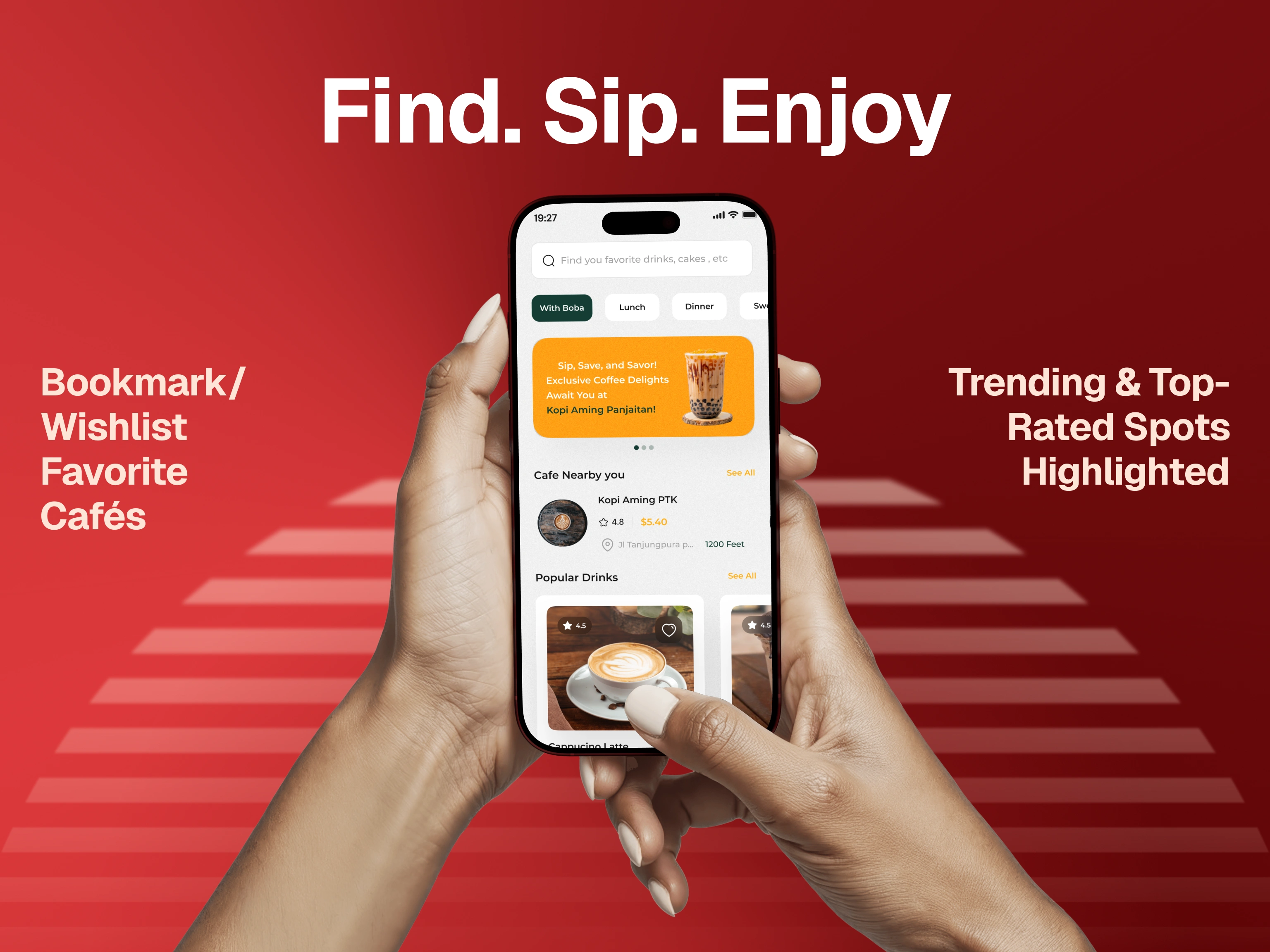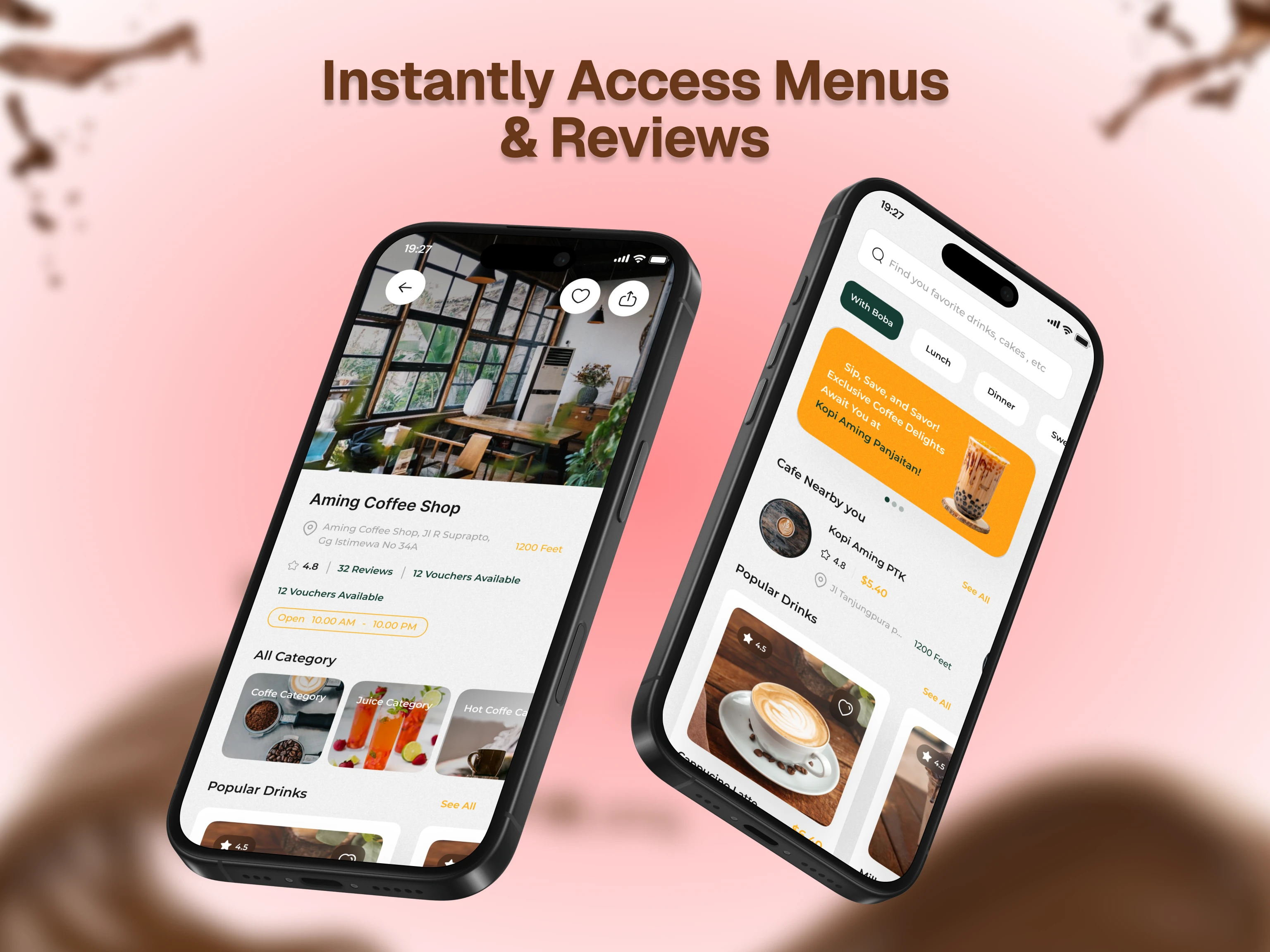 Nearby café discovery with reviews, menus, and opening hours