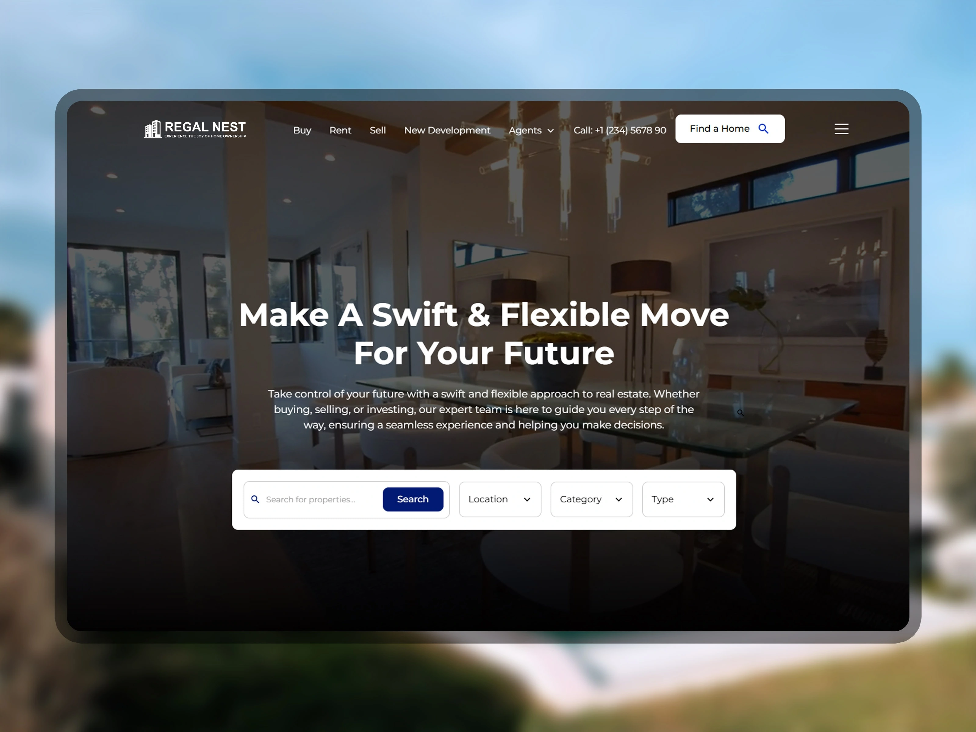 The newly designed Regal Nest website combines cutting-edge real estate functionality with an elegant, intuitive design. Visitors are greeted with a clean, modern interface that highlights the company’s premium property listings and seamless navigation features.