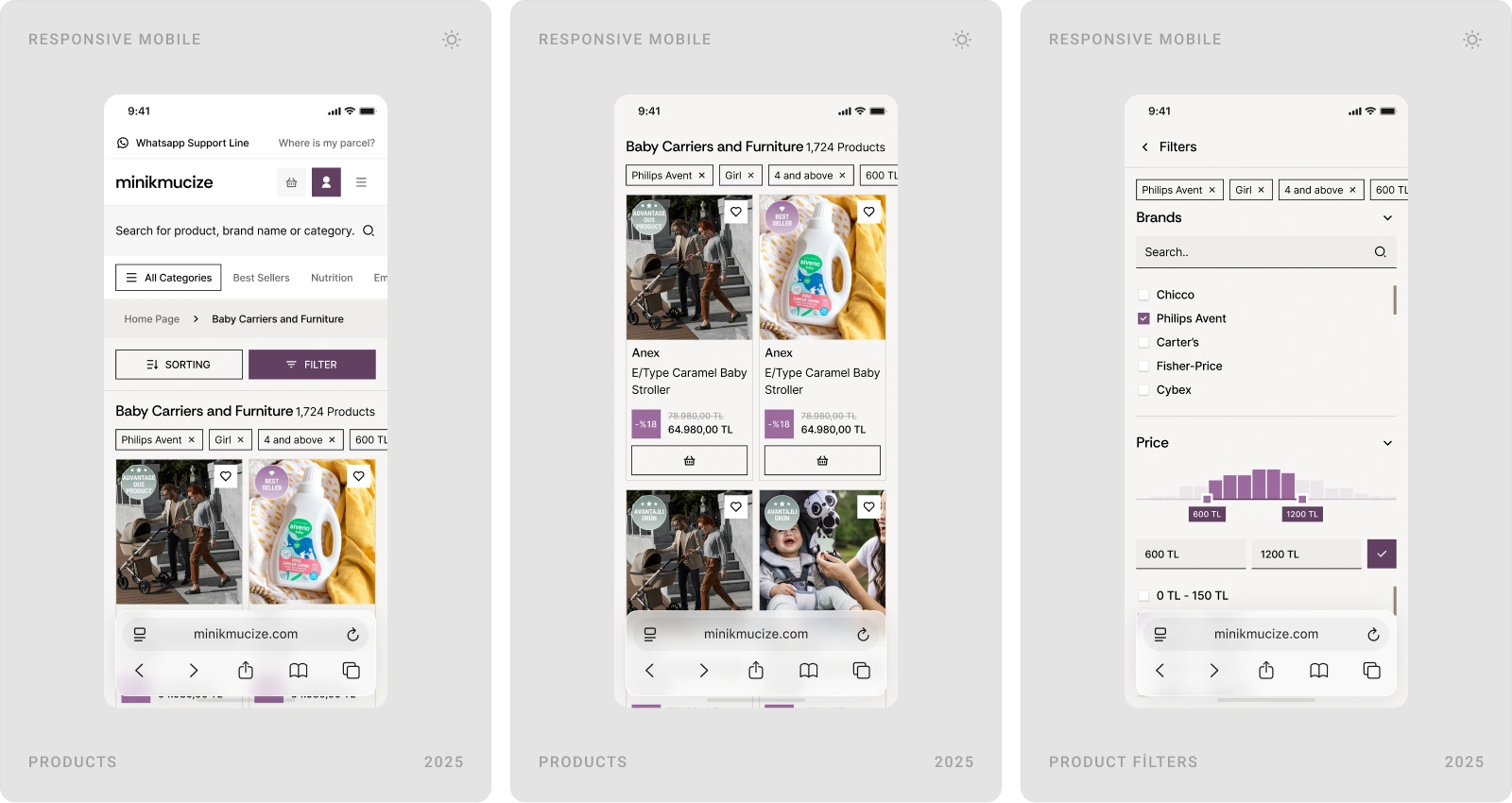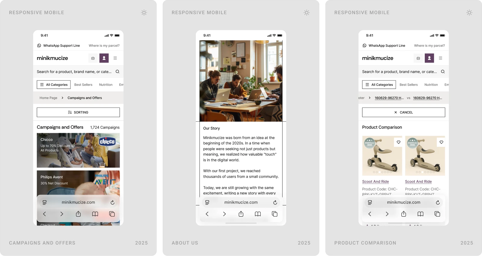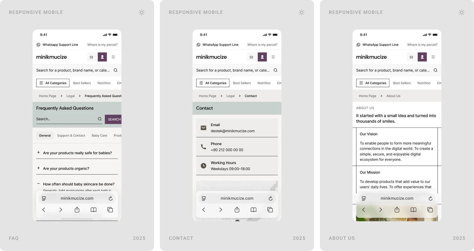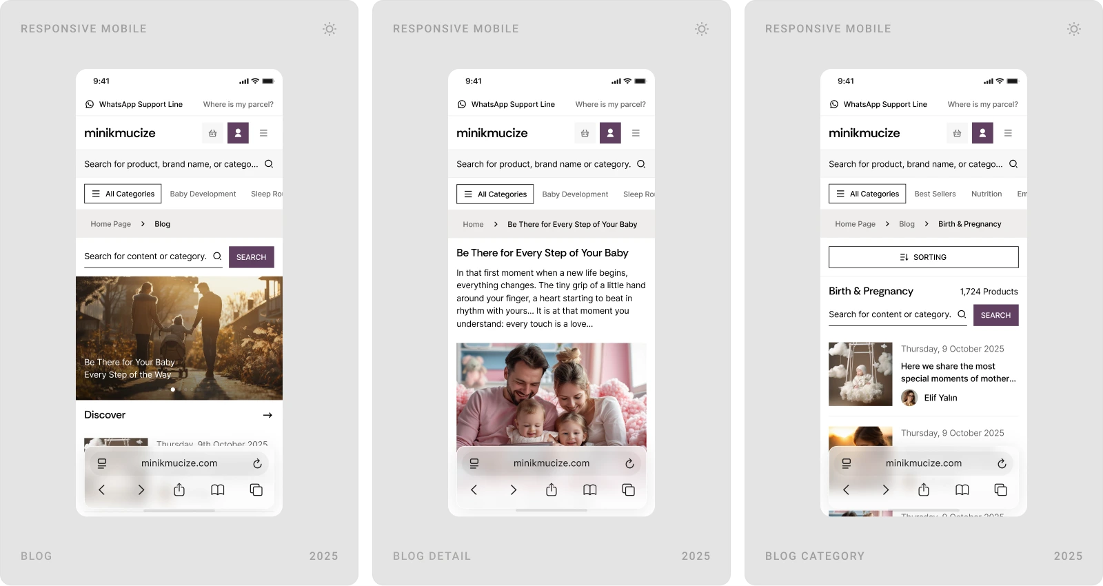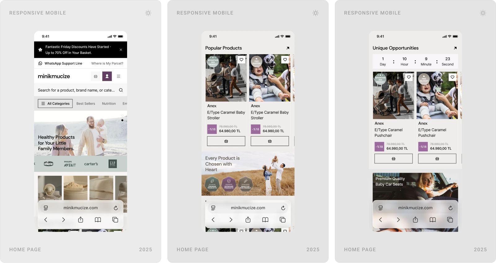 Beew Studio redesigned Minikmucize’s e-commerce UI/UX to achieve a more premium, modern, and feminine brand presence while improving conversion. Using a soft, niche color palette and a clean layout system, we rebuilt key shopping flows to reduce clicks and increase trust for health-focused mom, baby, and maternity products. The scope covered ~60 responsive pages, including homepage, category and product pages, cart & checkout, and the user account.