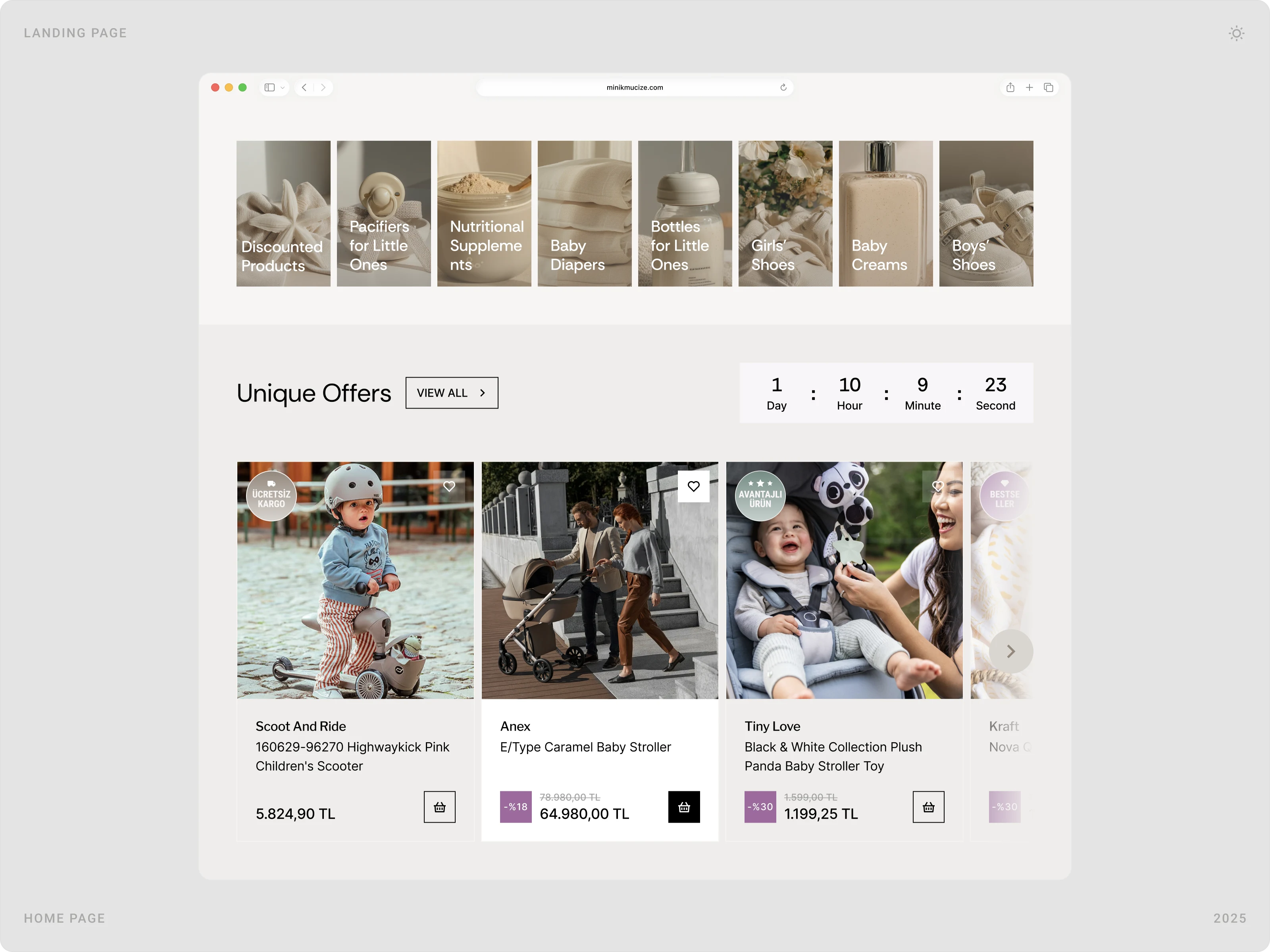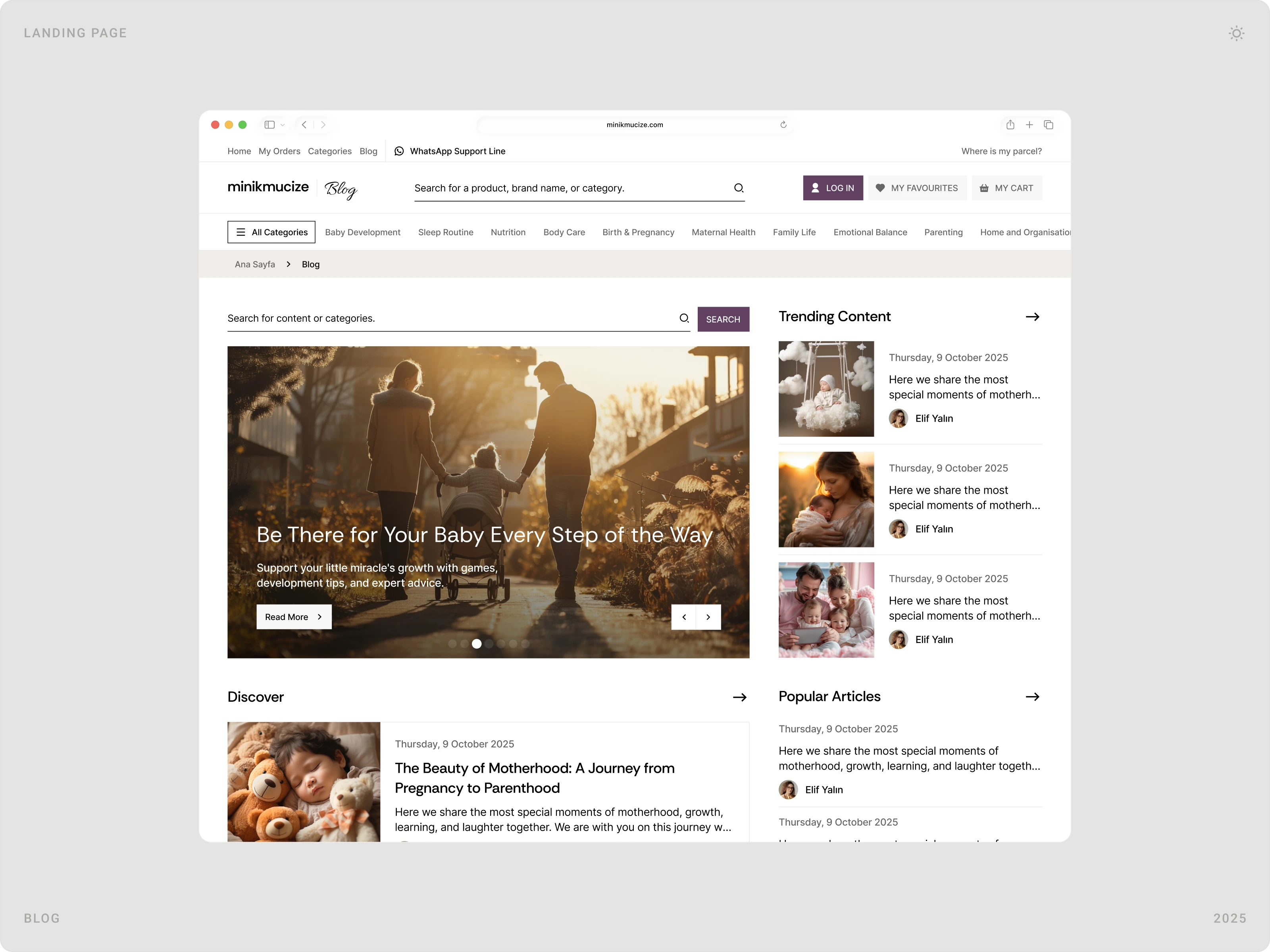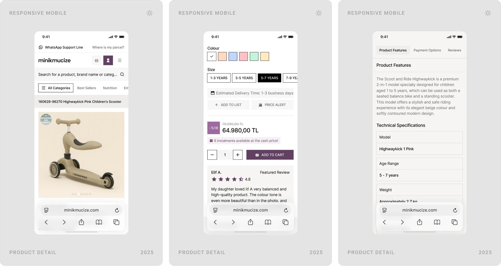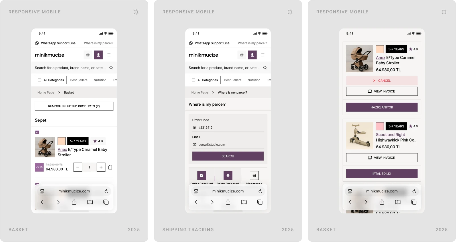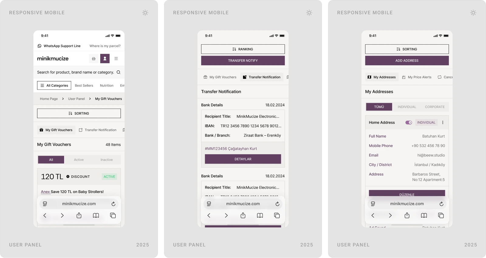 Beew Studio redesigned Minikmucize’s e-commerce UI/UX to achieve a more premium, modern, and feminine brand presence while improving conversion. Using a soft, niche color palette and a clean layout system, we rebuilt key shopping flows to reduce clicks and increase trust for health-focused mom, baby, and maternity products. The scope covered ~60 responsive pages, including homepage, category and product pages, cart & checkout, and the user account.