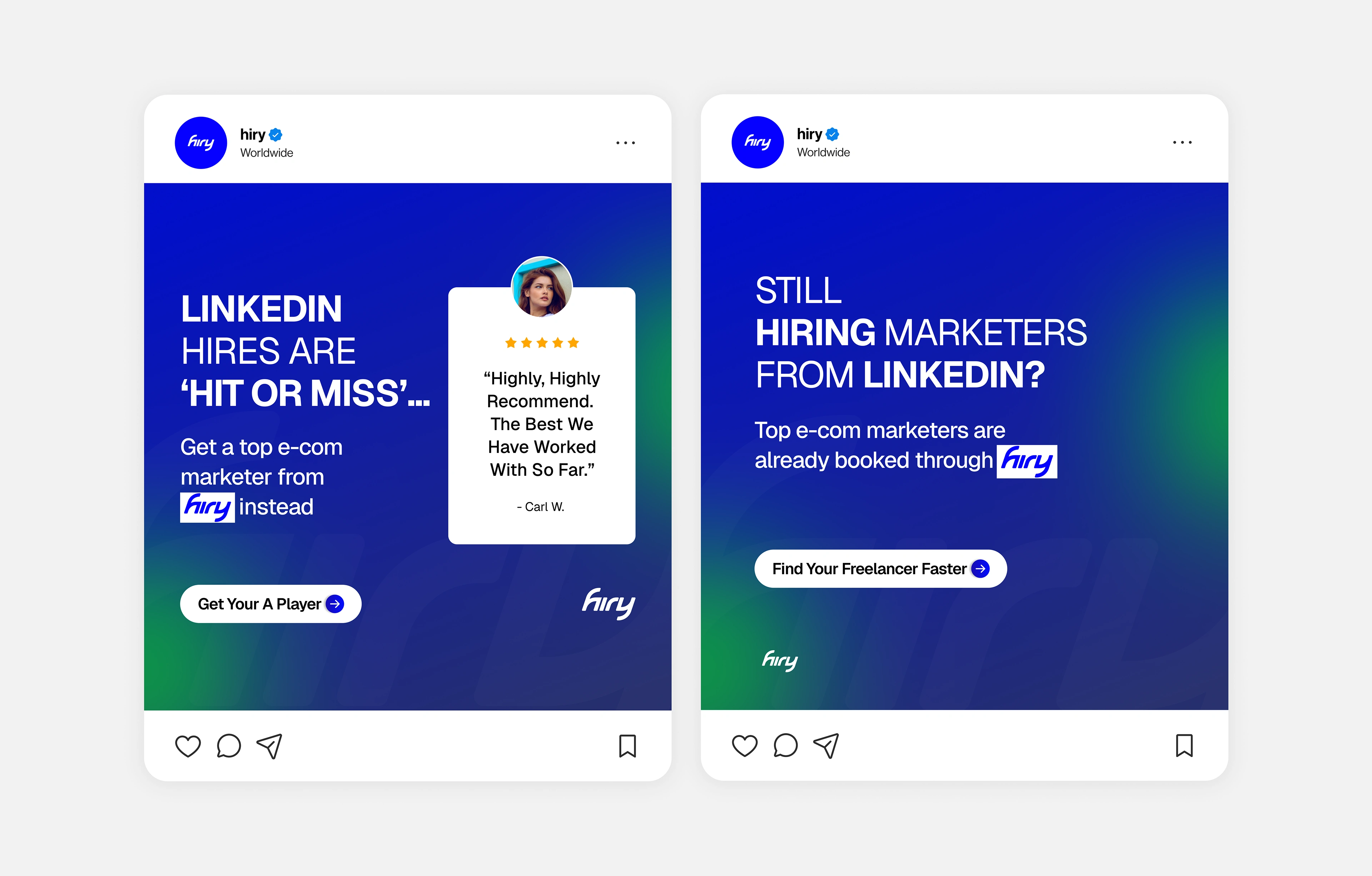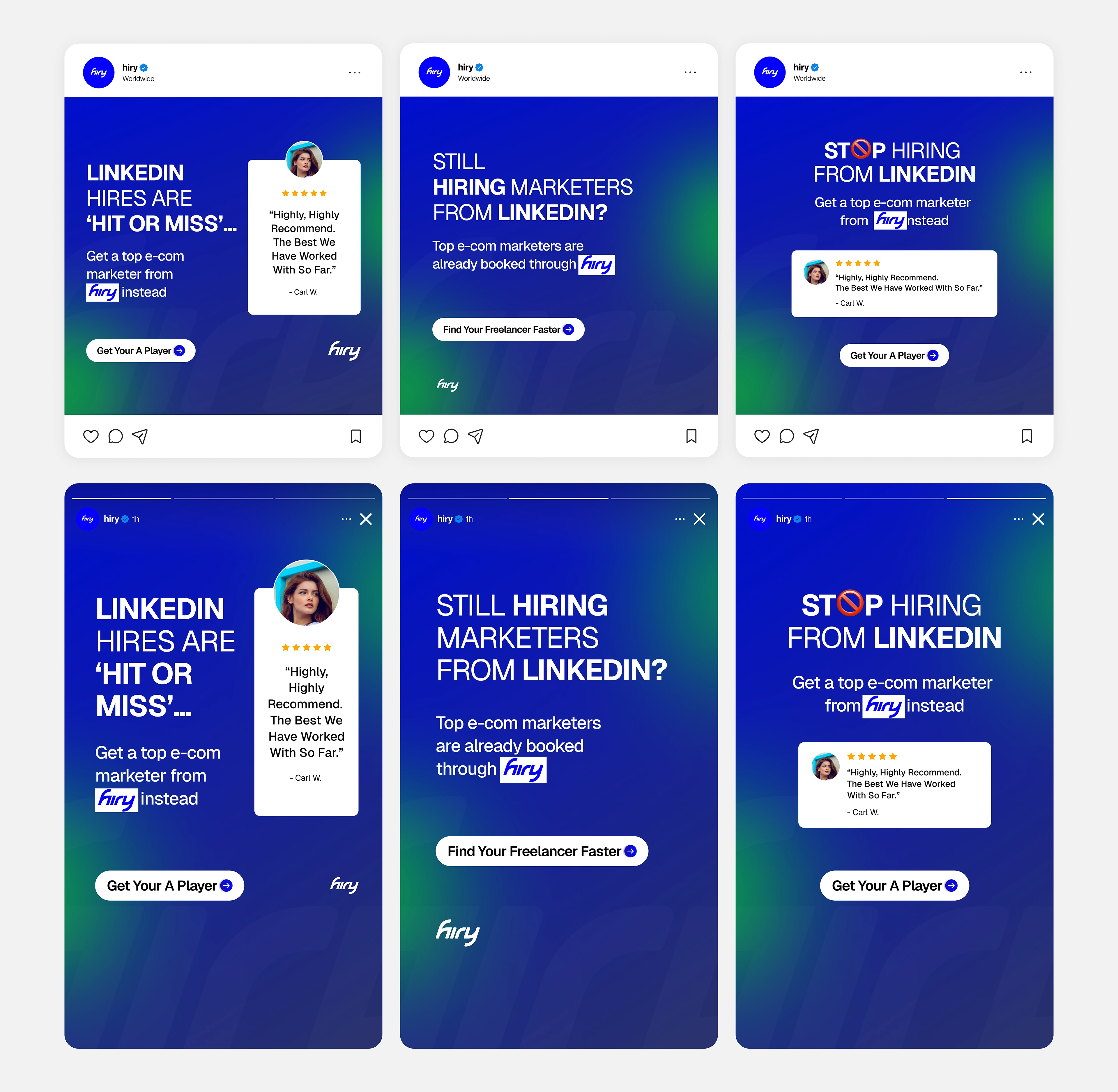 Designed a cohesive set of static ads for Hiry Agency, a modern recruitment brand committed to simplifying the hiring process for businesses, by creating clean, engaging visuals that highlight their tech-driven approach, streamlined services, and mission to connect companies with the right talent faster and more efficiently.