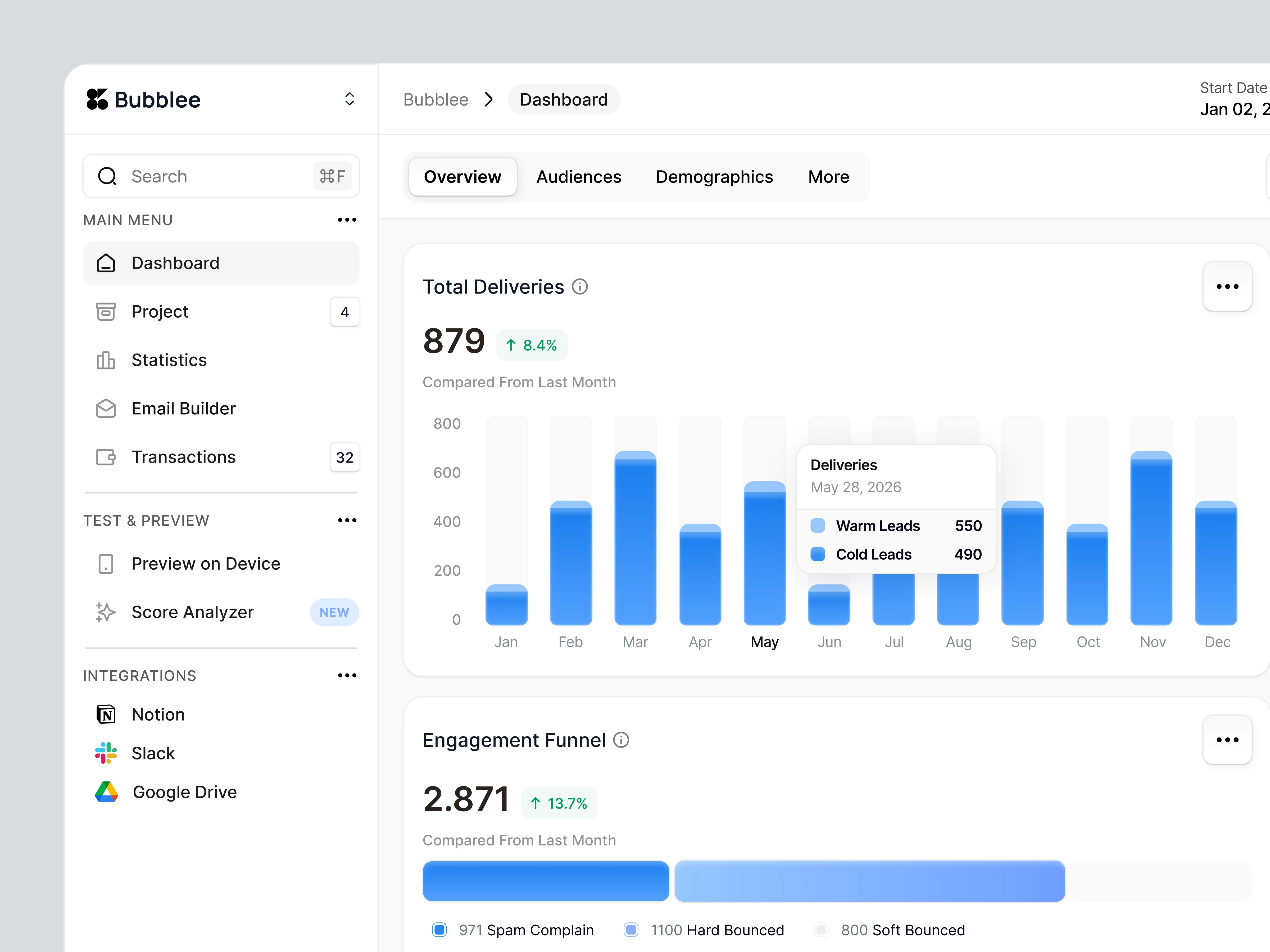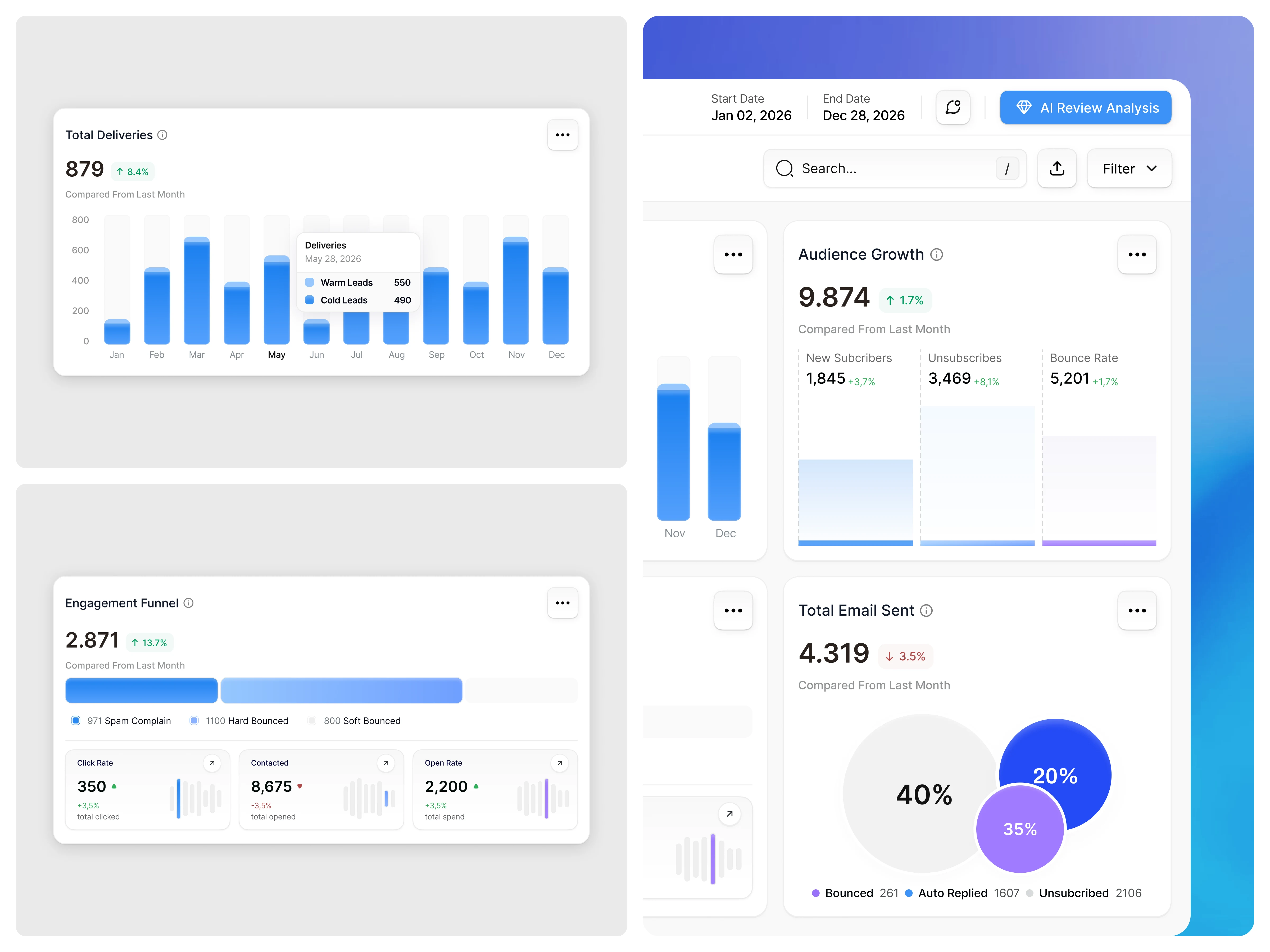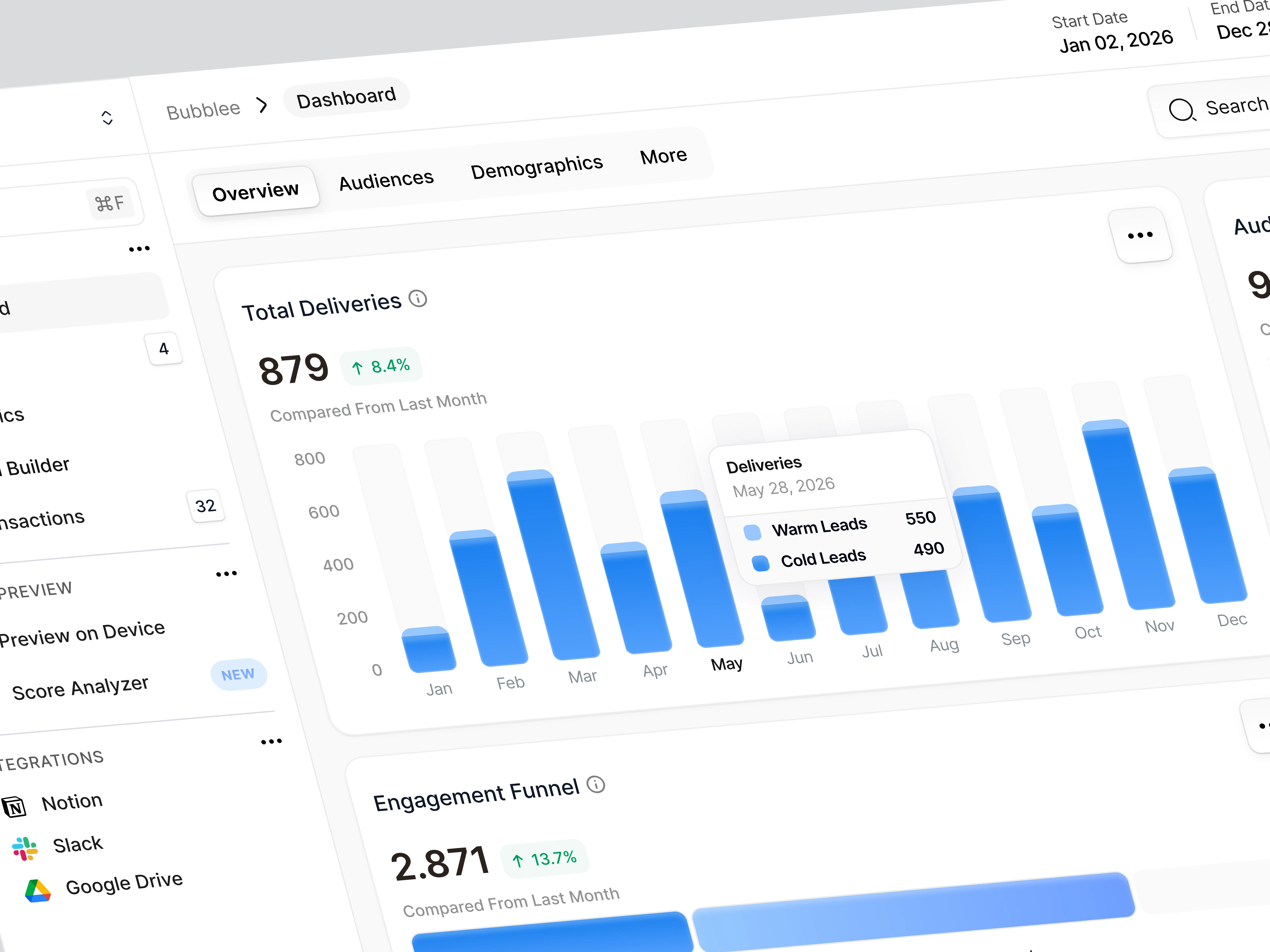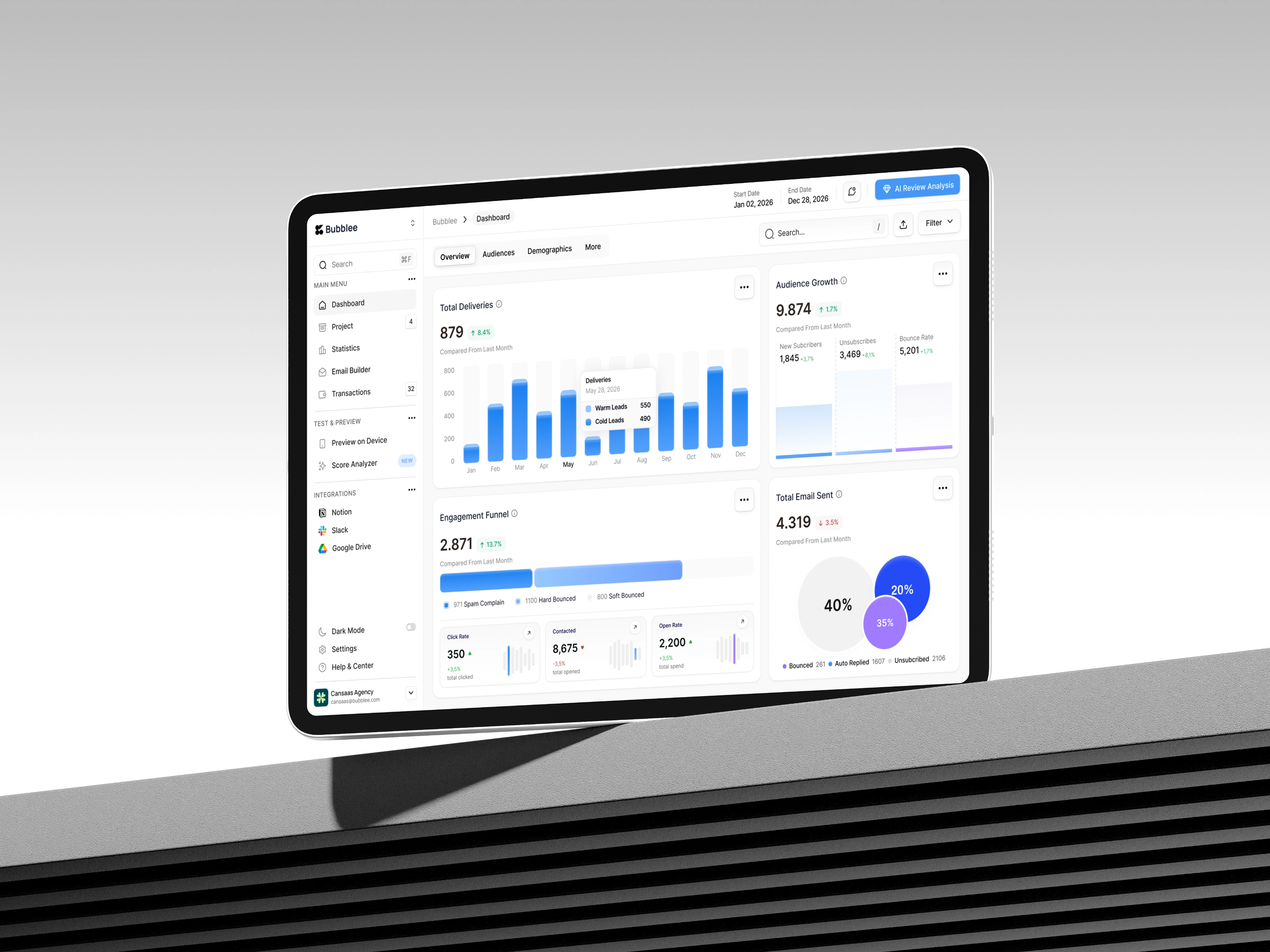 This Email Builder Dashboard UI/UX case study explores the design of a modern SaaS analytics interface built to help teams monitor email performance with clarity and confidence. The goal of this dashboard is to transform complex campaign data—such as deliveries, audience growth, engagement funnels, and response outcomes—into an interface that feels calm, readable, and actionable. By prioritizing visual hierarchy, spacing, and intuitive data visualization, this design supports faster insights and better decision-making for marketing teams and product stakeholders.