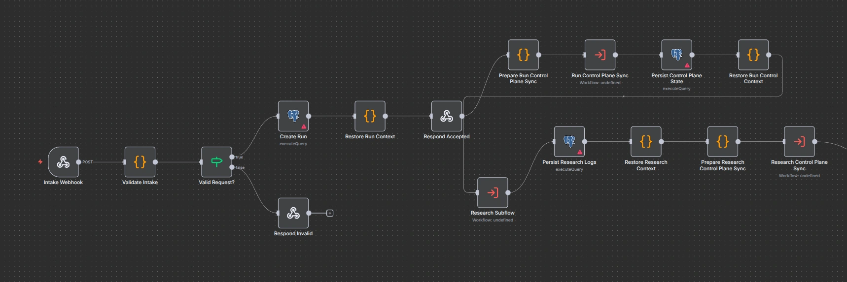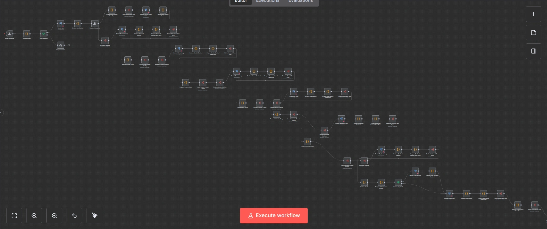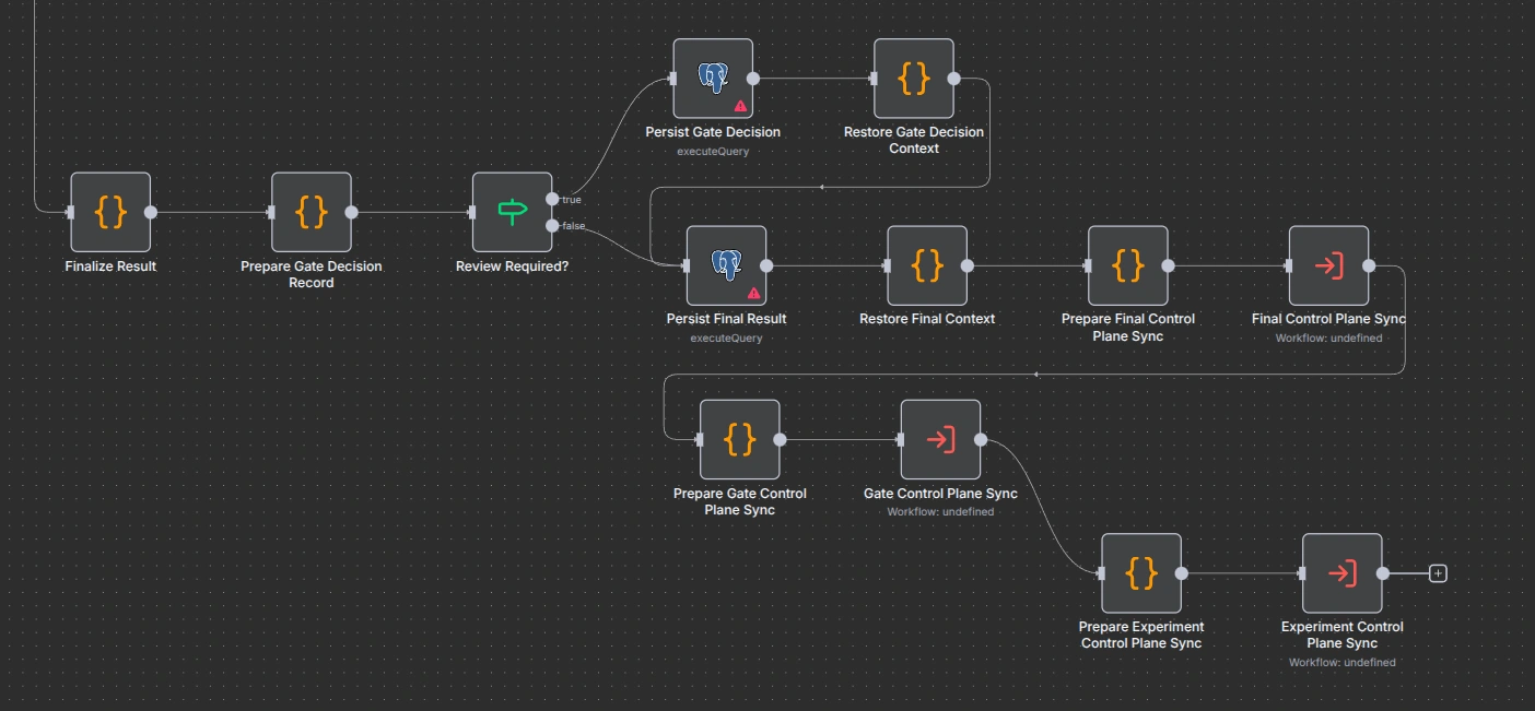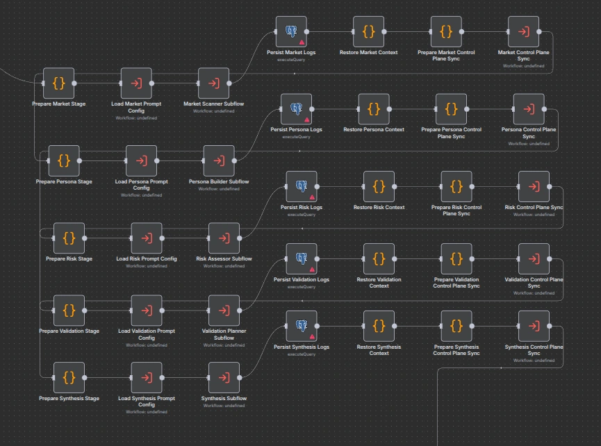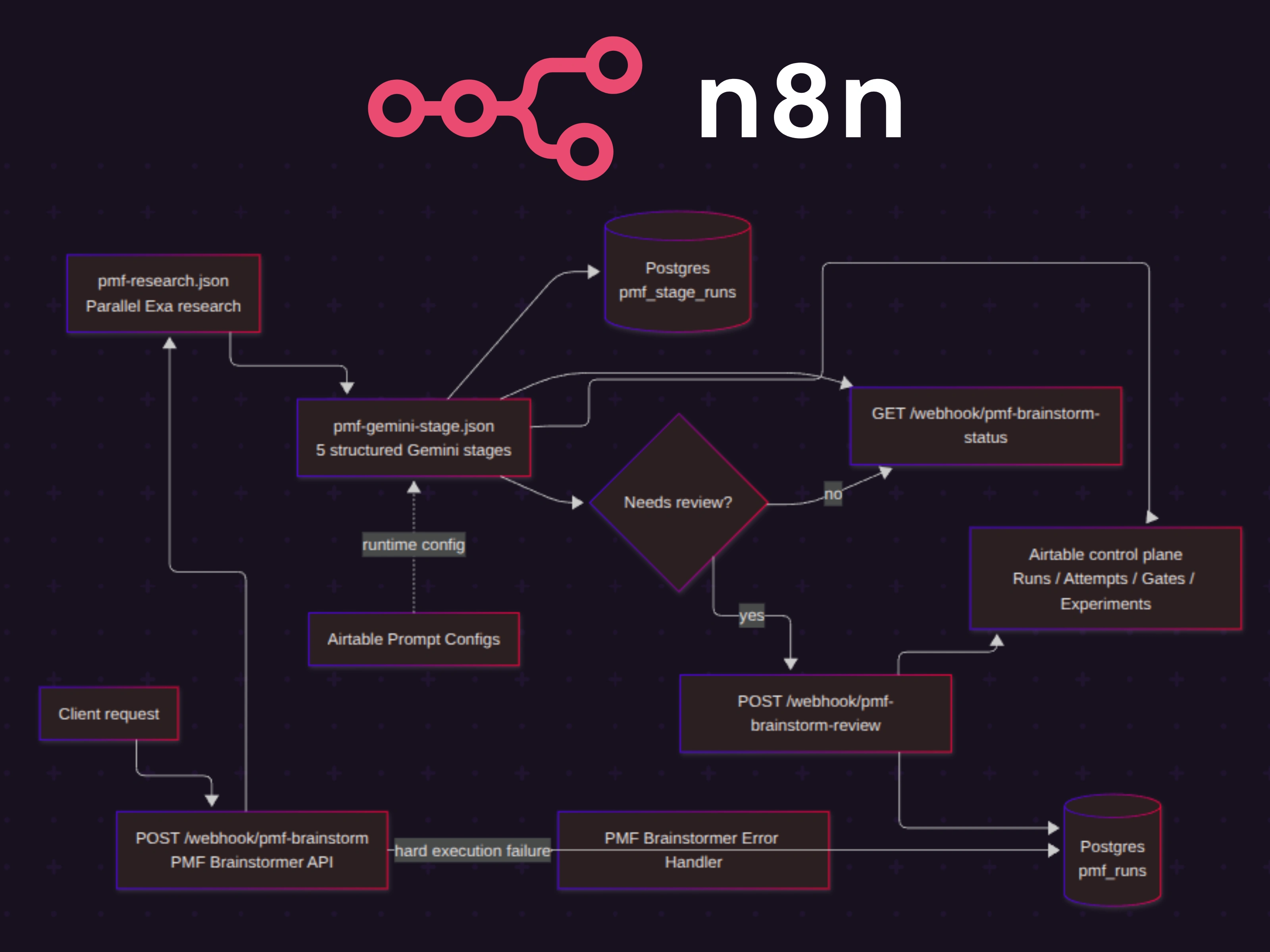 PMF Brainstormer is a backend automation project built in n8n for idea validation. A user submits a product idea through an API, the workflow runs market research with Exa, pushes that context through five structured Gemini analysis stages, stores the full execution trail in Postgres, and exposes operator-facing state in Airtable.202, so the long-running analysis does not block the caller. A separate status endpoint lets the client poll the current run. If the final synthesis decides the result needs human review, the workflow moves the run into awaiting_review instead of pretending it is safe to auto-complete.Exa searches first, then executes five sequential Gemini stages:market_scannerpersona_builderrisk_assessorvalidation_plannersynthesisGemini stage subflow shared across five stagesPostgres persistence for runs, stage attempts, and gate decisionsAirtable control plane for runtime prompt config and operator visibilityn8n canvas, I split the system into entry workflows and subflows. That made the architecture easier to reason about, easier to reuse, and much easier to present.Gemini is asked to return schema-constrained JSON, but the workflow still parses and validates the payload itself. Invalid responses retry. If retries fail, the stage returns explicit fallback data with warnings so downstream stages can still behave predictably.Postgres acts as the durable execution ledger, while Airtable gives operators a lighter-weight interface for prompt configs, review gates, stage attempts, and experiment tracking. This separation kept the system auditable for engineering use while still being manageable for non-technical stakeholders.completed, completed_with_warnings, awaiting_review, rejected, needs_changes, or failed. That makes edge cases inspectable instead of invisible.Full orchestration overview