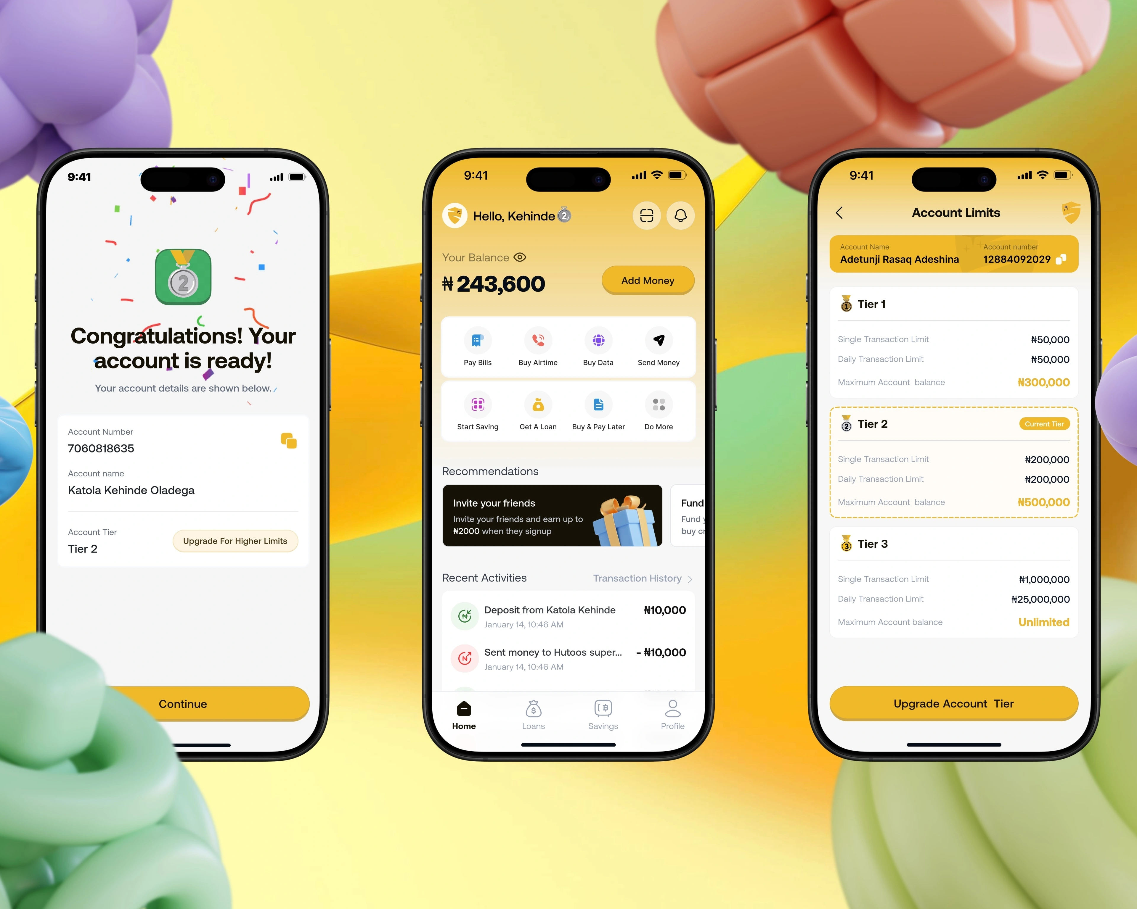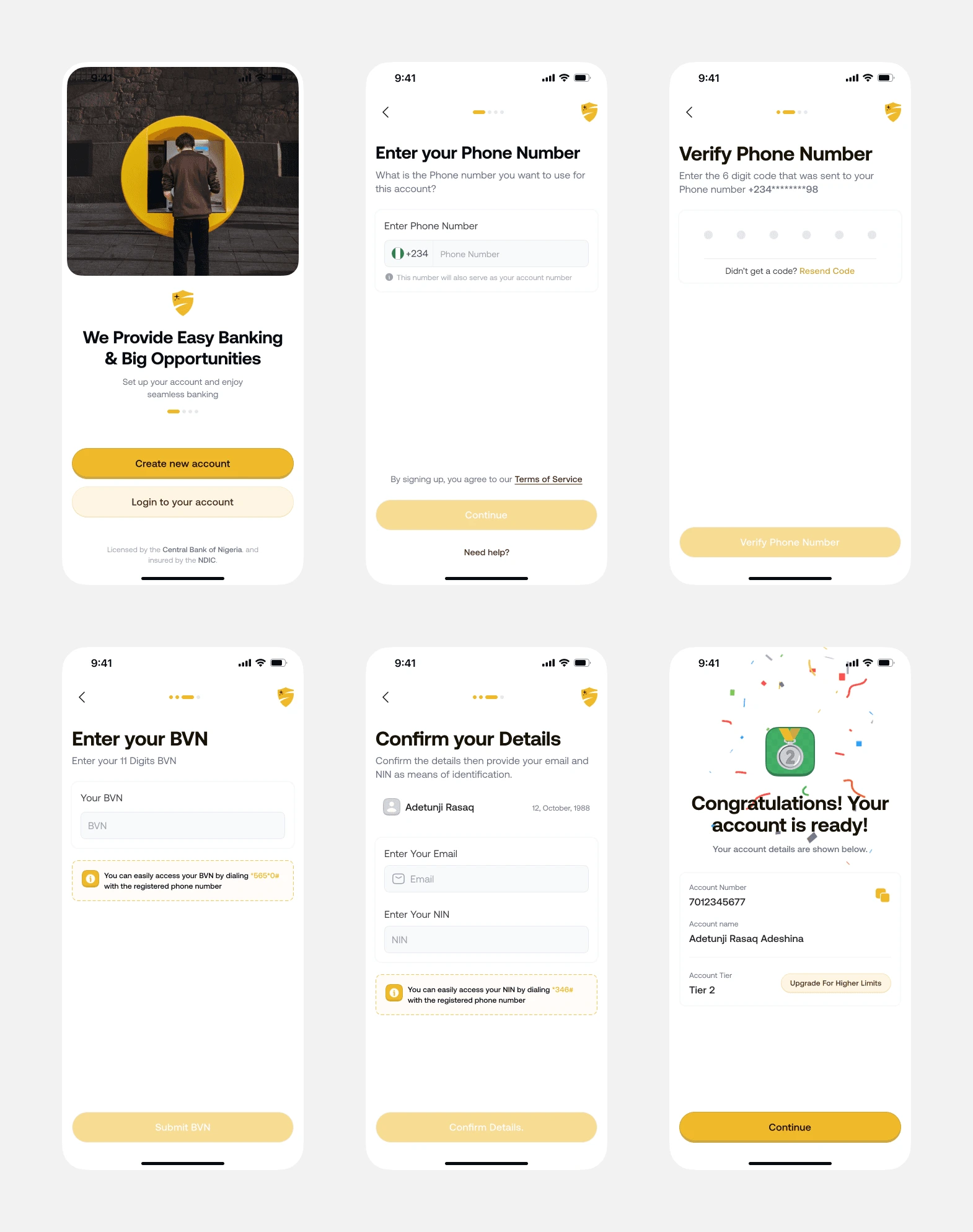 Onboarding our users had to feel easy and familiar, especially because many users would be trying digital banking for the first time. The flow guides them step by step, starting with their phone number, then BVN and NIN so they don’t have to enter too many details manually. After that, they complete a quick face verification to confirm their identity. Each stage is simple, clear, and designed to reduce stress and build trust before they land on the home dashboard.