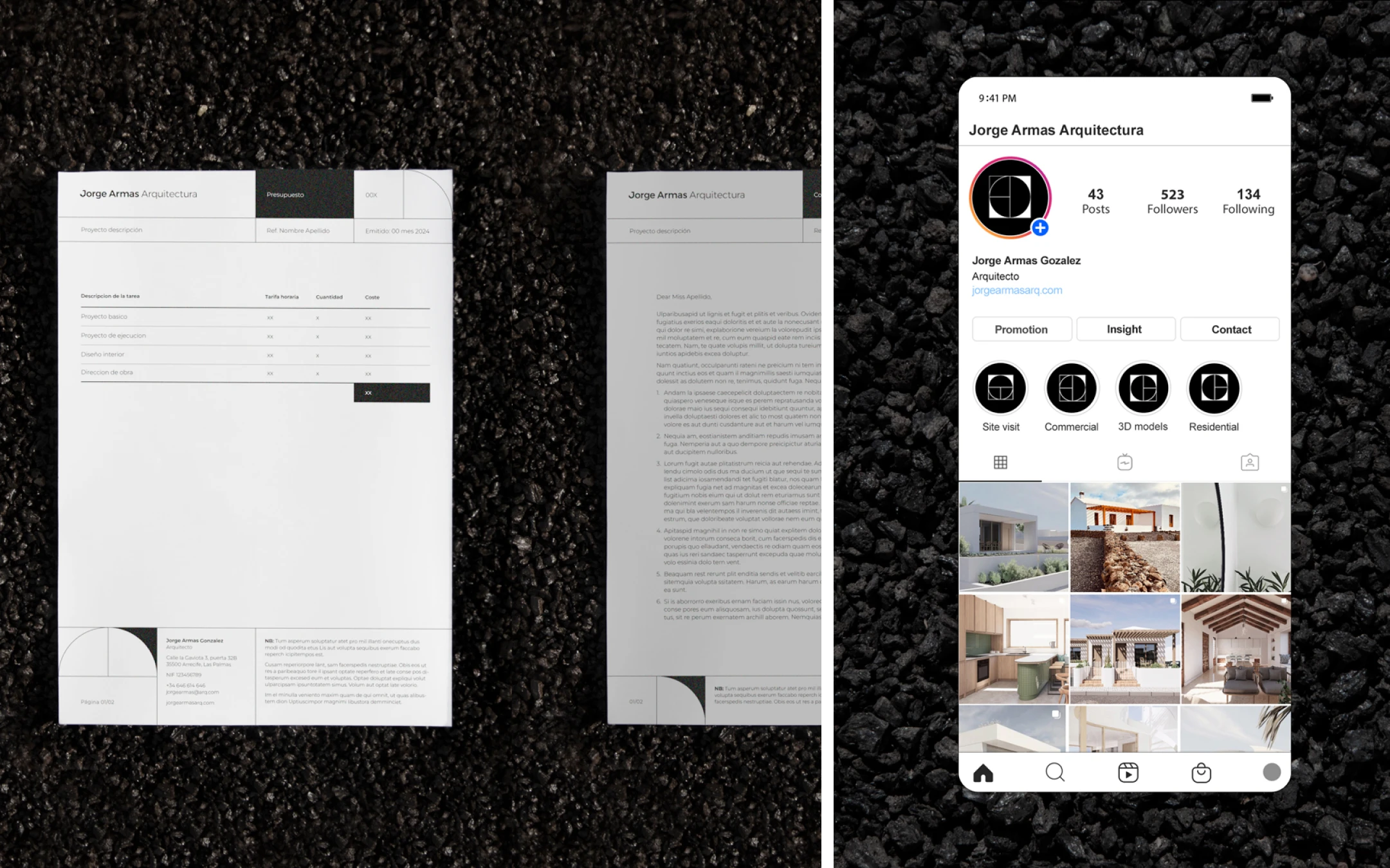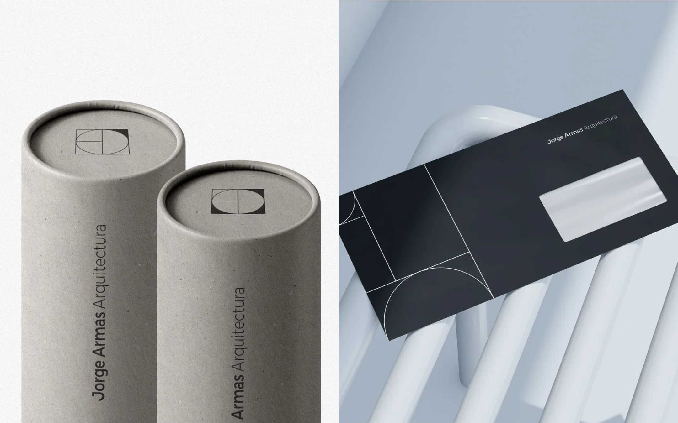 The resulting branding combines simple geometric forms — circles, arcs, and squares — into a modular system inspired by the fundamental elements of architecture. The alternation between solid and outlined shapes creates a dialogue between positive and negative space, echoing the idea of the environment as a force that shapes and influences the built result.