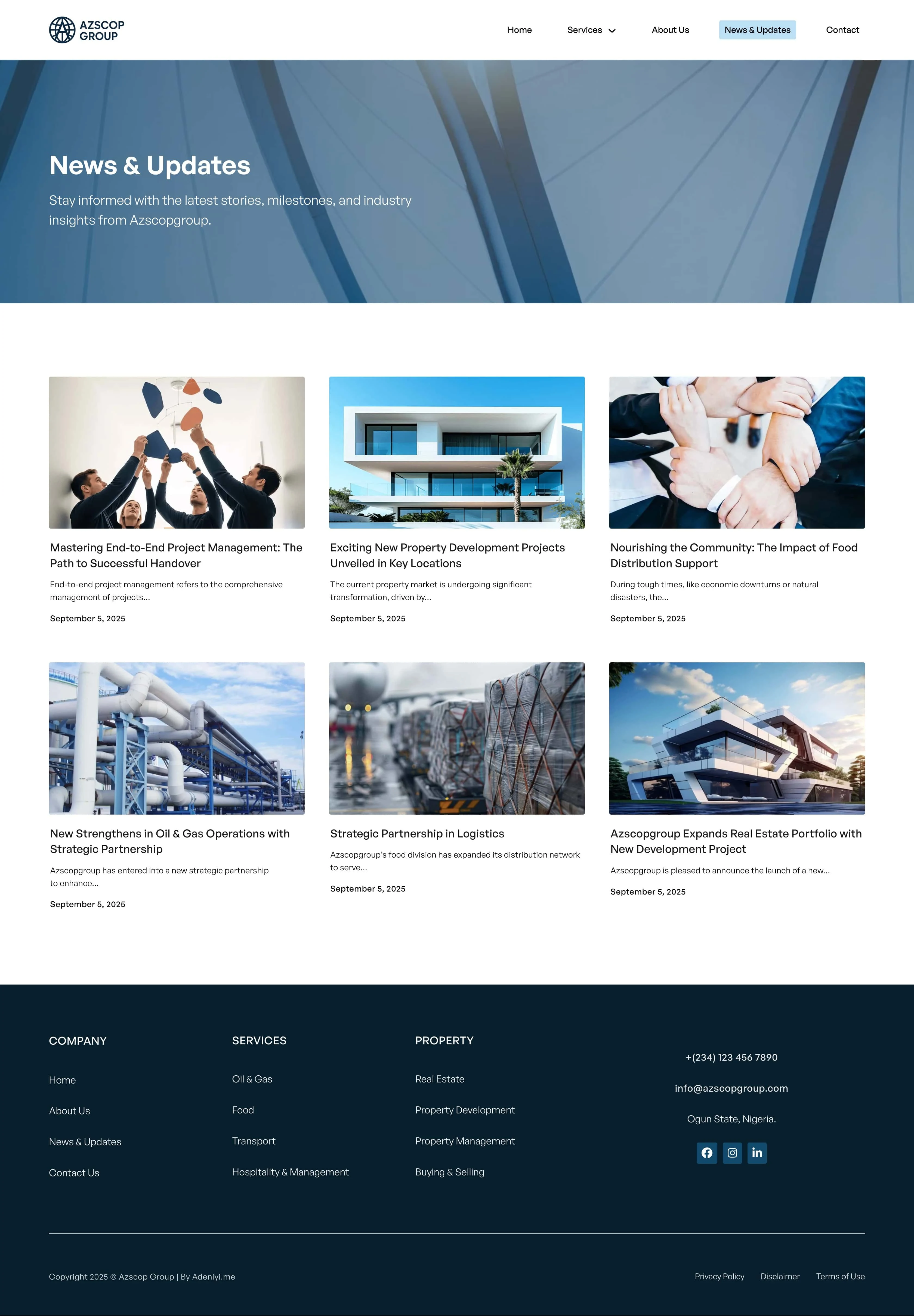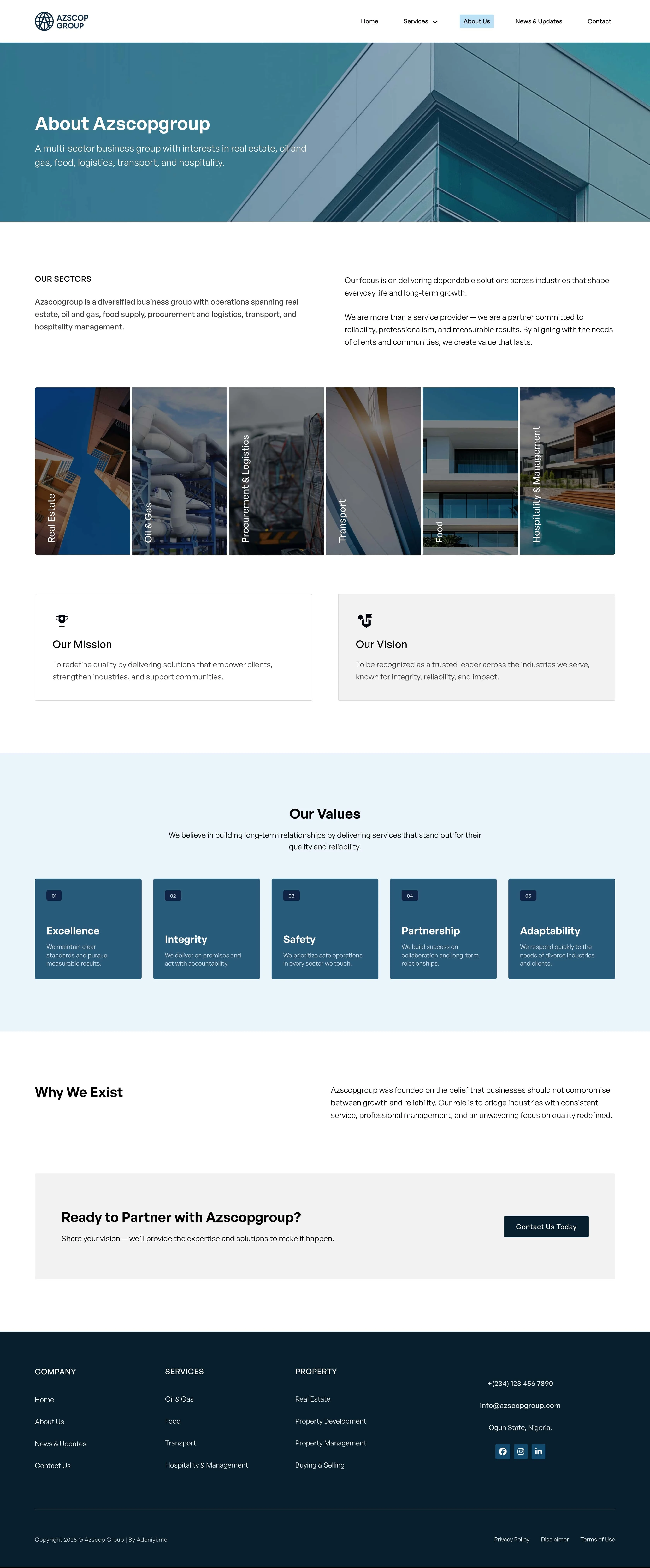 Showcases Azscopgroup’s vision, mission, and credibility.