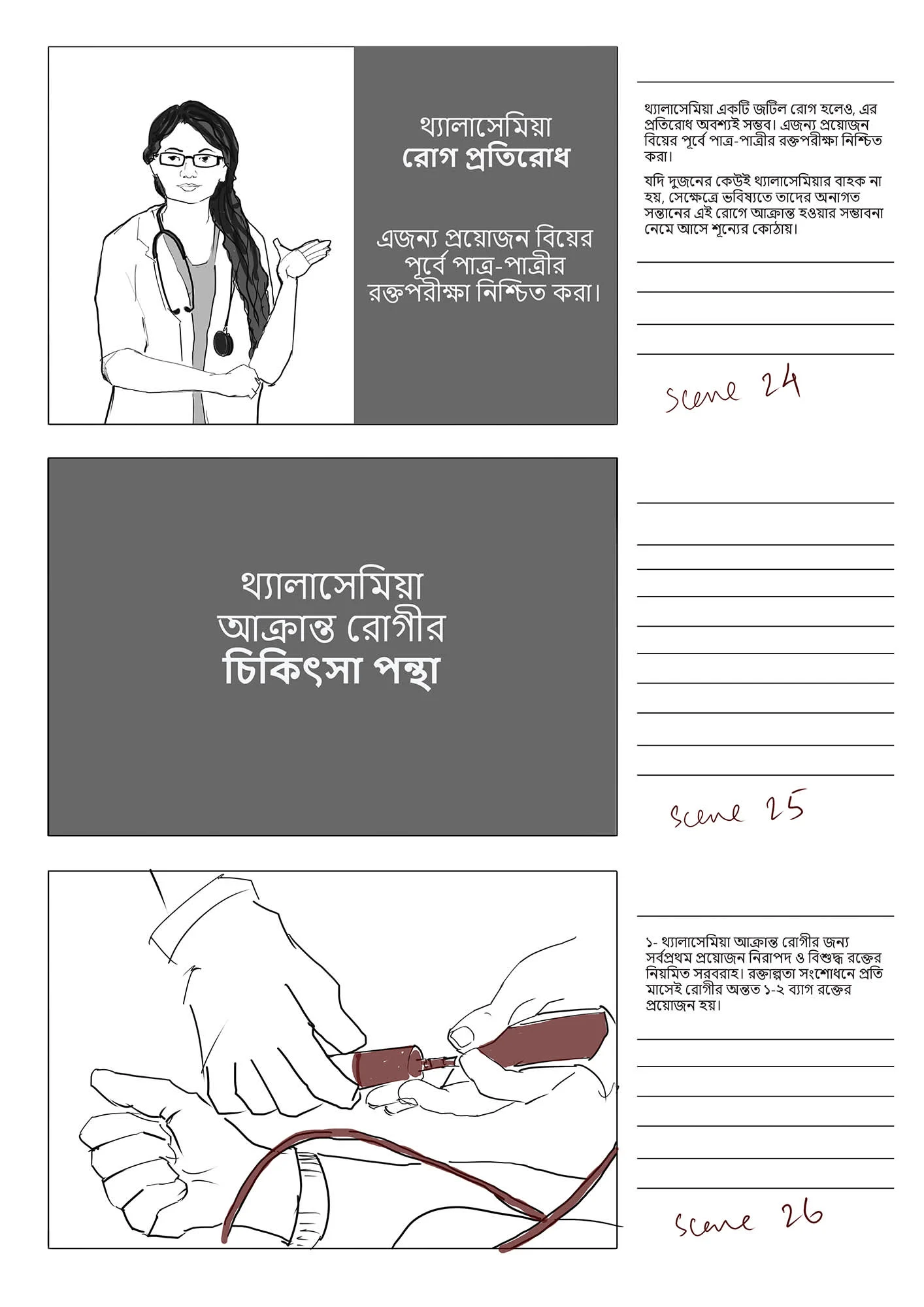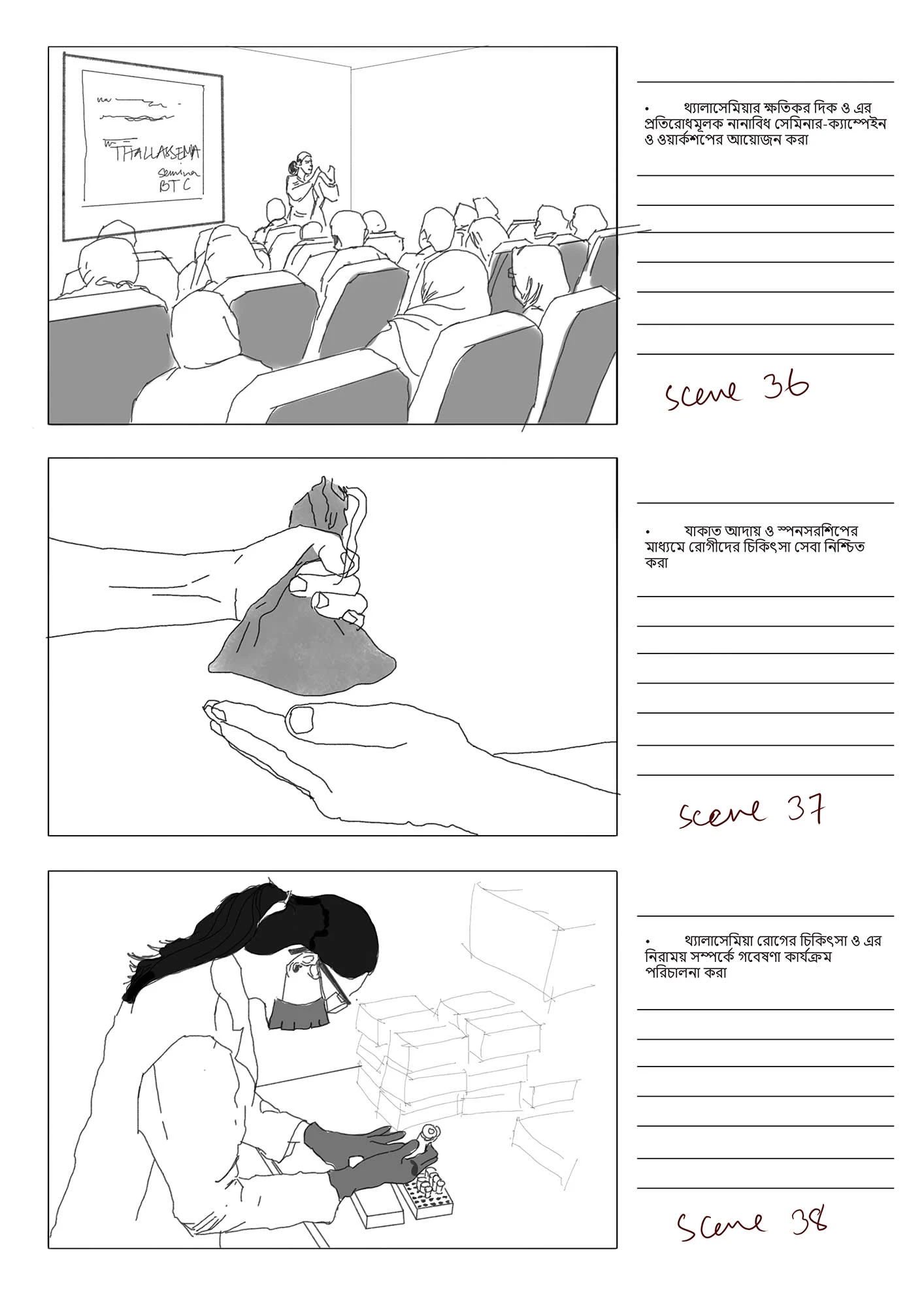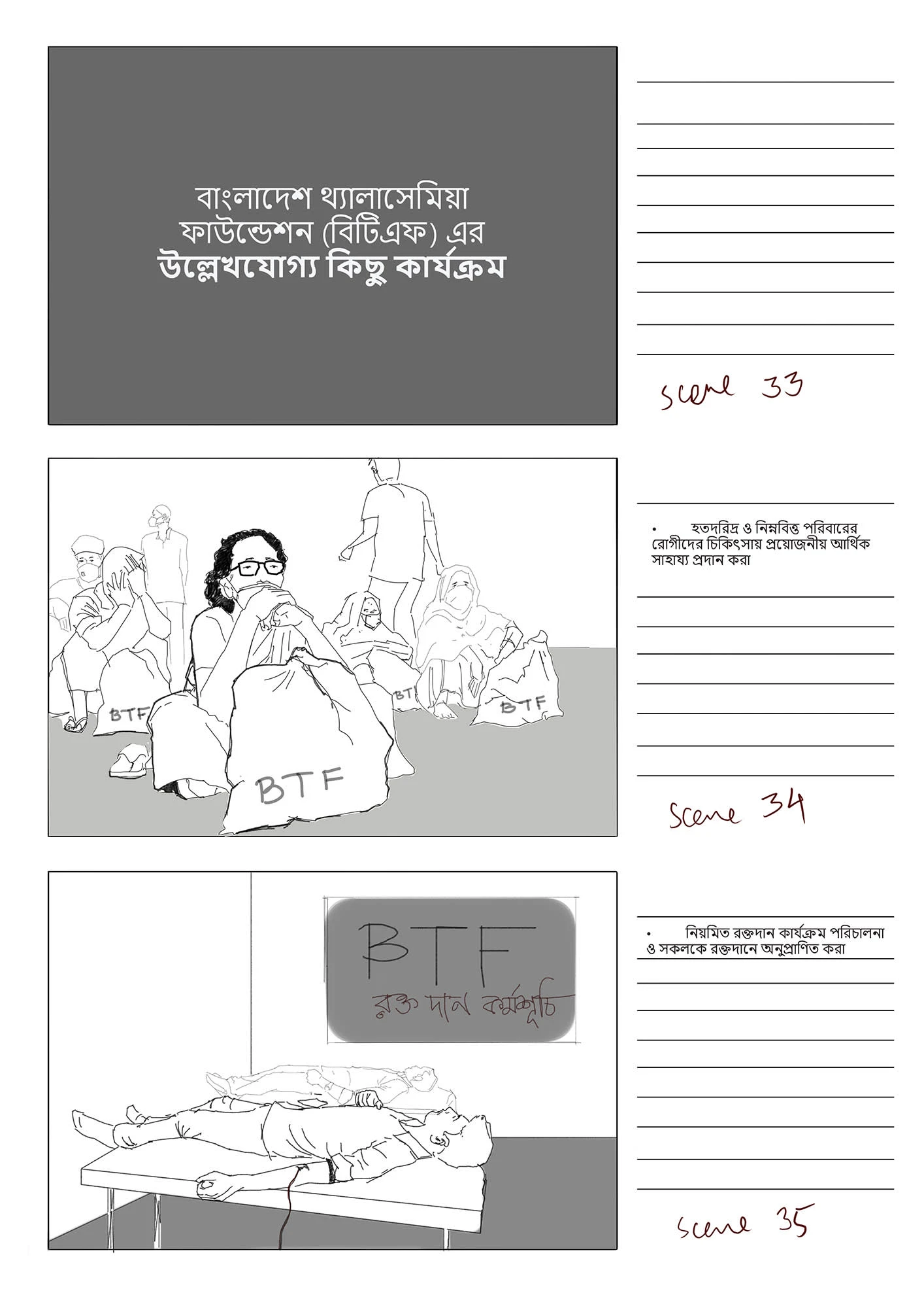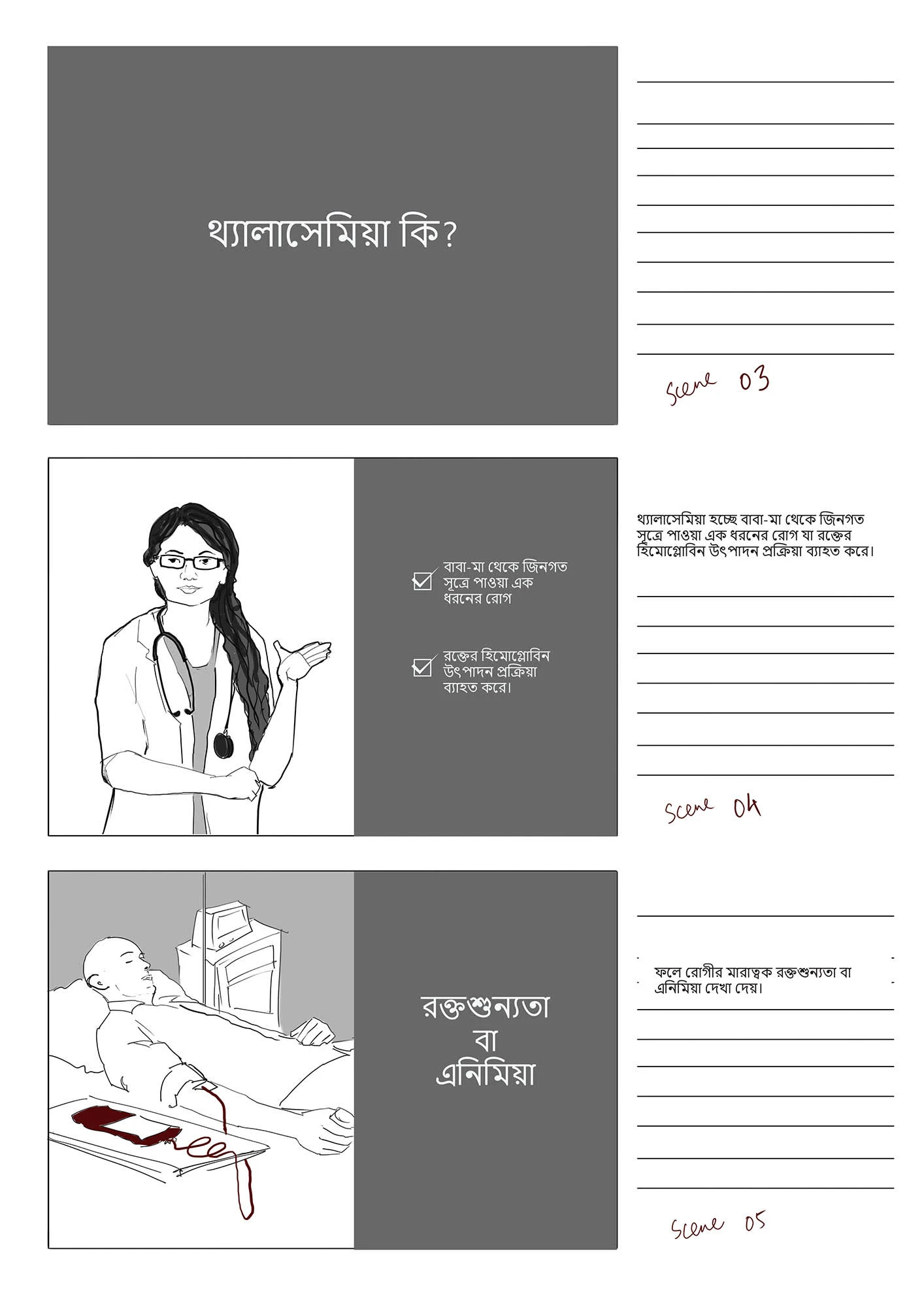 This stoyboard was created for a an audio-visual, funded by Bangladesh Thelassemia Foundation, with the goal to raise awareness of the disease Thelassemia.