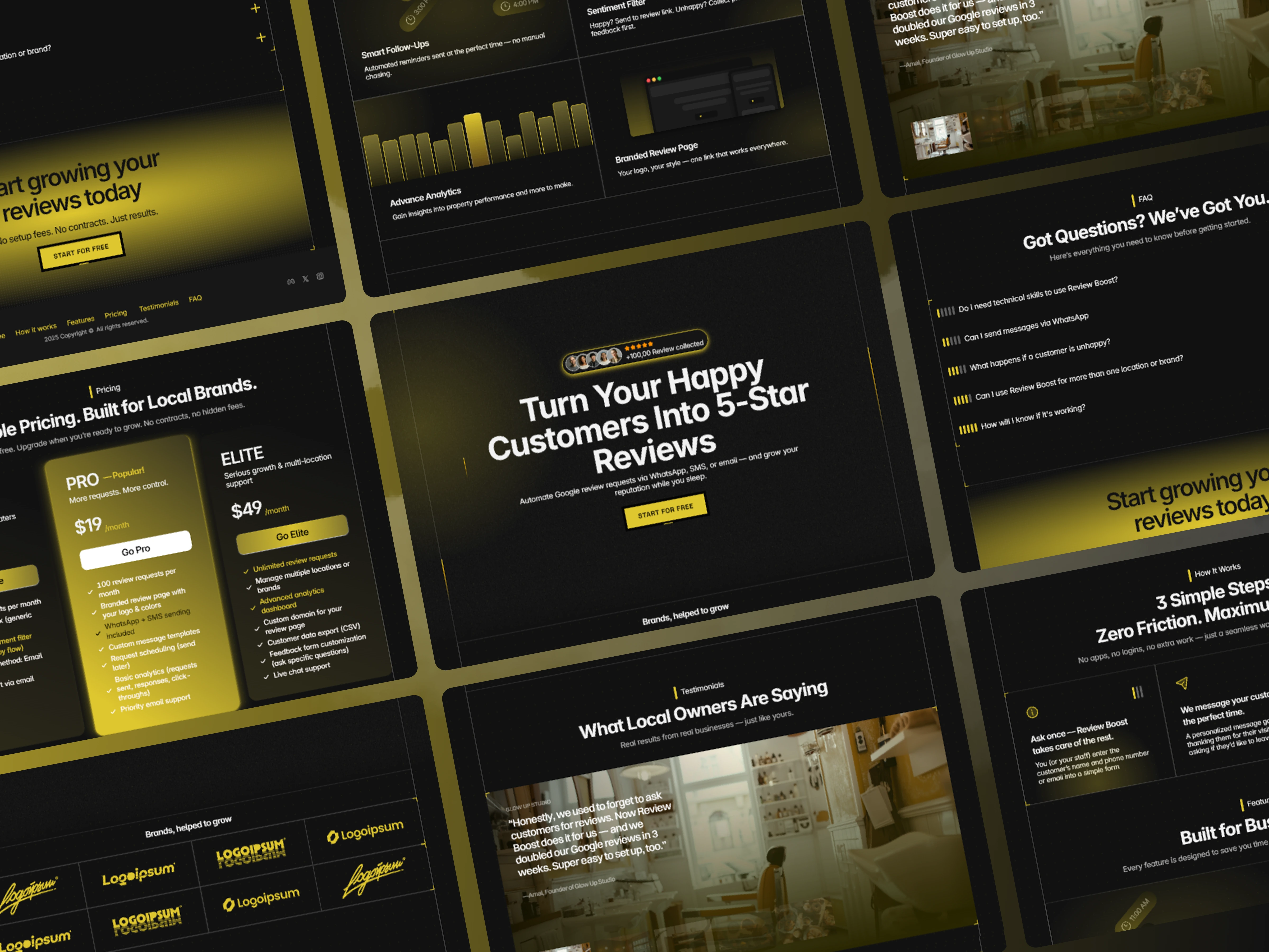 Clear and bold hero — Headline “Turn Your Happy Customers Into 5-Star Reviews” paired with a direct CTA immediately communicates value.