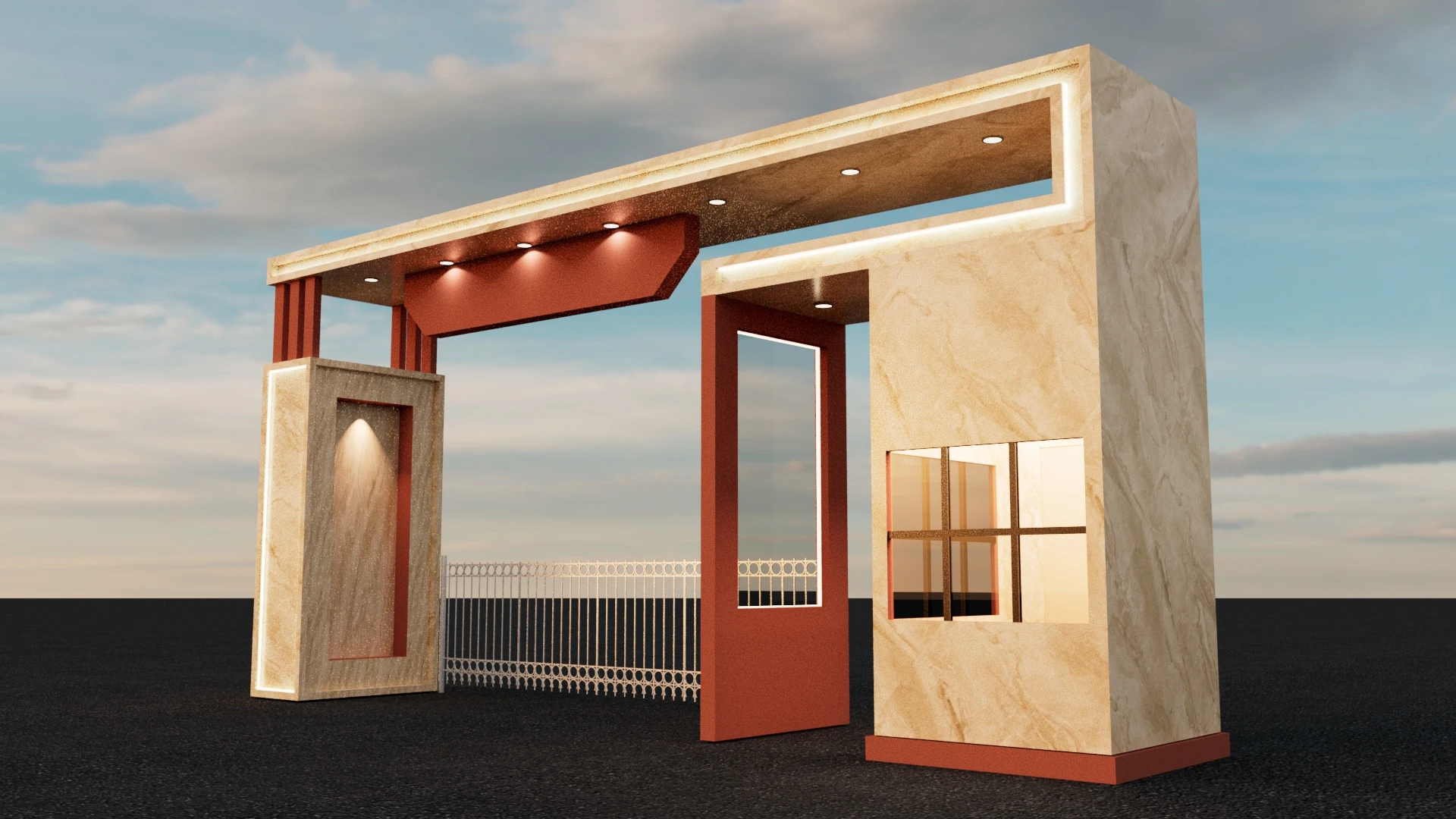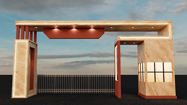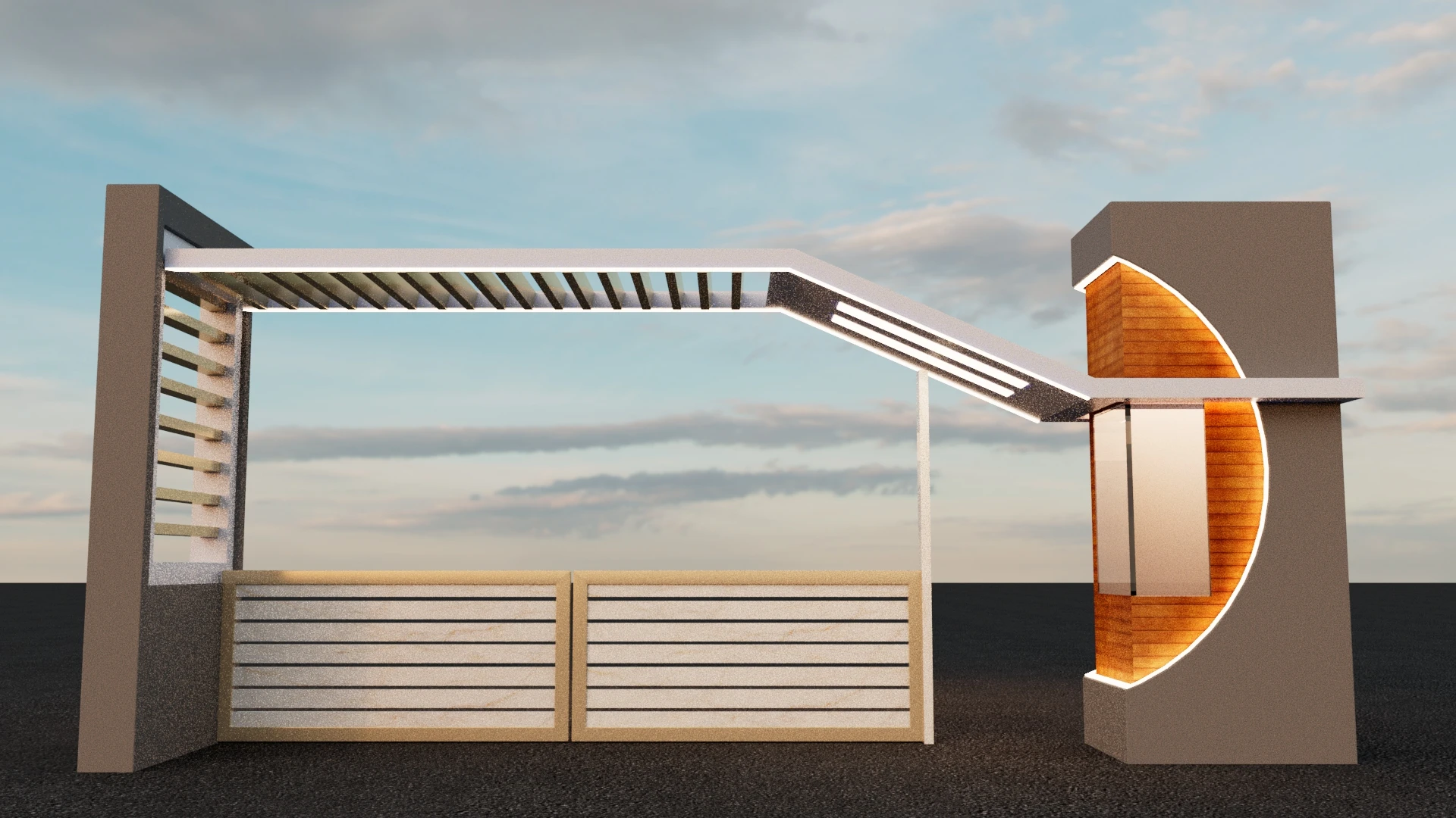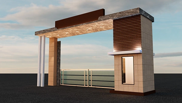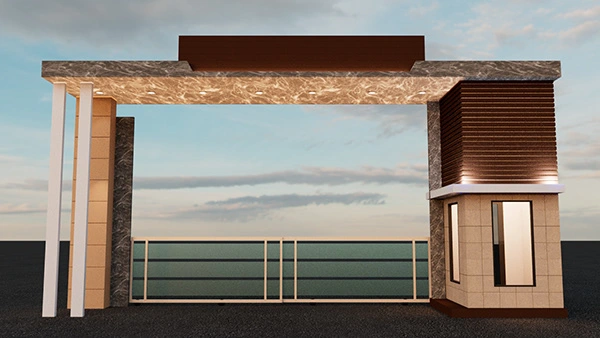 3D-designed society gate concepts blending modern aesthetics with security—featuring sleek materials, ambient lighting, and customizable nameplates.