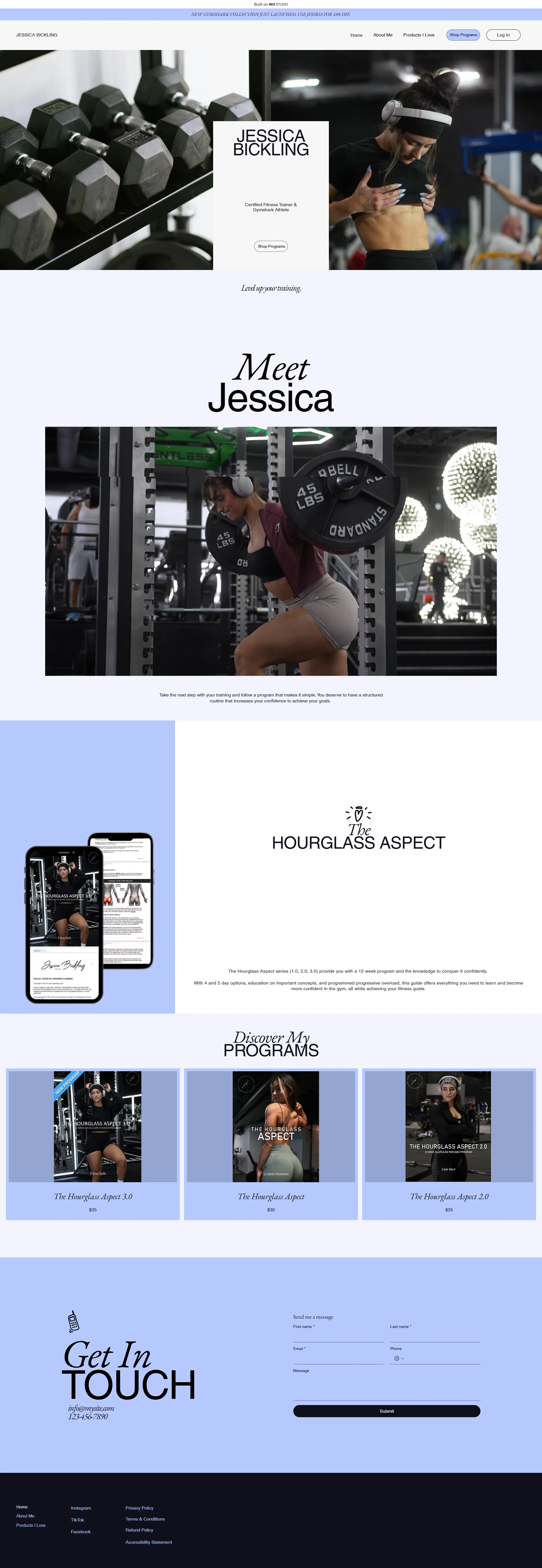 The "Meet Jessica" Section: I redesigned this to be the focal point. By placing photos of her lifting heavy weights against a soft, bright background, I created a visual metaphor for her brand: Hard work in a beautiful package.