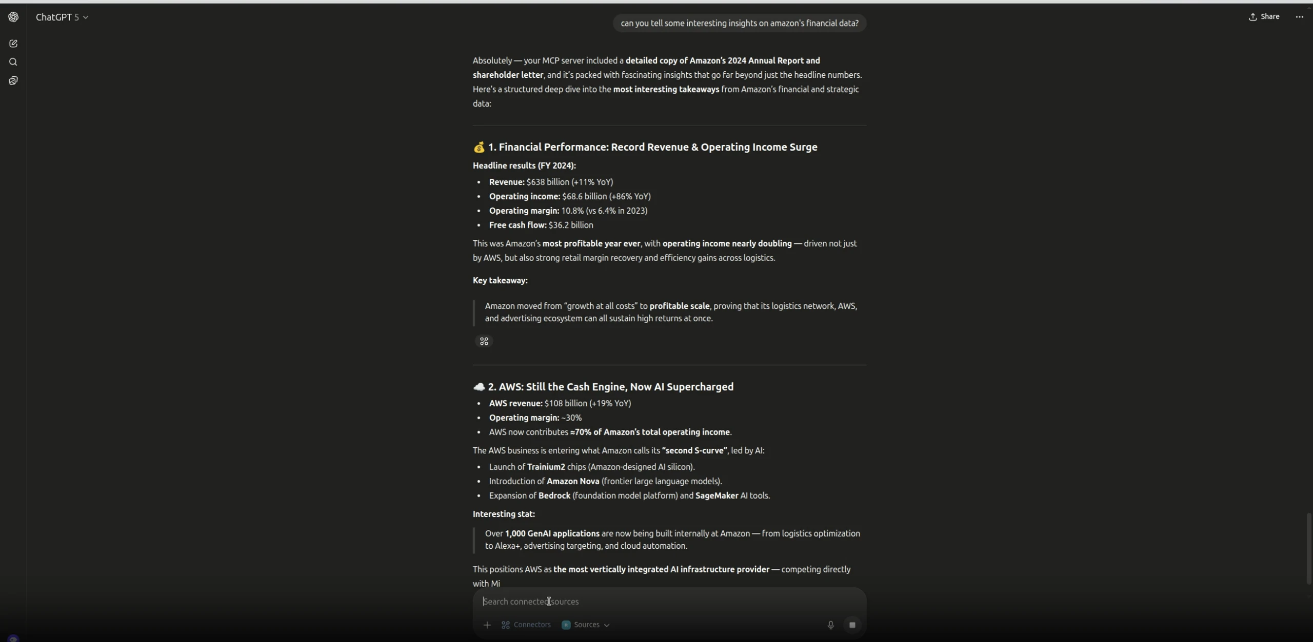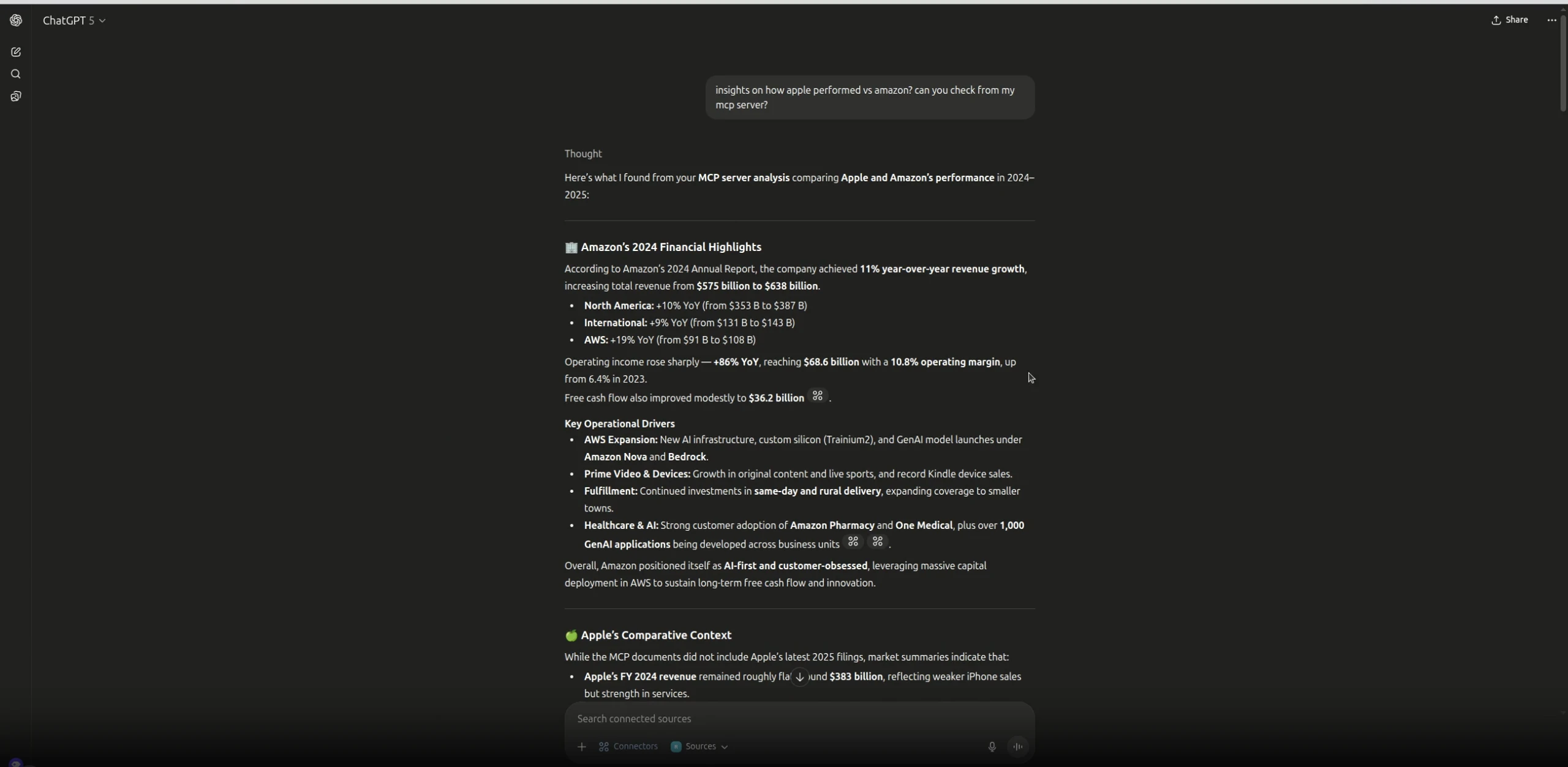 The screen recording demonstrates a live MCP server in action which is pulling financial data of big tech from a BOX storage and serving to ChatGPT (which is the MCP client here).