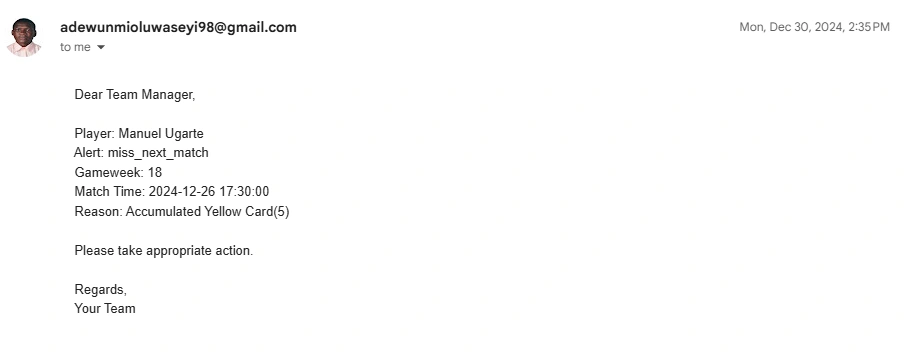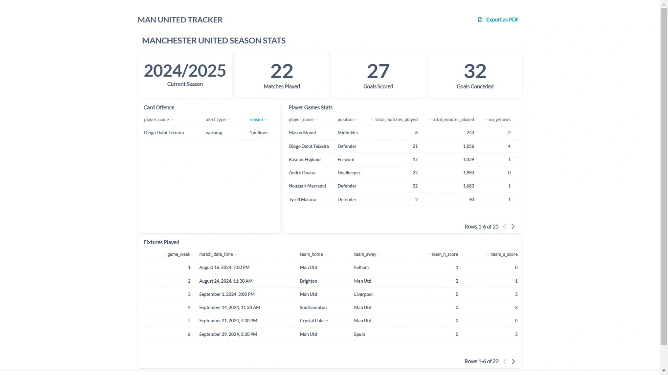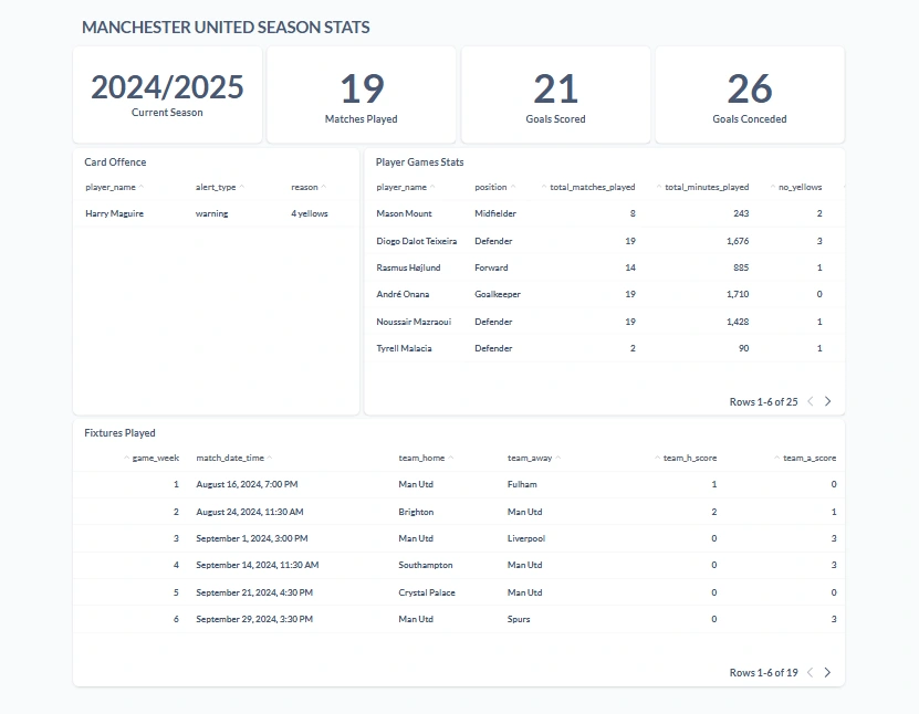 This project aims to track and manage the accumulation of yellow and red cards by players and officials during a competition. Leveraging the FPL API, the system collects data and stores it in a PostgreSQL database. Airflow orchestrates the data pipeline, Docker ensures containerized deployment, and Metabase provides visualization.