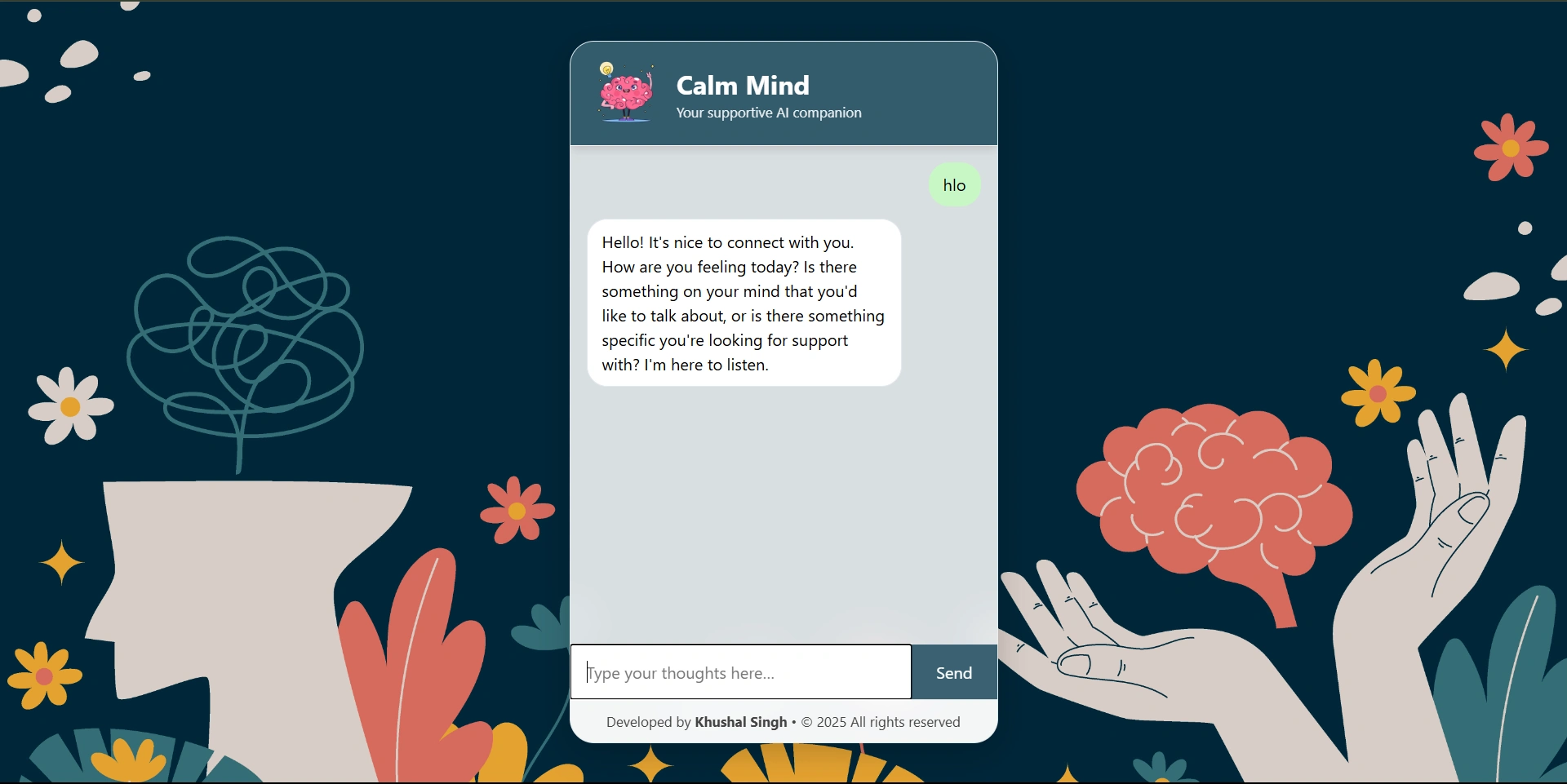 CalmMind is a gentle, empathetic, and privacy-focused mental health web companion powered by AI. It provides supportive conversation, coping strategies like deep breathing or affirmations, and encourages users to seek professional help when needed — all with a calming user interface.