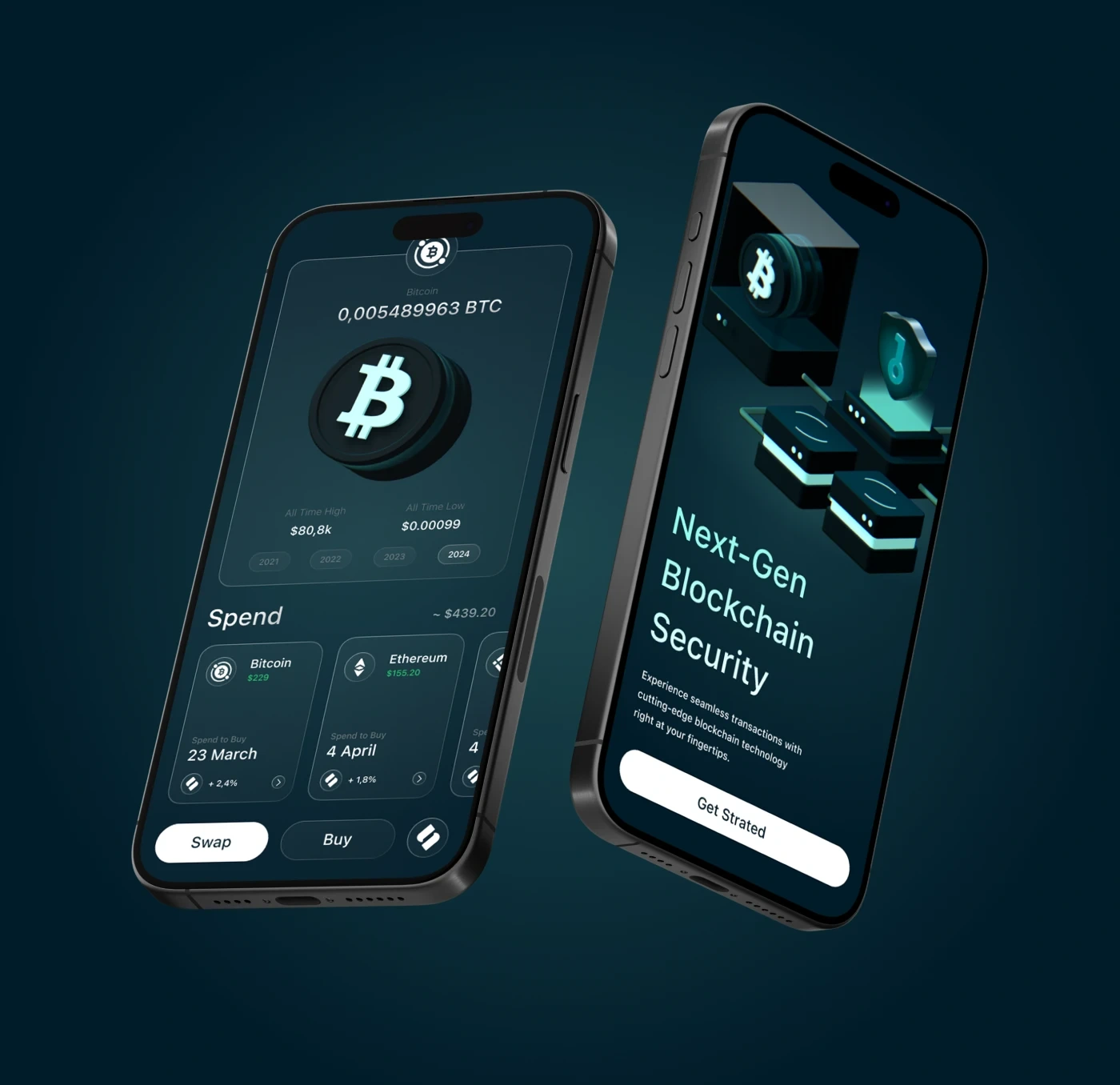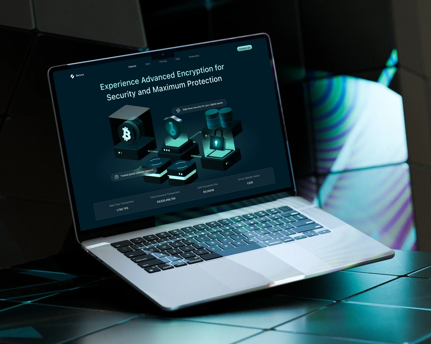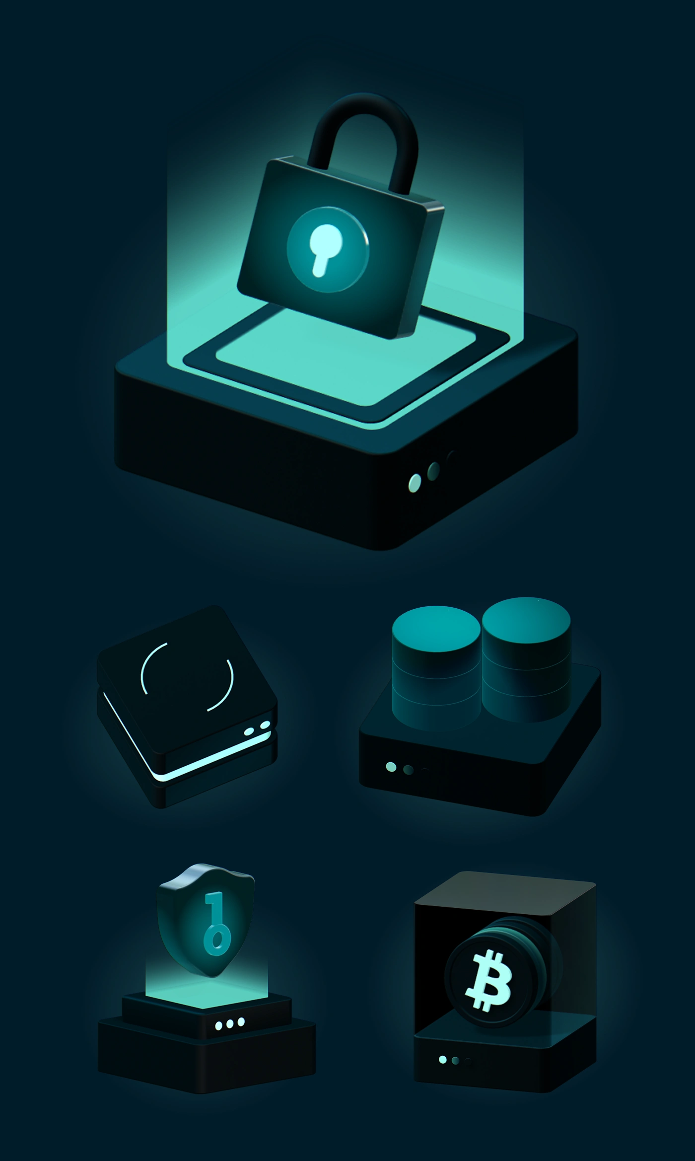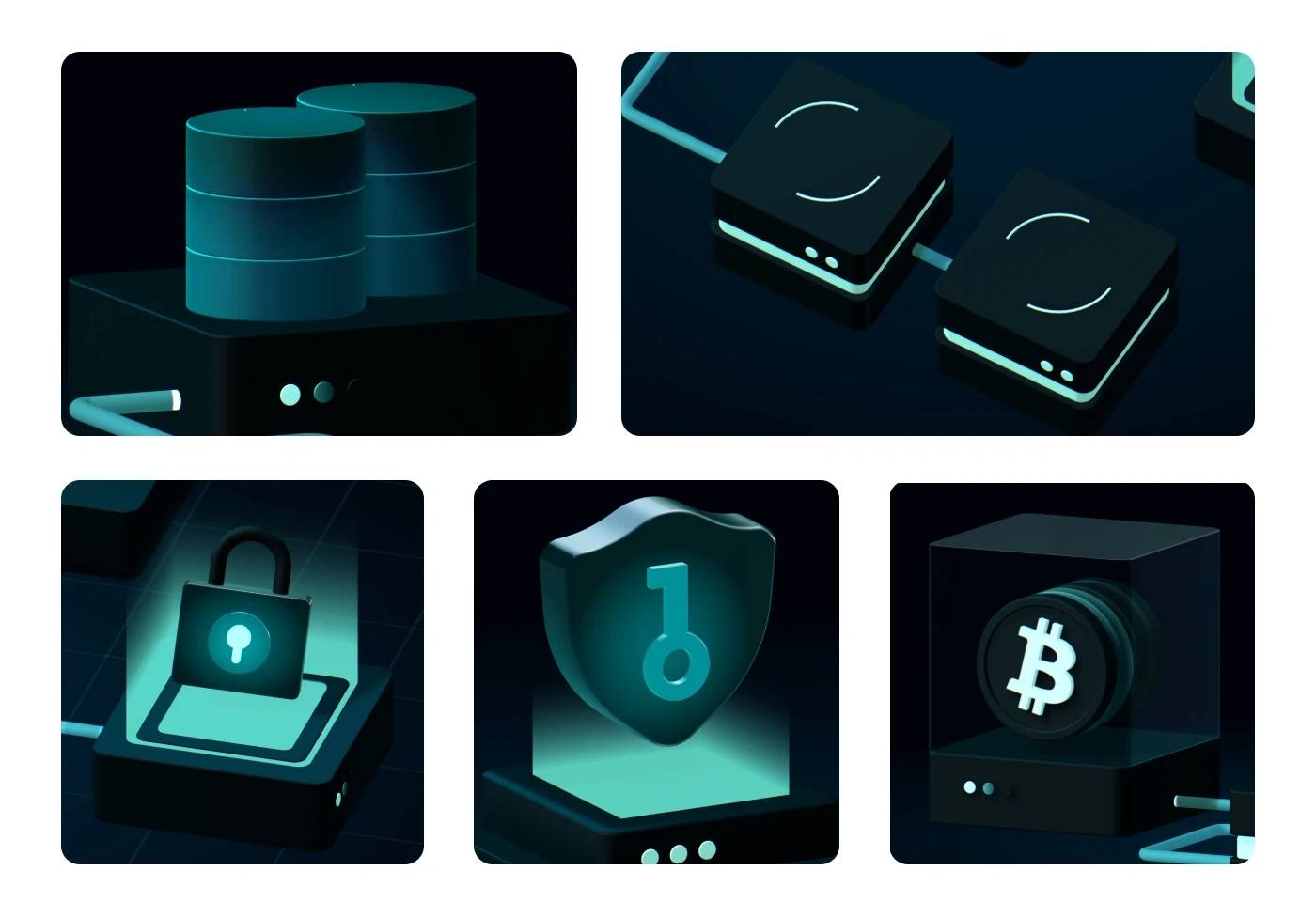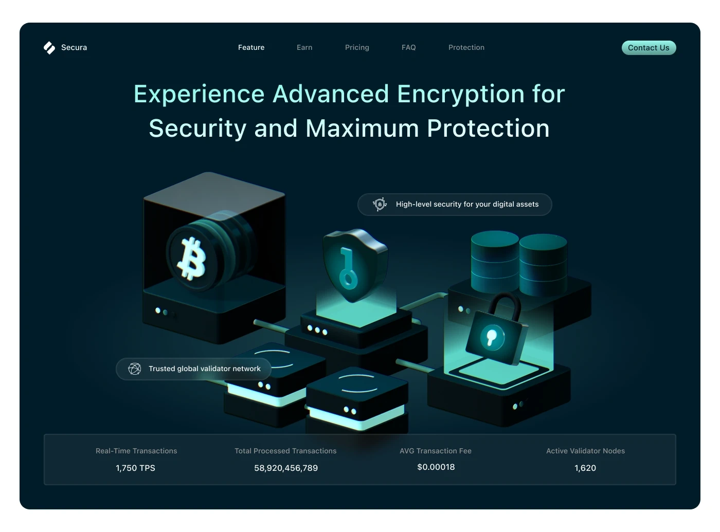 – Animated 3D lock, Bitcoin symbol, and validator nodes