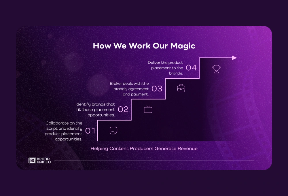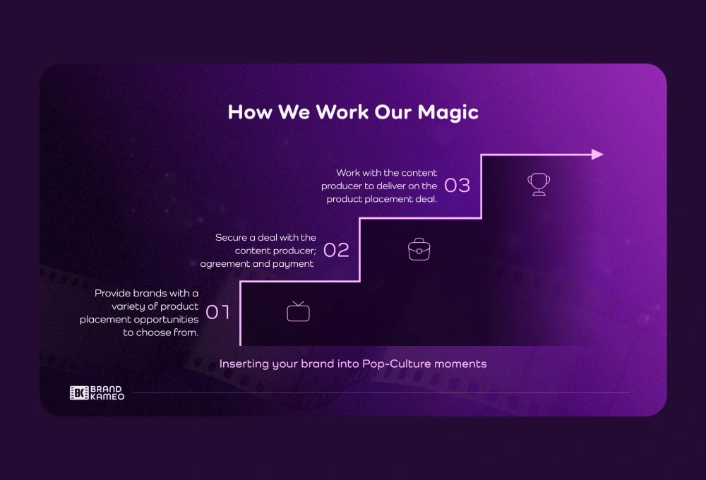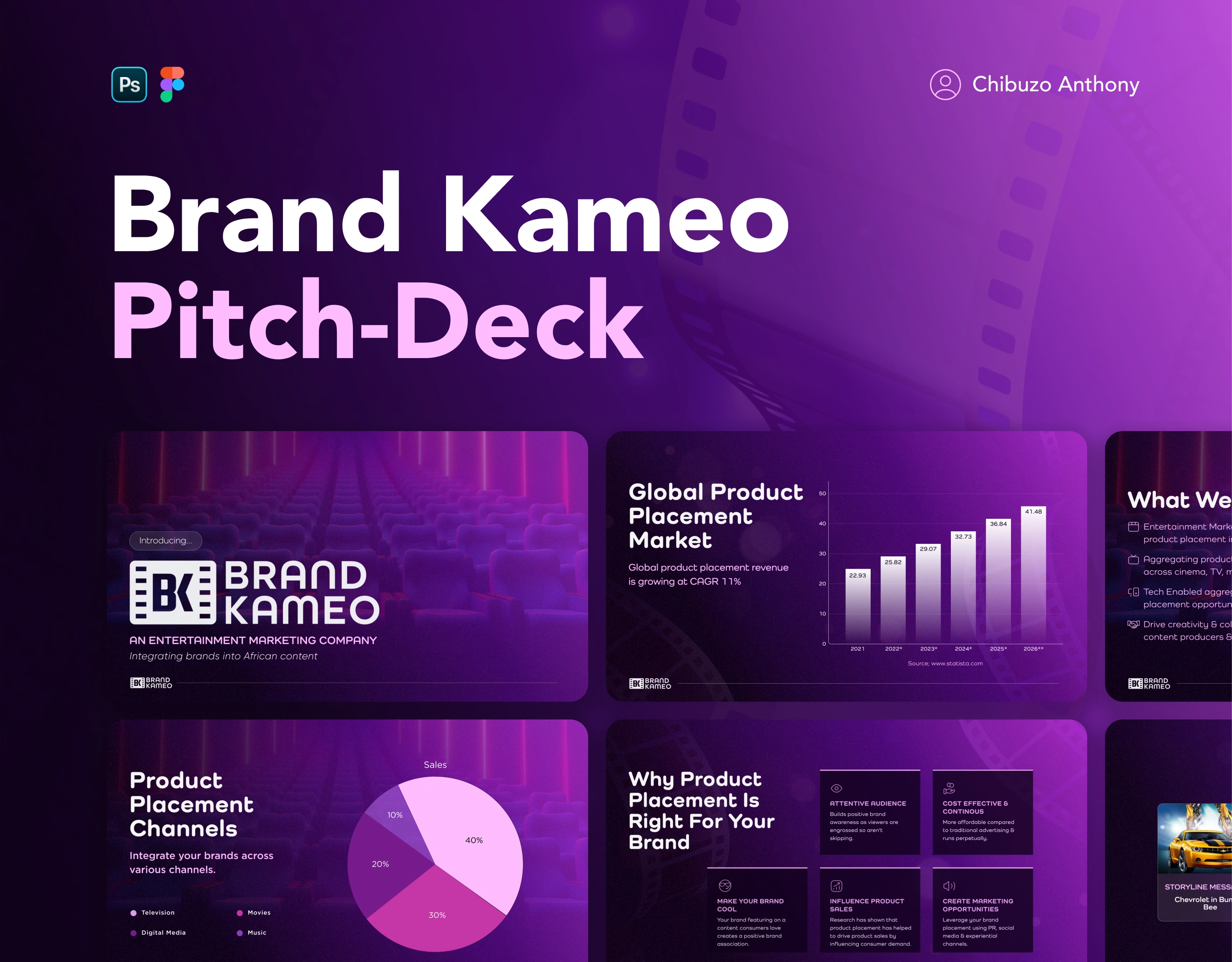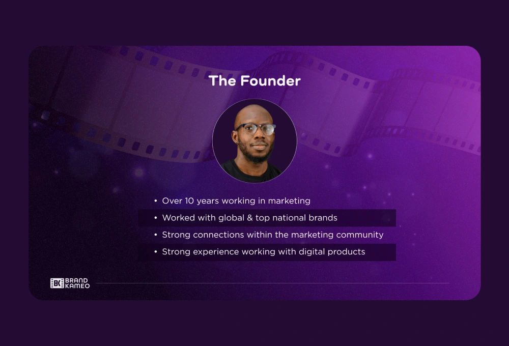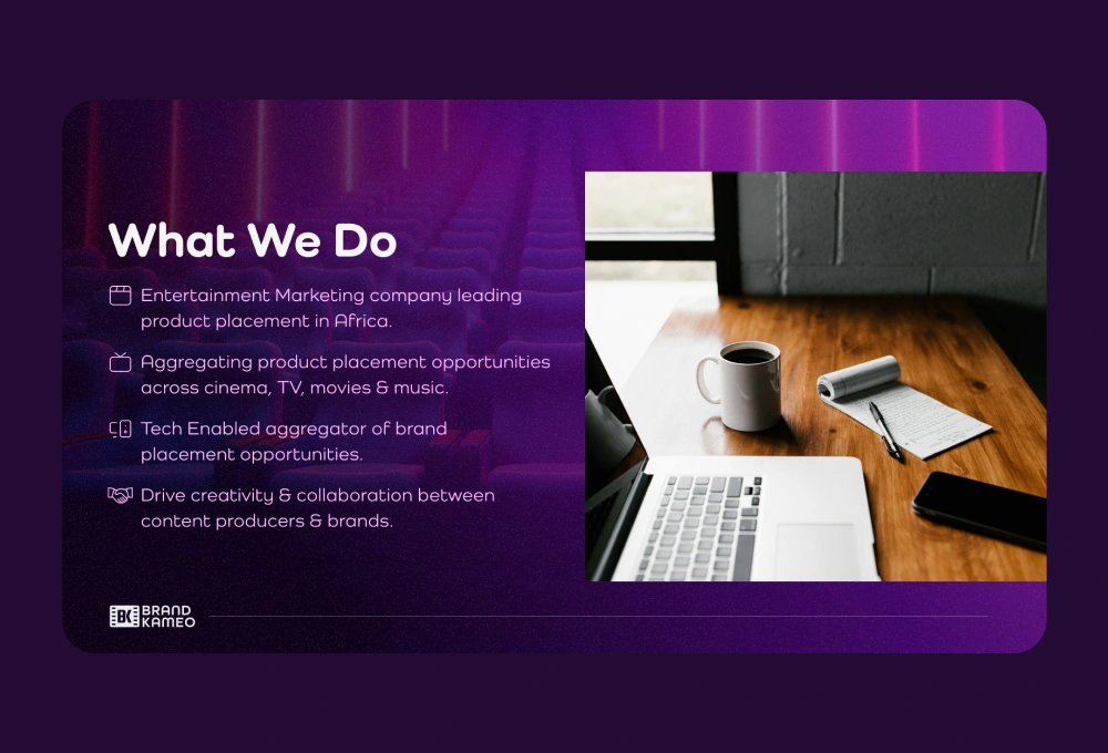 A pitch deck presentation design for a media advertising brand that markets businesses mostly on movies and music videos.