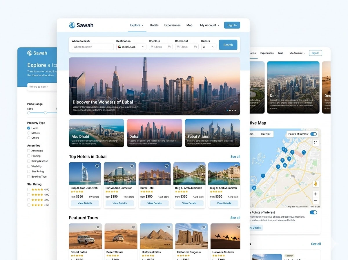 Sawah is a travel & tourism platform built for an international client in the Middle East, designed to help travellers discover cities — with all their facilities, attractions, and accommodations in one place.