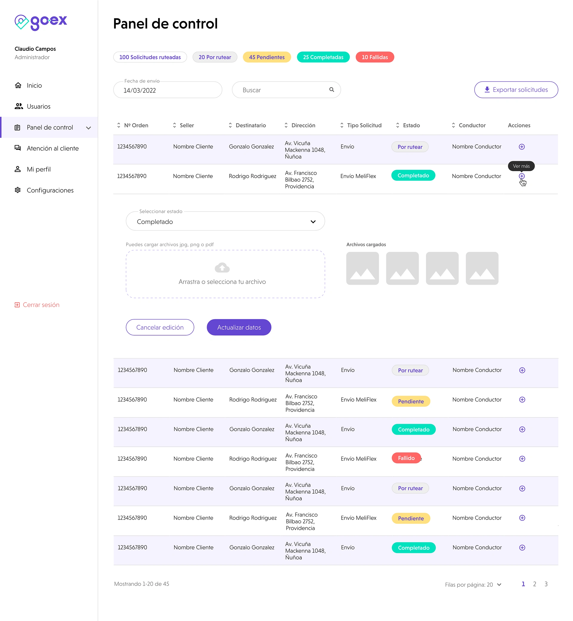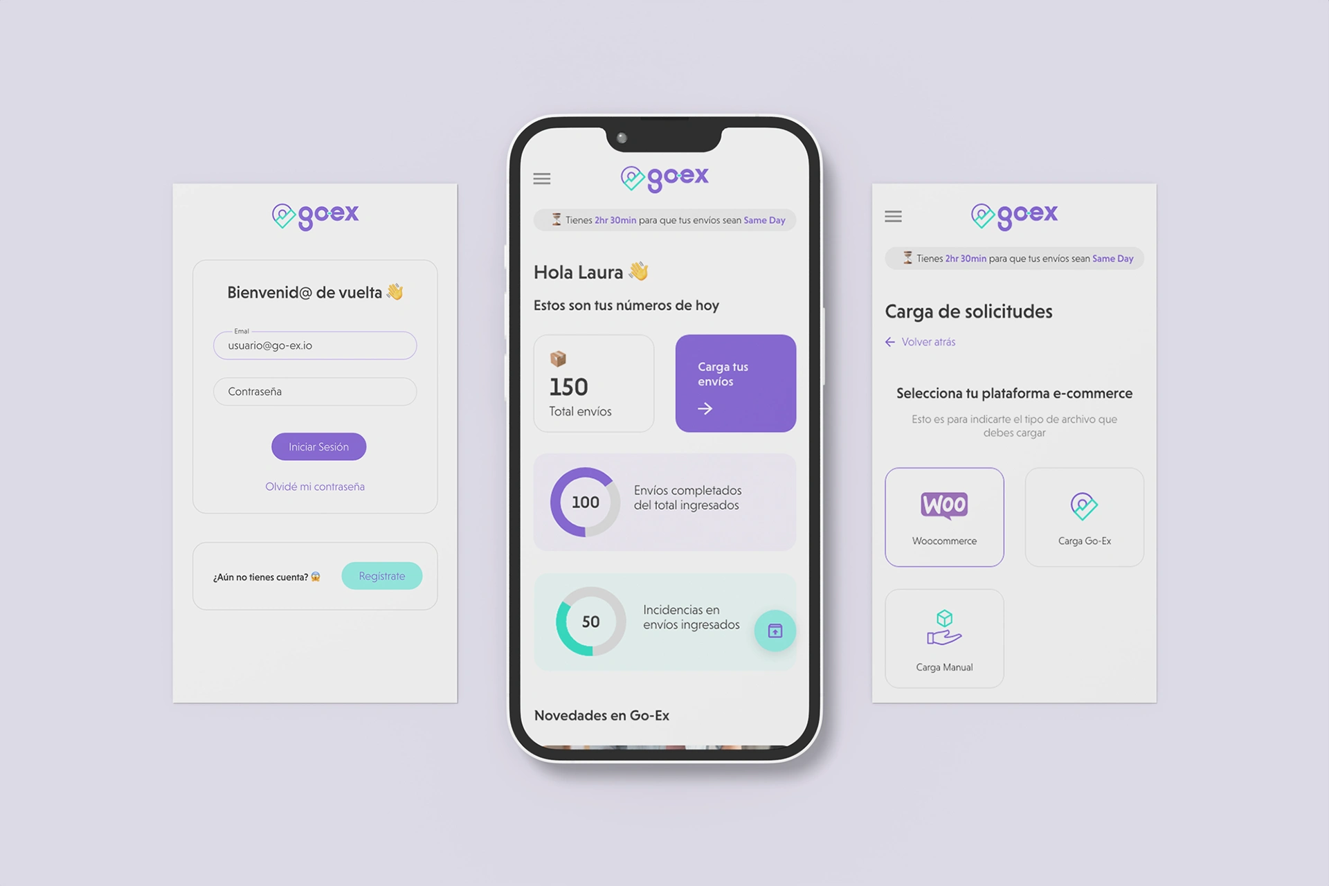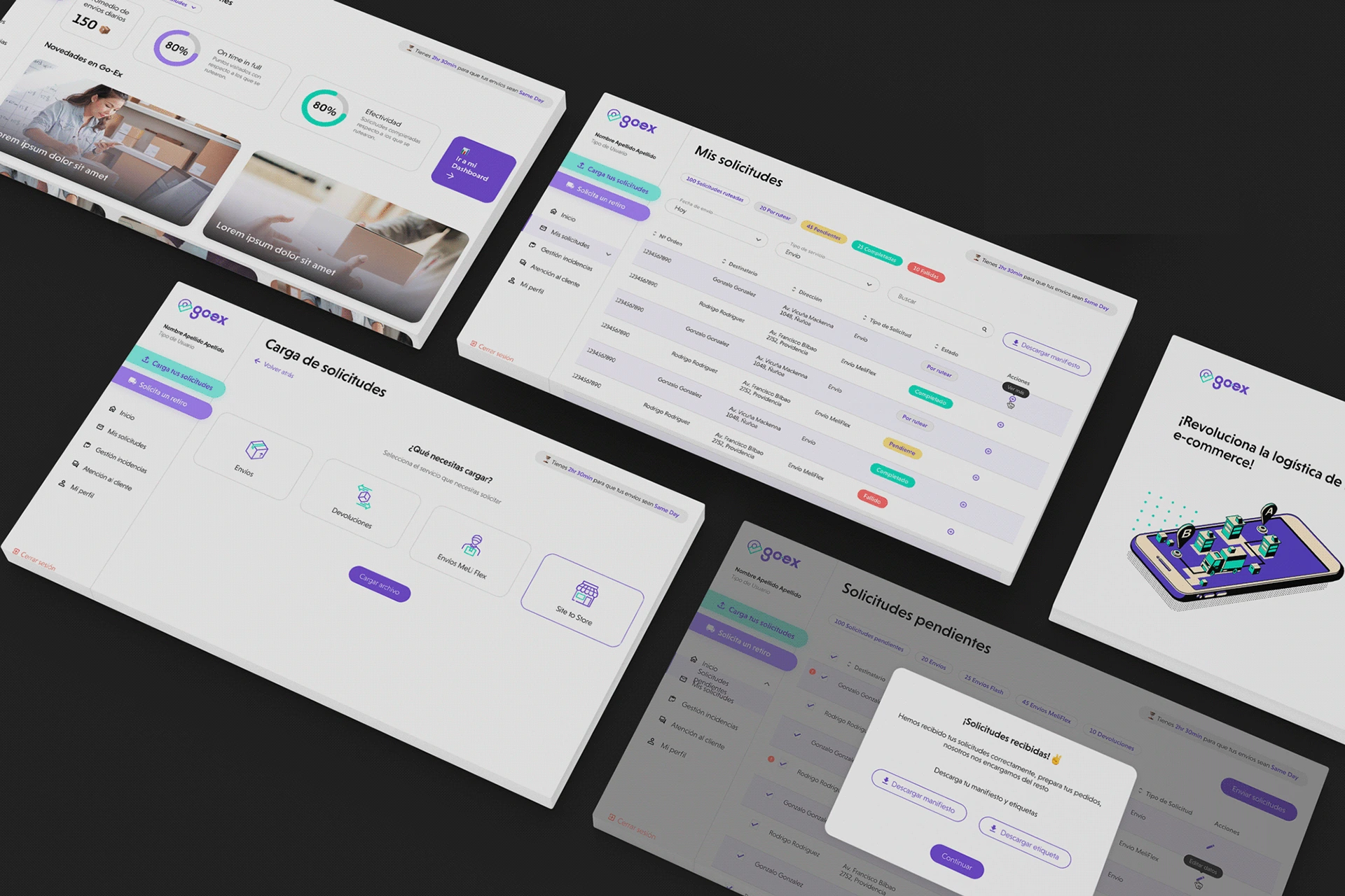 GoEx es una empresa de logística de envíos para pequeñas y grandes tiendas. El objetivo fue crear una plataforma donde se pudieran gestionar las solicitudes de despacho, en la cual los clientes pudieran subir sus solicitudes de manera sencilla y los administradores pudieran acceder a esta información en un par de clicks.