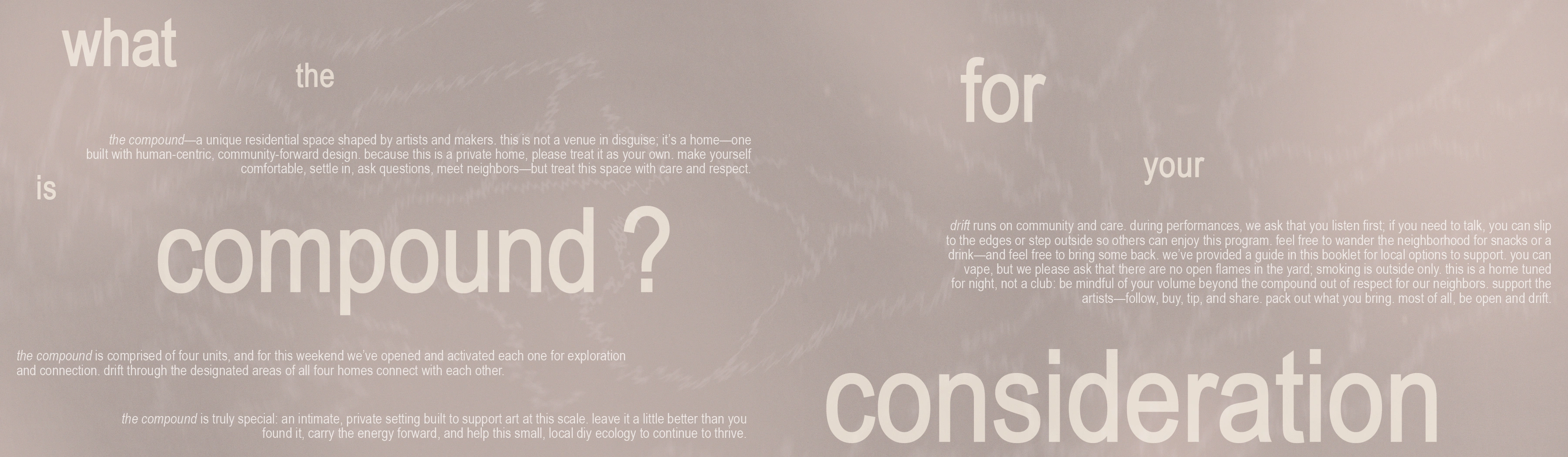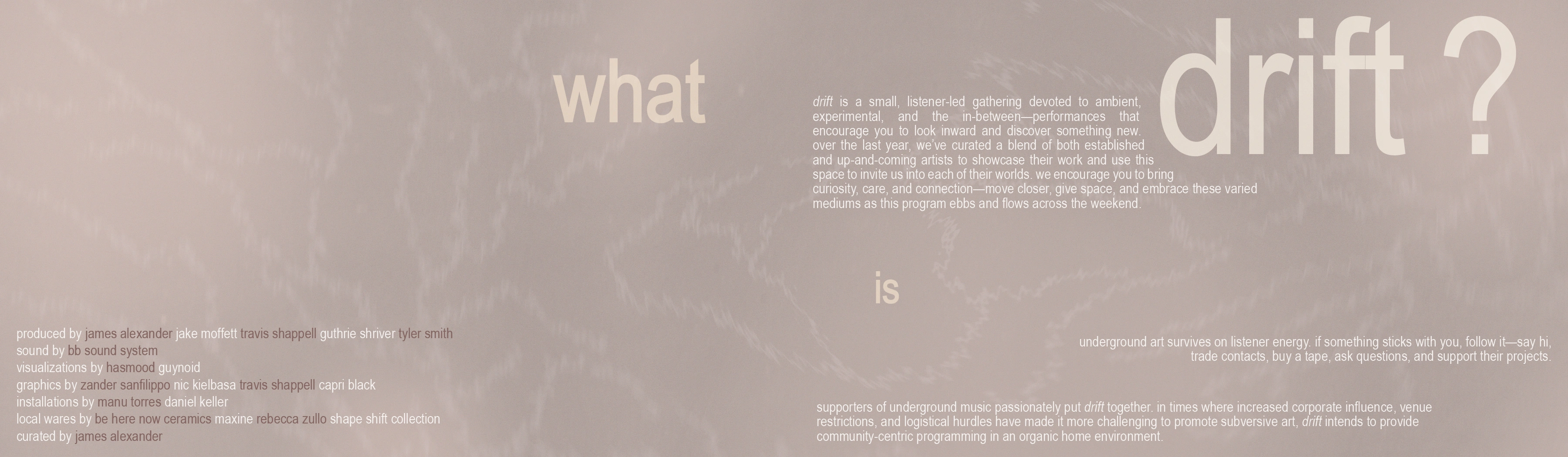Drift is a small, listener-led music experience devoted to ambient and experimental performances that encourage listeners to look inward and discover something new. The producers curated a blend of both established and up-and-coming artists to showcase their work and invite us into each of their worlds. Drift was about cultivating community through curiosity, care, and connection.