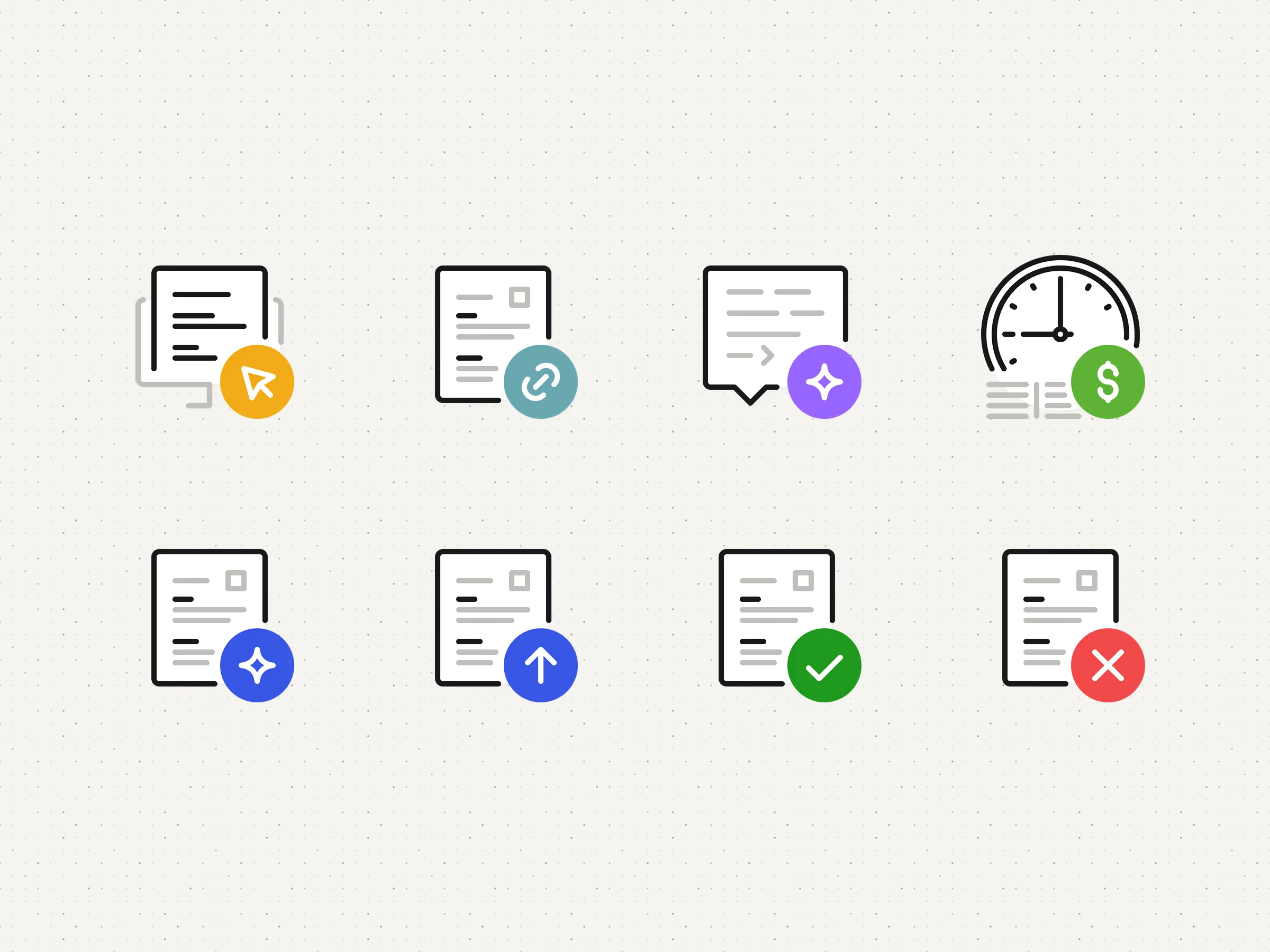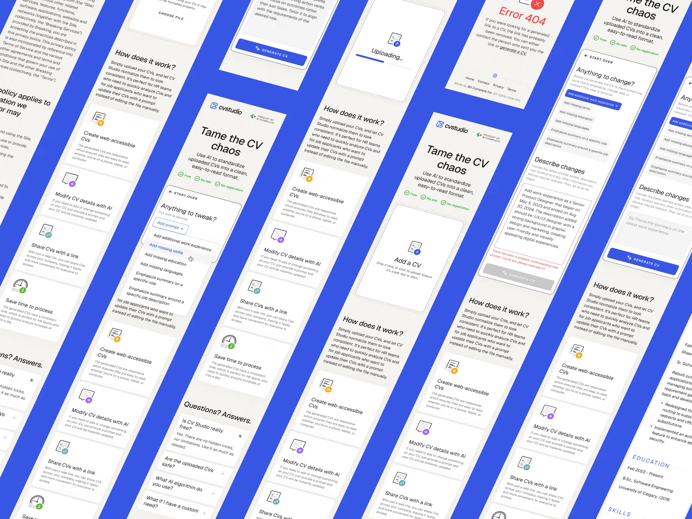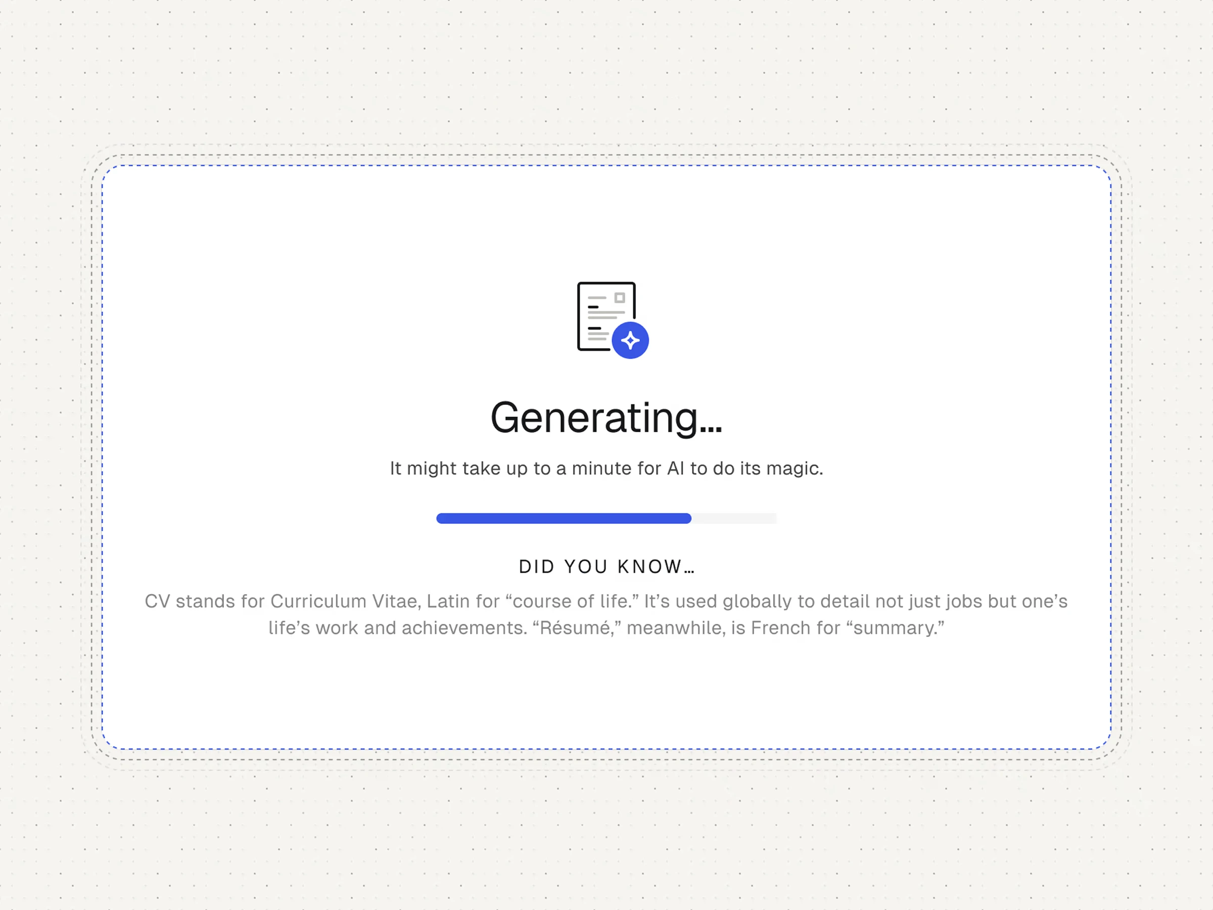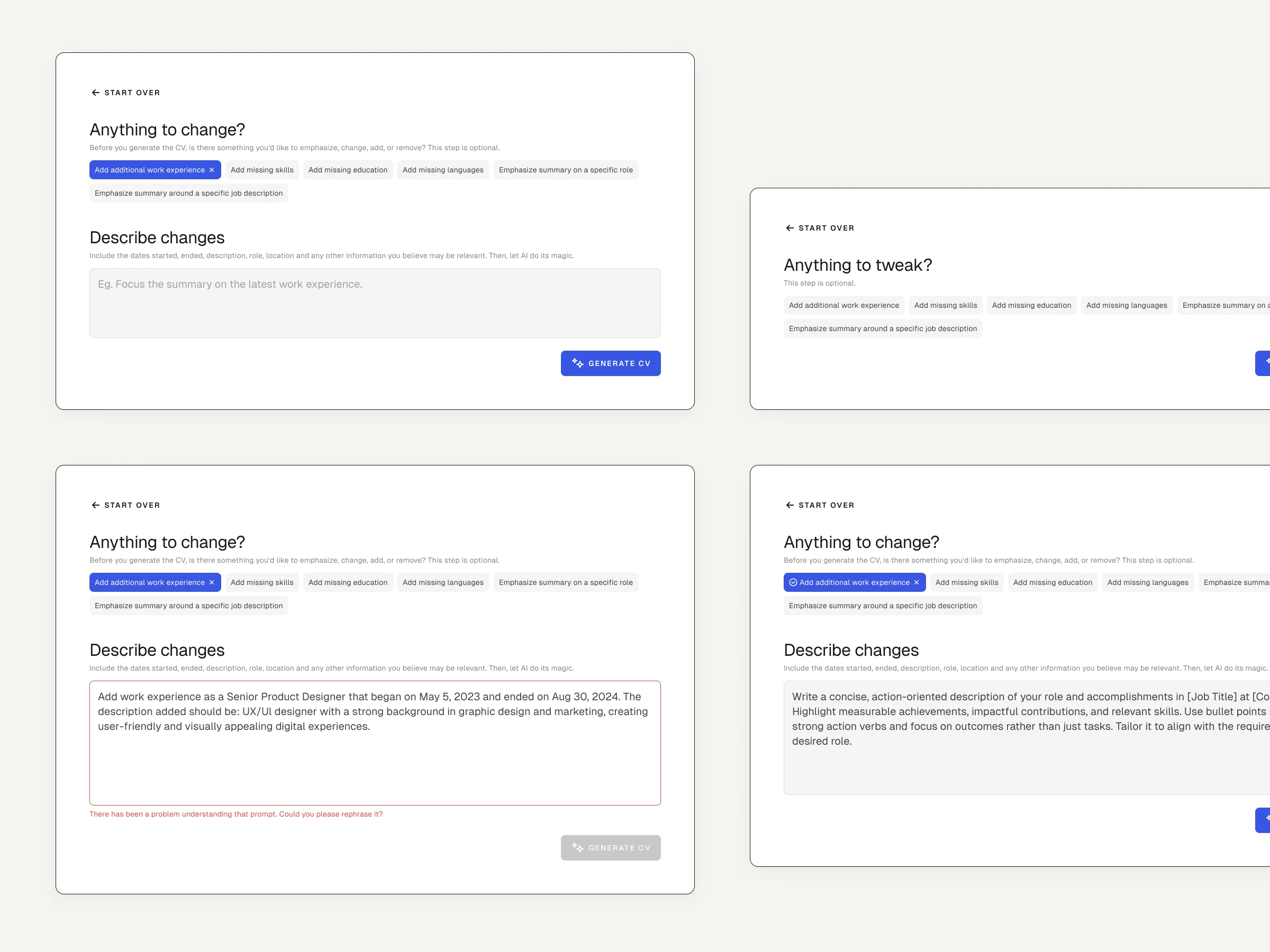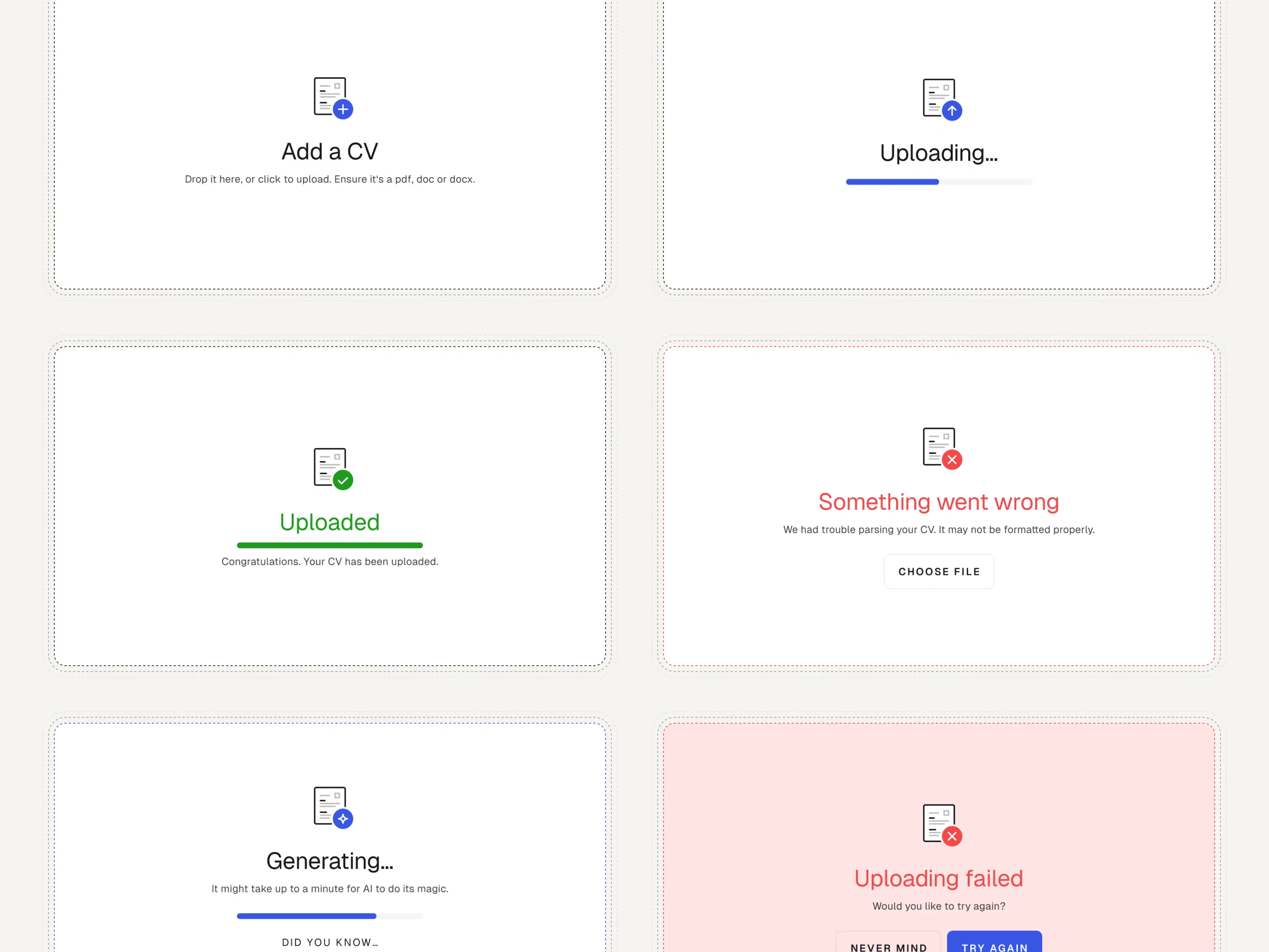 Though the product technically had just three primary screens, each carried its own cluster of possible states. Take the uploader alone: idle, uploading, parsing, generating, canceling, error handling, success—and variations within each. And that was before we considered what happens once the system interprets user input or an unpredictable AI prompt.