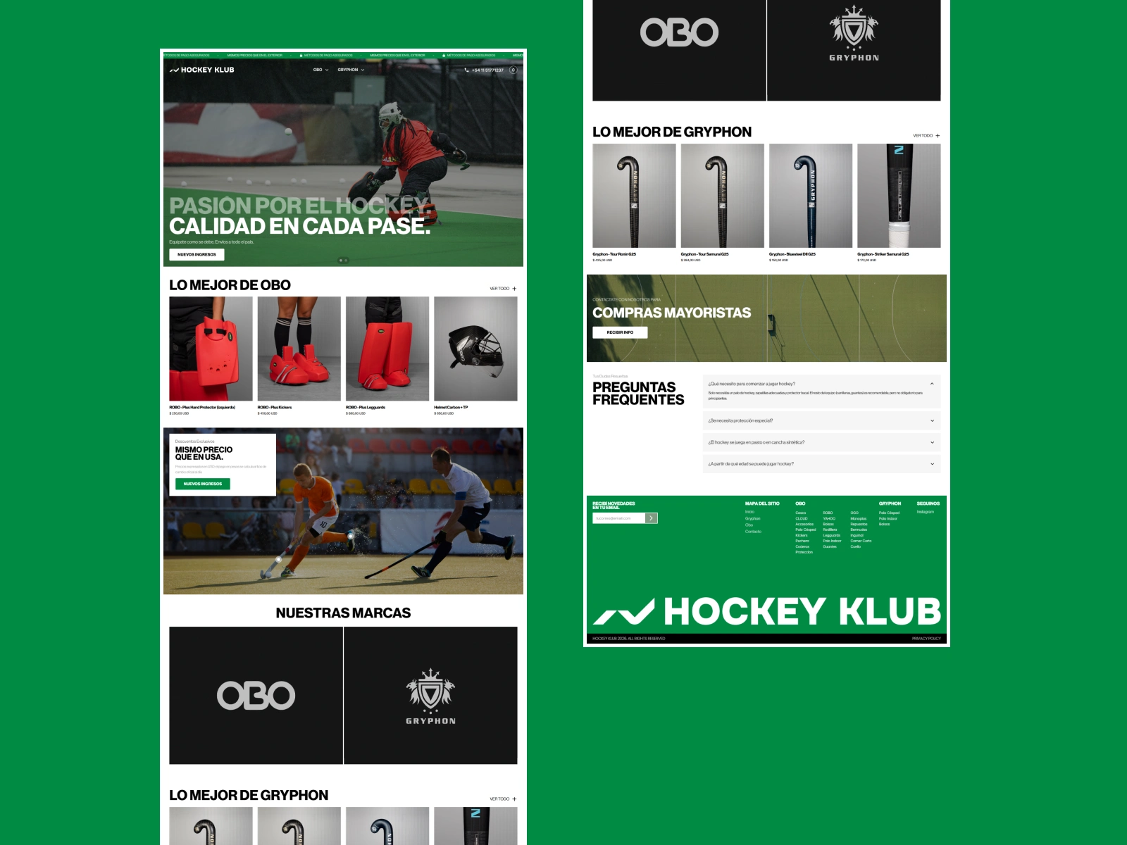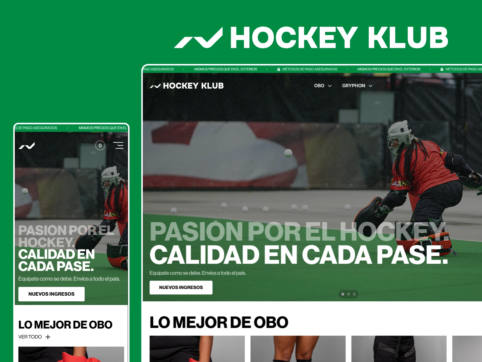 Hockey Klub is an Argentinian field hockey equipment retailer specializing in OBO and Gryphon gear. They needed a clean, modern ecommerce site that could handle a large product catalog across multiple brands and categories while offering a seamless shopping experience with prices in both USD and local currency.